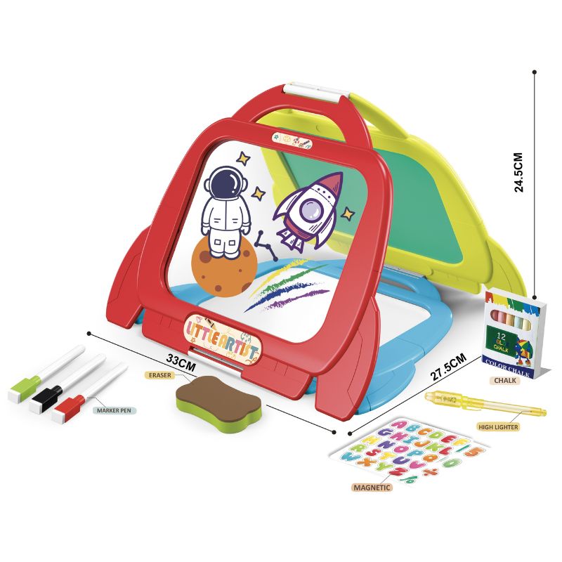 Ezzel a 4 az 1-ben rajztáblával a gyerekek akár órákon keresztül alkothatnak kedvükre. A 3 oldalú rajtábla egyik oldala fluoreszkál, így a gyerekek a dobozban rejlő fluoreszkáló szövegkiemelővel rajzolhatnak rá szebbnél szebb képeket; másik oldala krétás táblaként vagy fehértáblaként funkcionál, amelyre a mellékelt krétákkal és filctollakkal rajzolhatnak a lurkók, harmadik oldala pedig átlátszó.A csomag mágneses betűket és számokat is tartalmaz, így a kicsik játékosan ismerkedhetnek meg a számok és a betűk világával. A tábla a mellékelt szivaccsal könnyen letörölhető, méretéből adódóan pedig a gyerekek magukkal vihetik a nyaralásra vagy a nagyihoz - hiszen sohasem lehet tudni, hogy hol szállja meg az ihlet a kis rajzolni vágyókat.