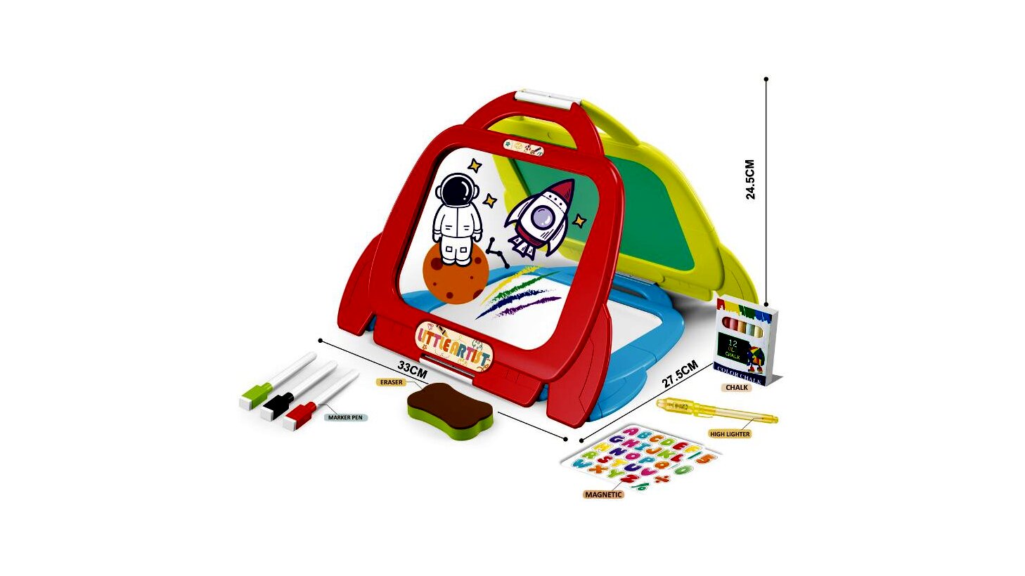 Tartalom: 1 db 3 oldalú rajztábla, 3 db táblafilc (piros, fekete, zöld), 1 db szivacs, 12 db színes kréta, 1 db szövegkiemelő a fluoreszkáló oldalhoz, mágneses betűk és számok.