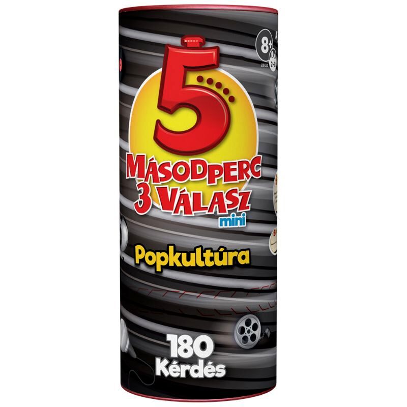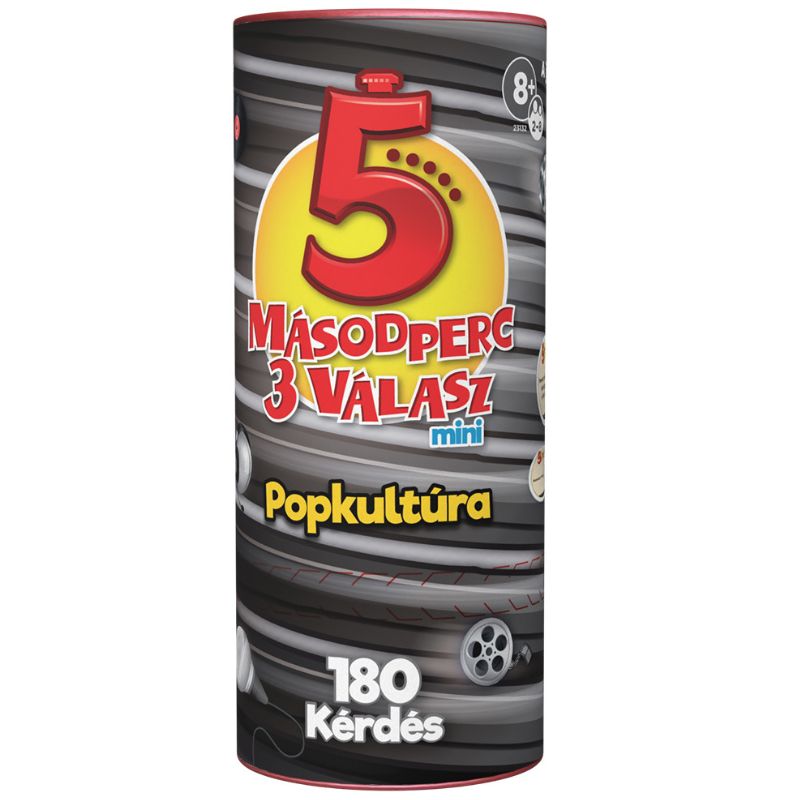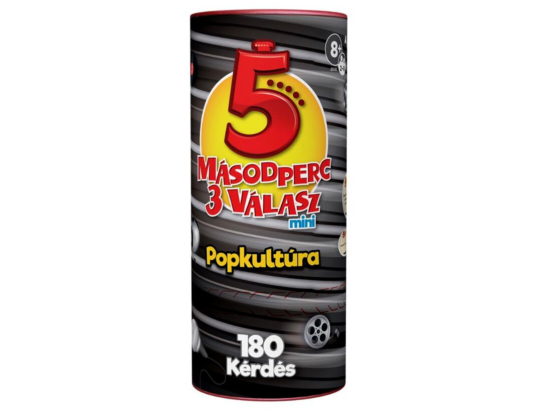 Megérkezett a nagy népszerűségnek örvendő 5 másodperc 3 válasz társasjáték mini változata, amit kicsik és nagyok könnyen magukkal vihetnek a társasos estre, a kirándulásra vagy a nyaralásra.A Popkultúra kiadás ízig-vérig parti társasjáték, hiszen a kérdéskártyákon filmekkel, zenékkel és más popkultúrával kapcsolatos feladványok szerepelnek. A soron következő játékosnak 5 másodperce van, hogy a feltett kérdésre választ adjon, de lehetősége van arra is, hogy a passz vagy csere kártyákkal kibújjon a válaszadás alól.
