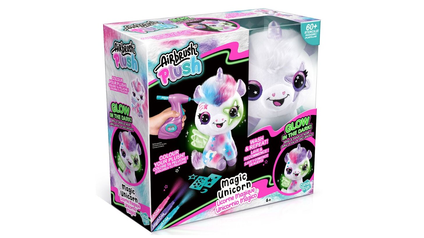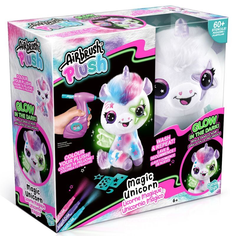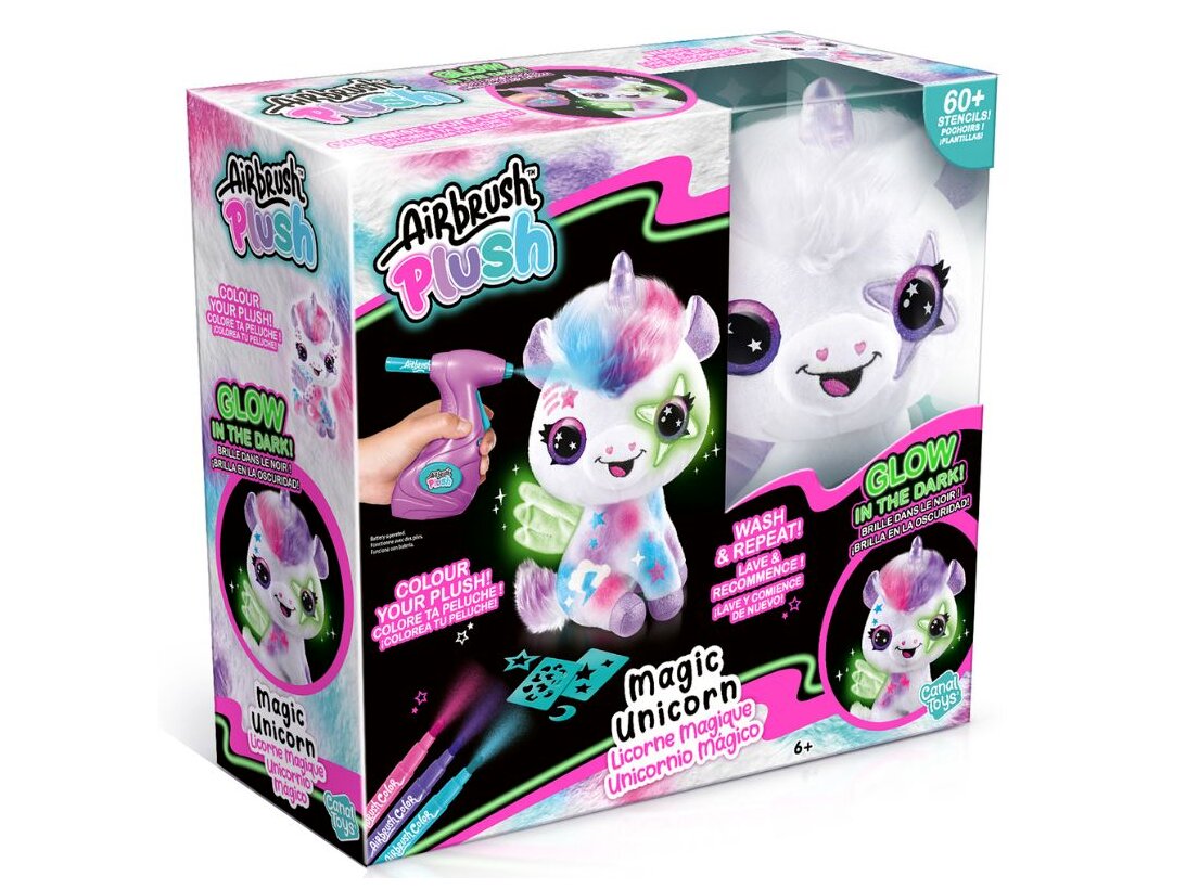 Airbrush Plush: Style 4 Ever sötétben világító, színezhető plüss unikornis. Kimosható, számtalanszor újraszínezhető. Tartalma: 1 db sötétben világító unikornis plüss,1 db festékszóró, 3 db festékszóróhoz való festék (rózsaszín, lila, kék), sablonok (több mint 60 minta), műanyag kesztyű.