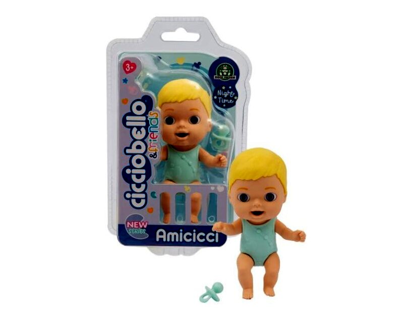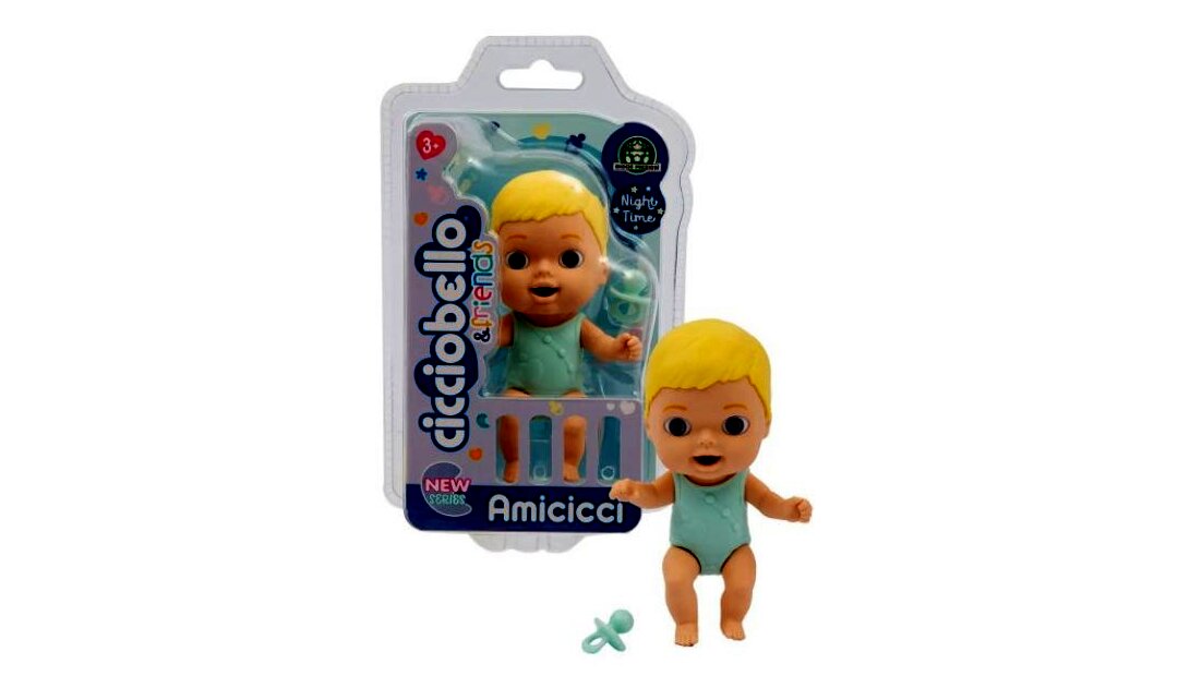 Az alvásidő játékszett egy pizsamás kisbabát és egy cumit is tartalmaz, így a lányok eljátszhatják az esti altatást és a hozzá tartozó rutint.Az Amicicci babák összenyomható, puha gumiból készültek, így valósághű érzetet keltenek megjelenésükkel.