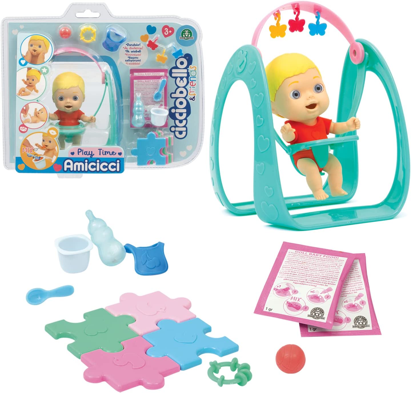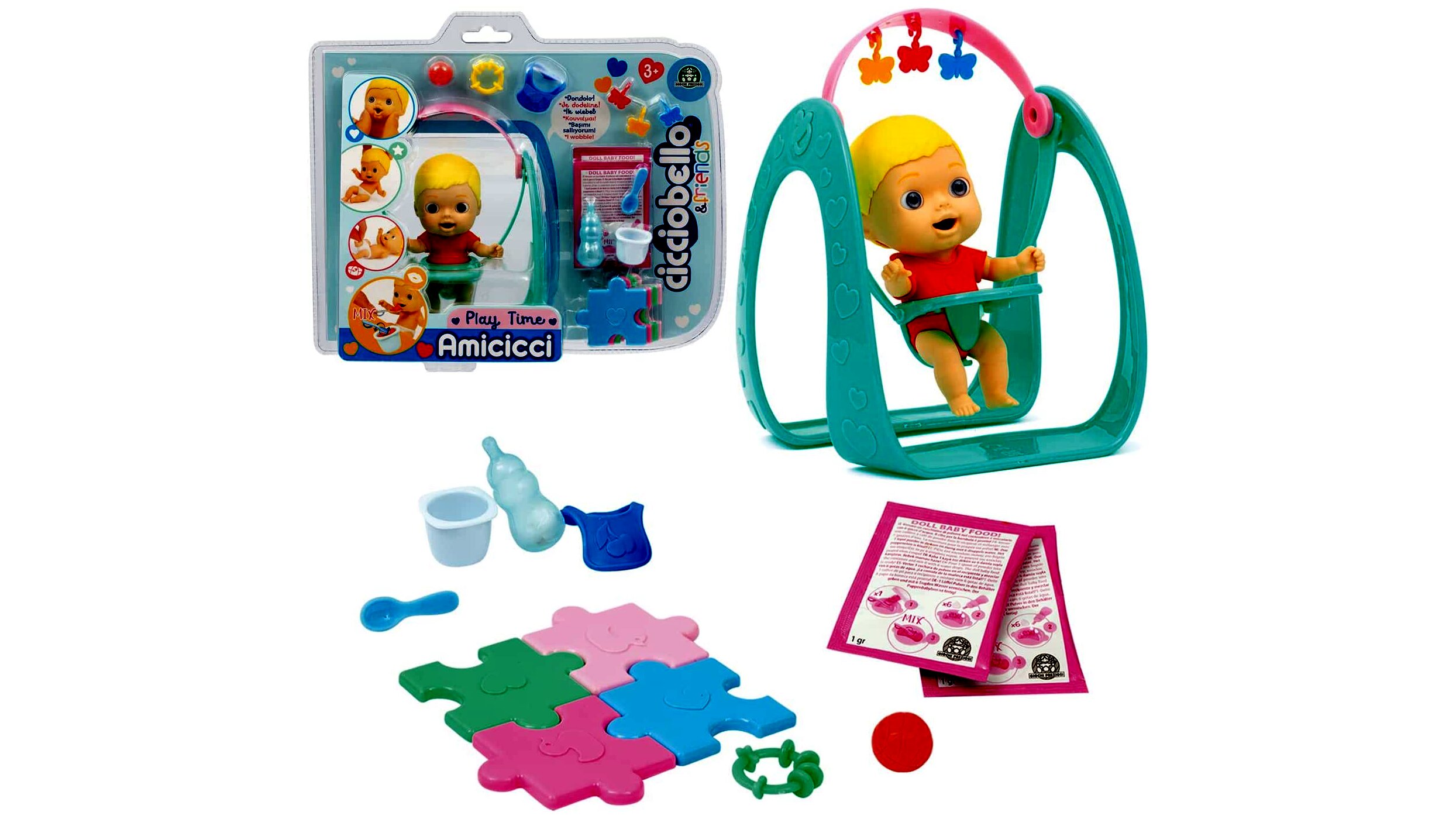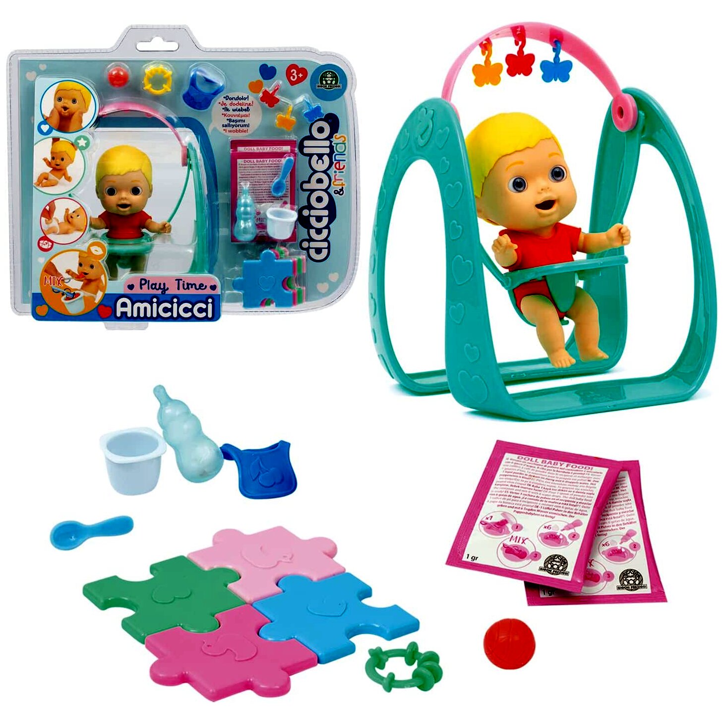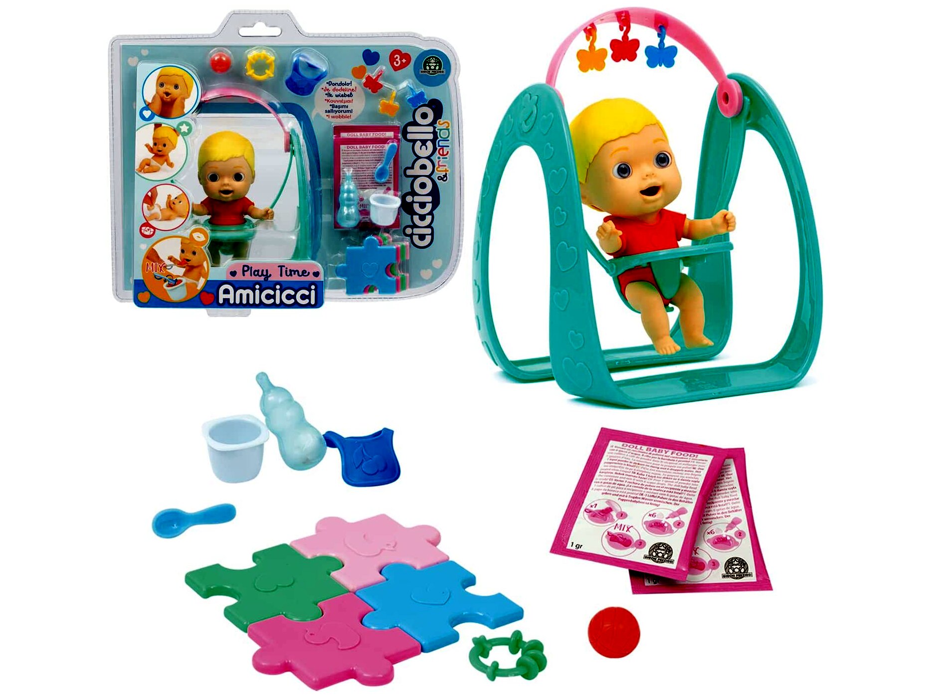 Ez a kis Amicicci játékszett egy csörgőkkel díszített hintát, puzzle játszószőnyeget, cumisüveget, tányért, kanalat, előkét és más apró kiegészítőket tartalmaz.