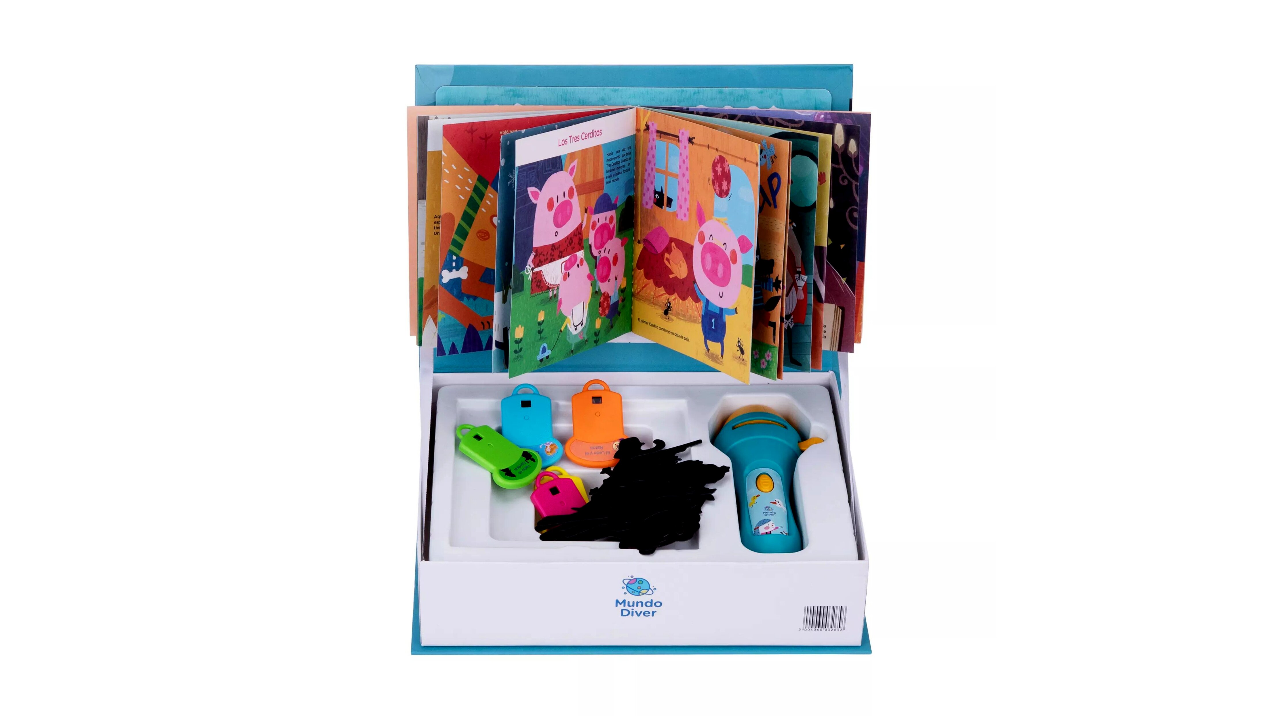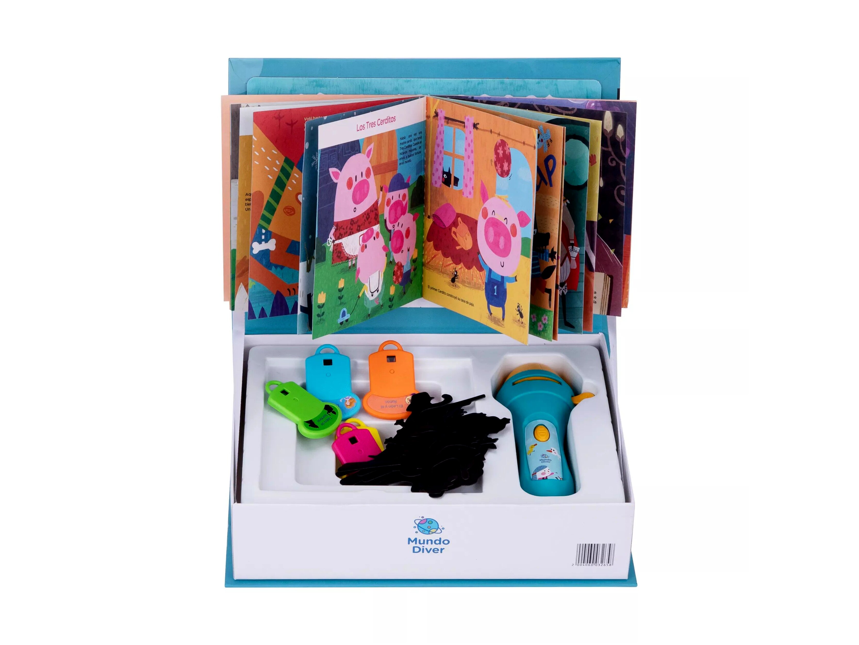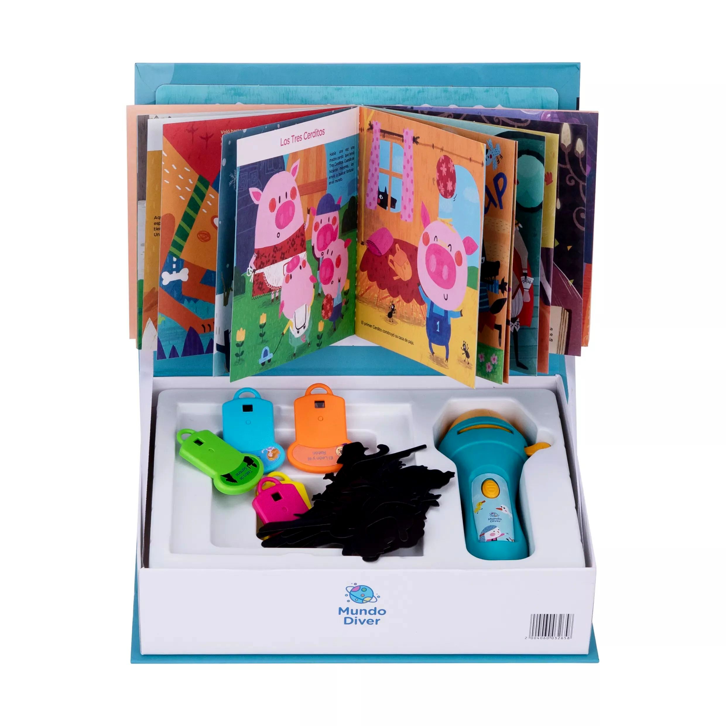 A készlet tartalmaz egy elemlámpát és öt különböző mesét, amelyeket a mellékelt árnyfigurákkal életre kelthettek. A könnyen kezelhető elemlámpának köszönhetően a gyerekek saját kis előadásaikat rendezhetik meg, fejlesztve ezzel képzelőerejüket és színészi készségeiket.
