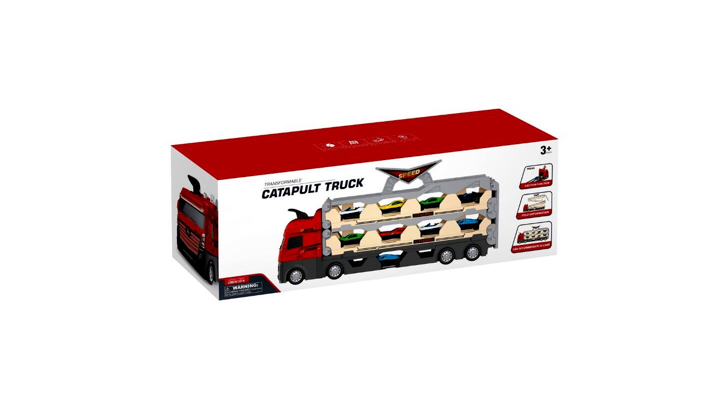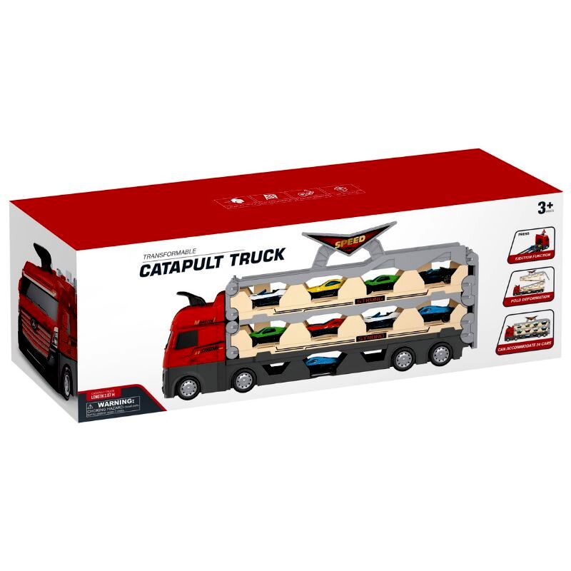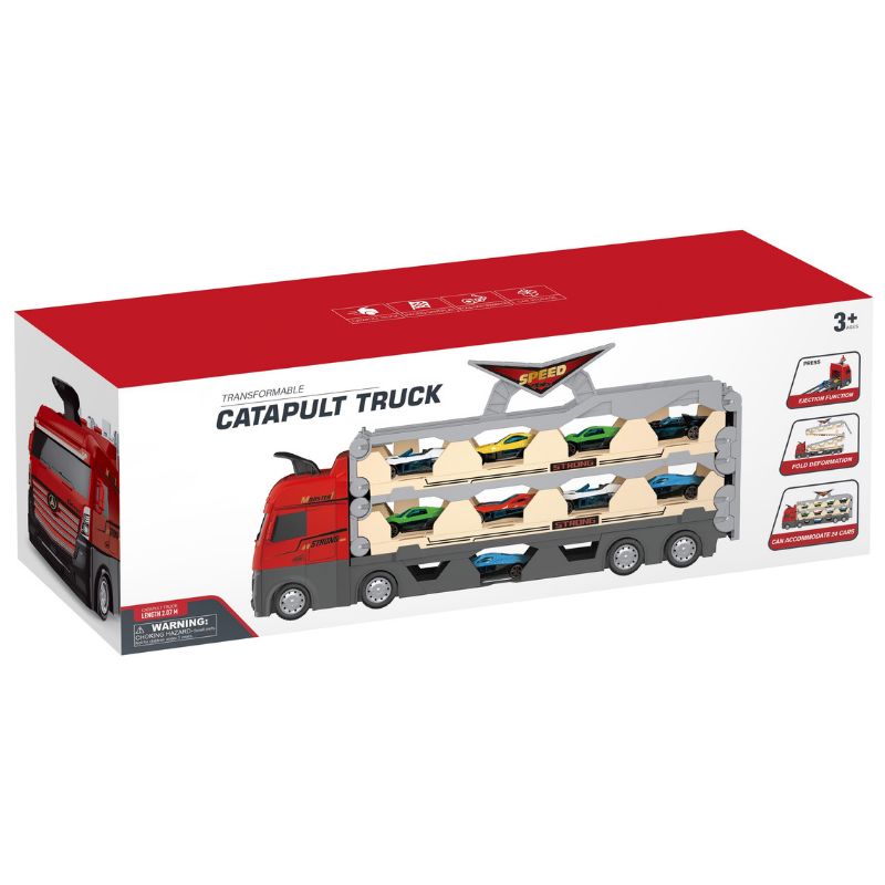 Itt a megoldás, ez a szuper autószállító kamion kihajtható versenypályával. A kamionra több mint 10 darab kisautó elfér, ráadásul a nyíláson keresztül látszanak is. Ha a kamion szállító része kinyílik, egy 2,07 méter hosszú, kétsávos versenypálya terem a szoba közepén. A versenyzőket a pilótafülke tetején lévő gombbal lehet indítani.Az autószállító kamion játékszett 6 darab járművet tartalmaz és több mint 10 kisautó szállítására alkalmas.