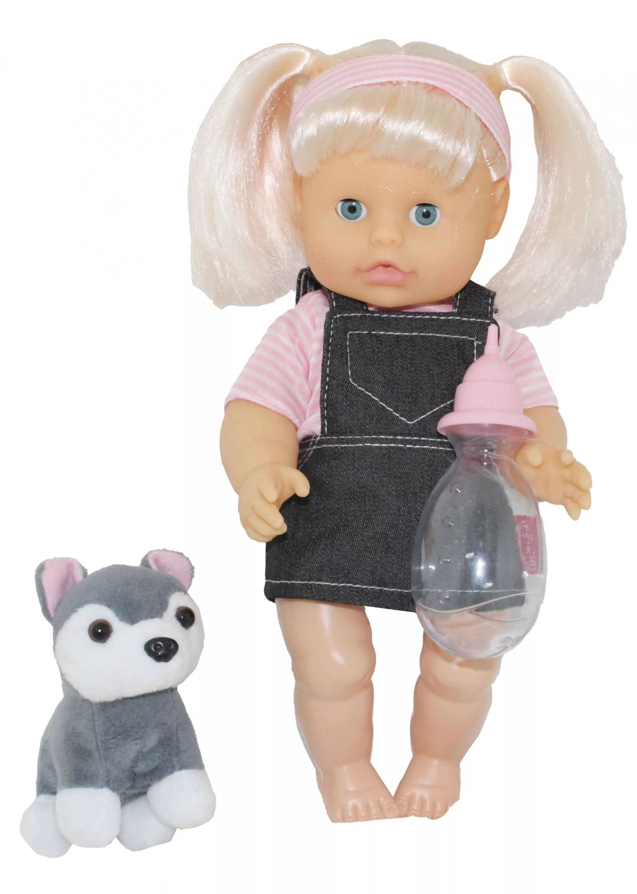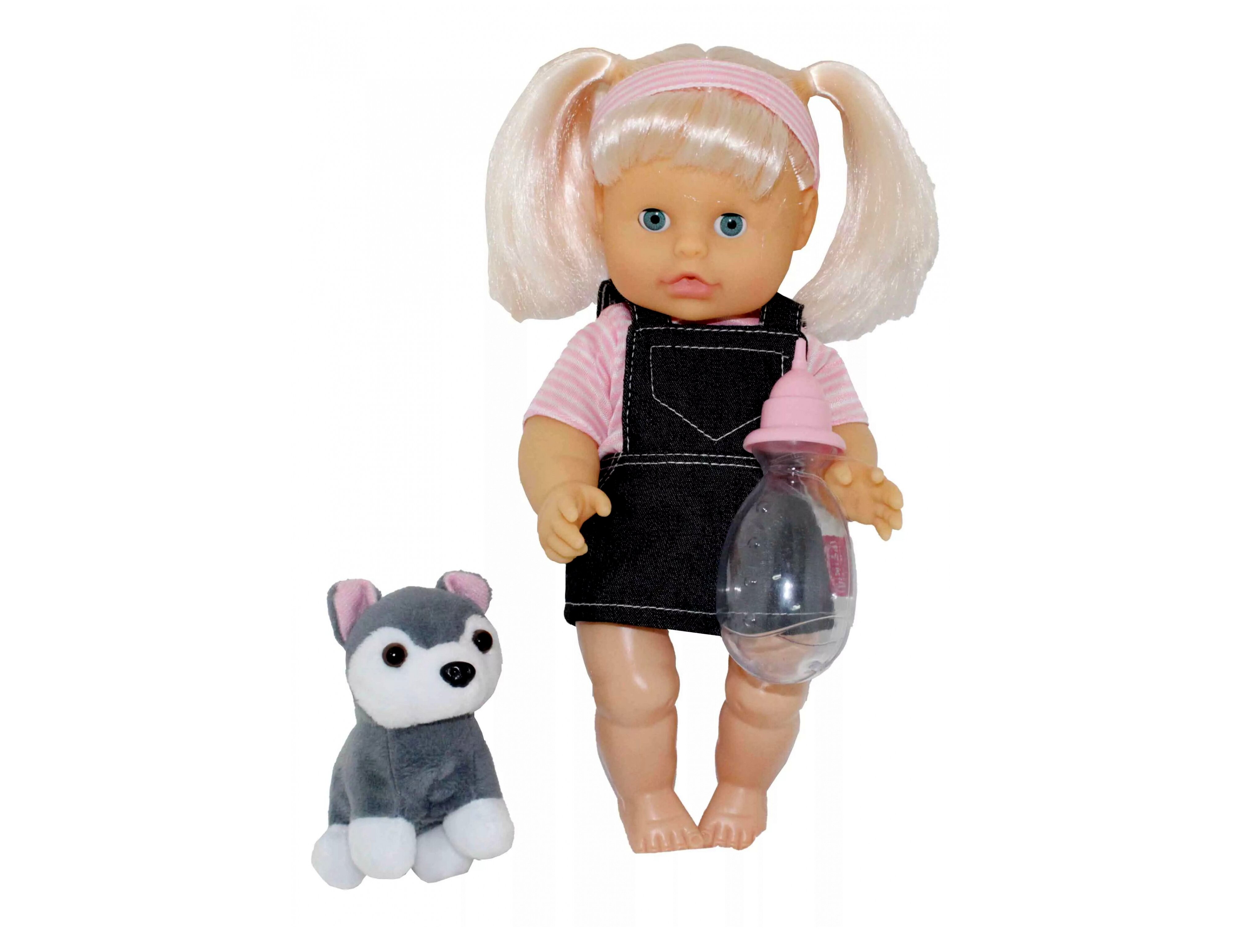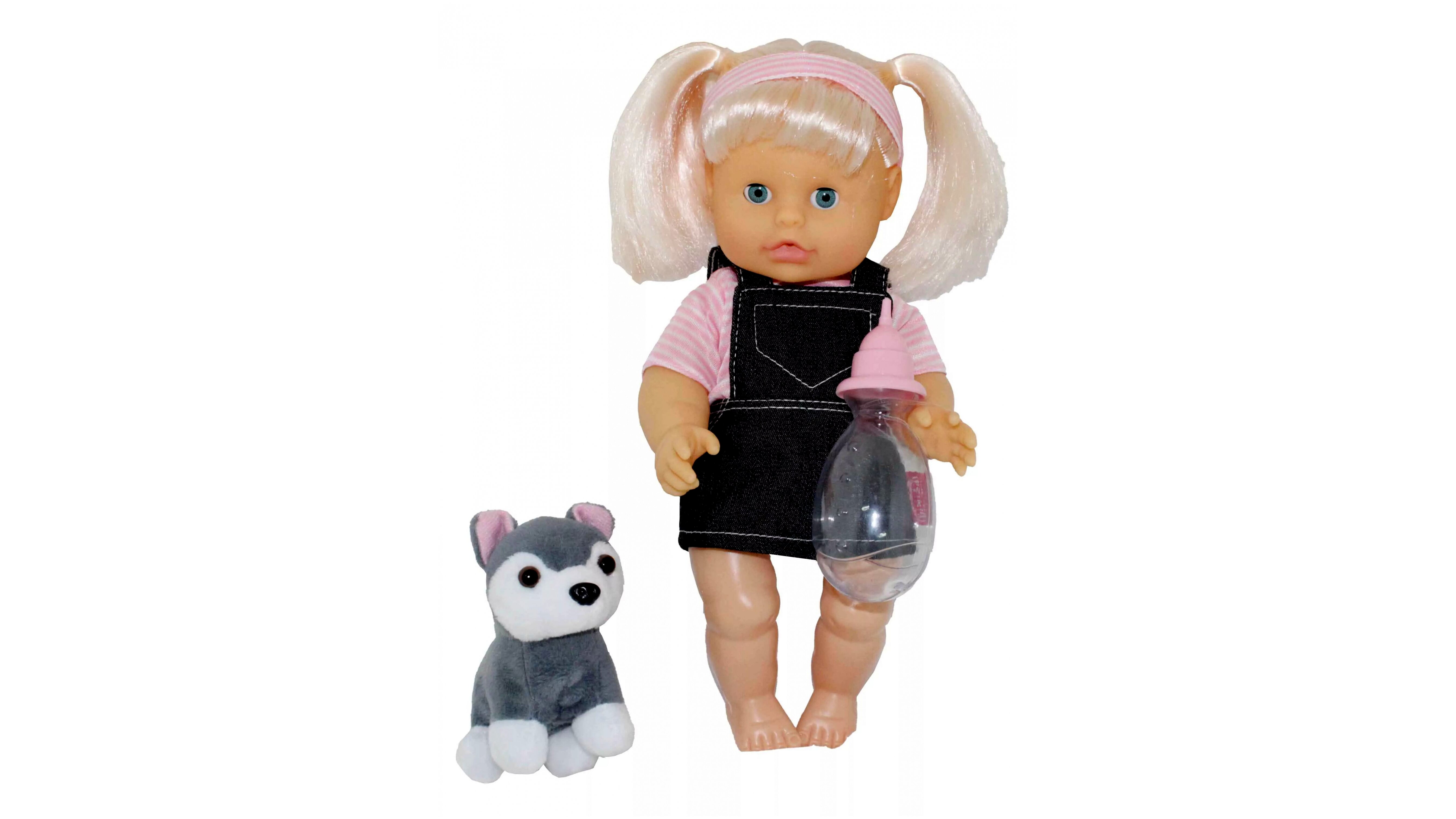 Ezzel az aranyos, fekete farmerszoknyát viselő babával a kislányok kipróbálhatják milyen anyukának lenni. A kb. 36 cm-es babának oldalsó copfokba van fogva a haja, arca aranyos kidolgozású, felsője rózsaszín csíkos. A babához egy cumisüveg, és egy játékkutya is tartozik.A játék fejleszti a fantáziát és a képzelőerőt. A „kis anyukák” babájuk gondozásával a felnőttek világát utánozhatják szerepjáték által, így sokat tanulnak a felelősségvállalásról, a szeretetről, önállóságról és a gondoskodásról.