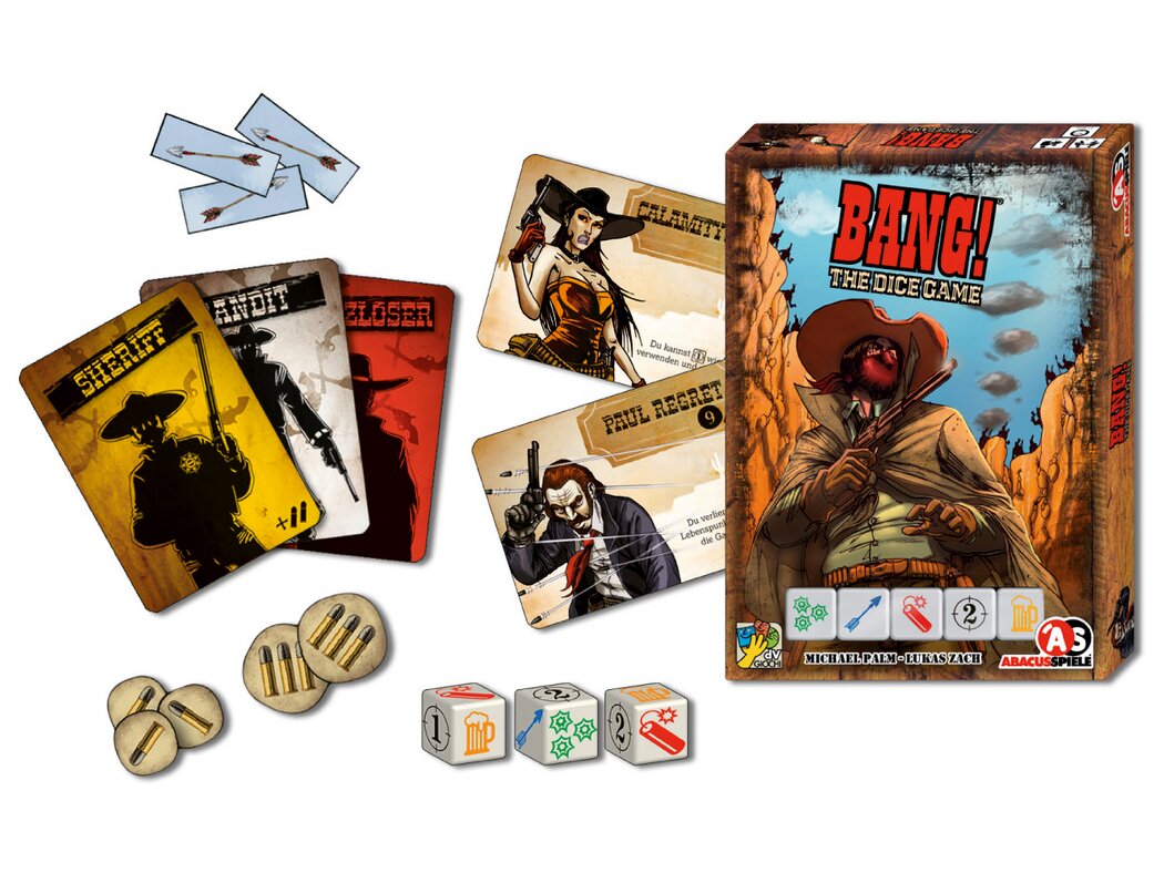 Tartalom: 5 db Bang! Dobókocka, 30 db kártya, 9 db nyílveszőlapka, 40 db tölténykorong, játékszabály