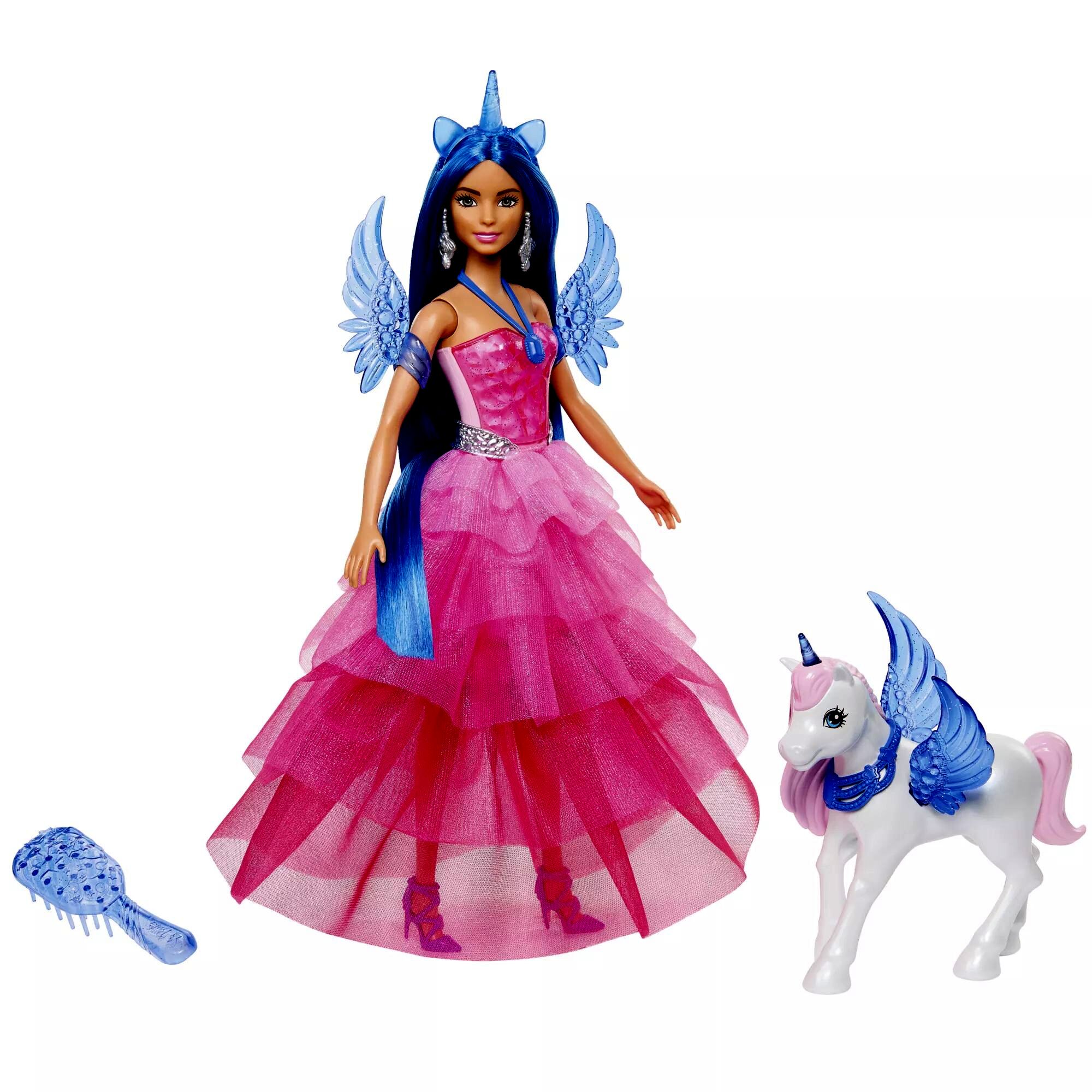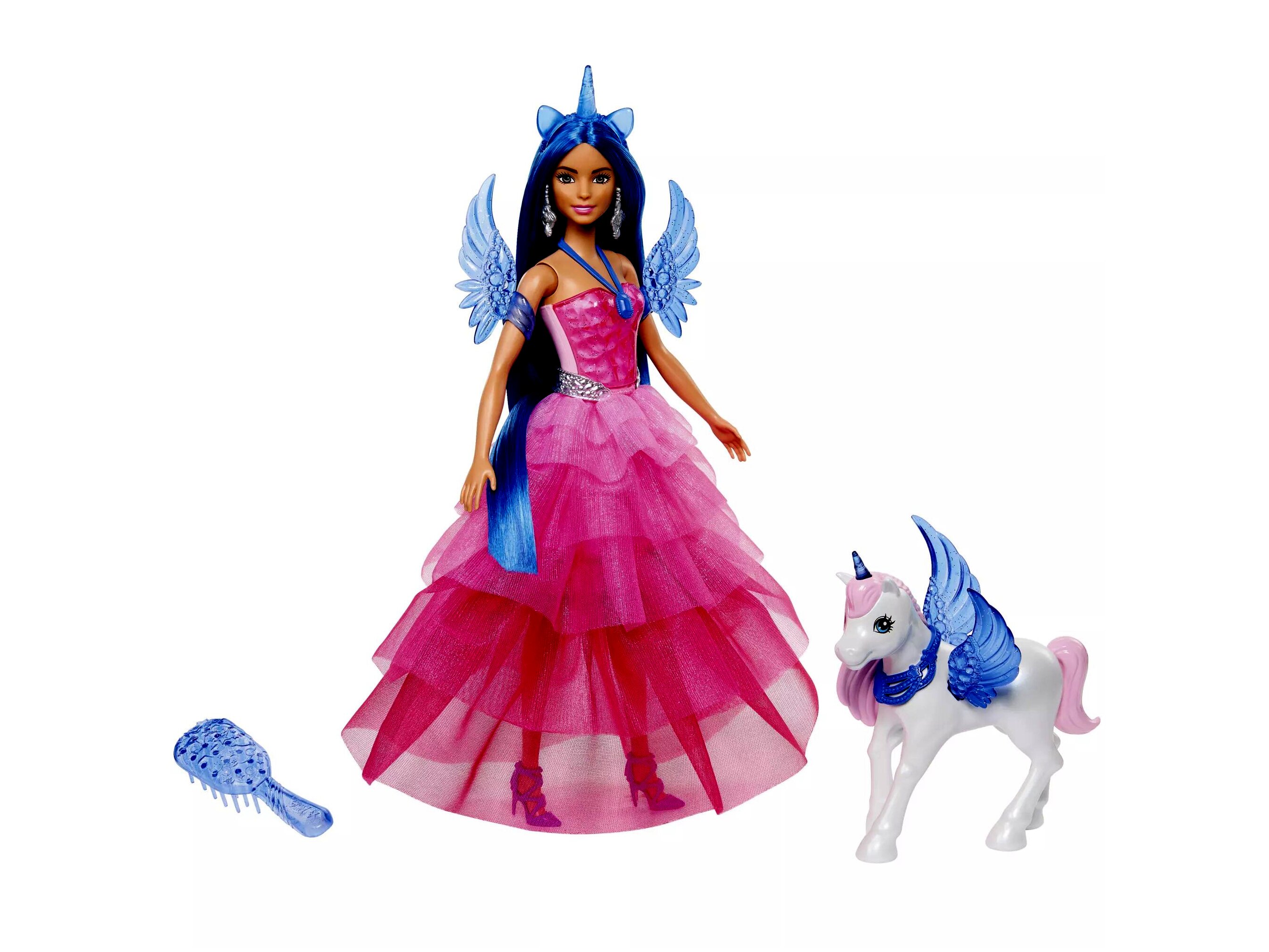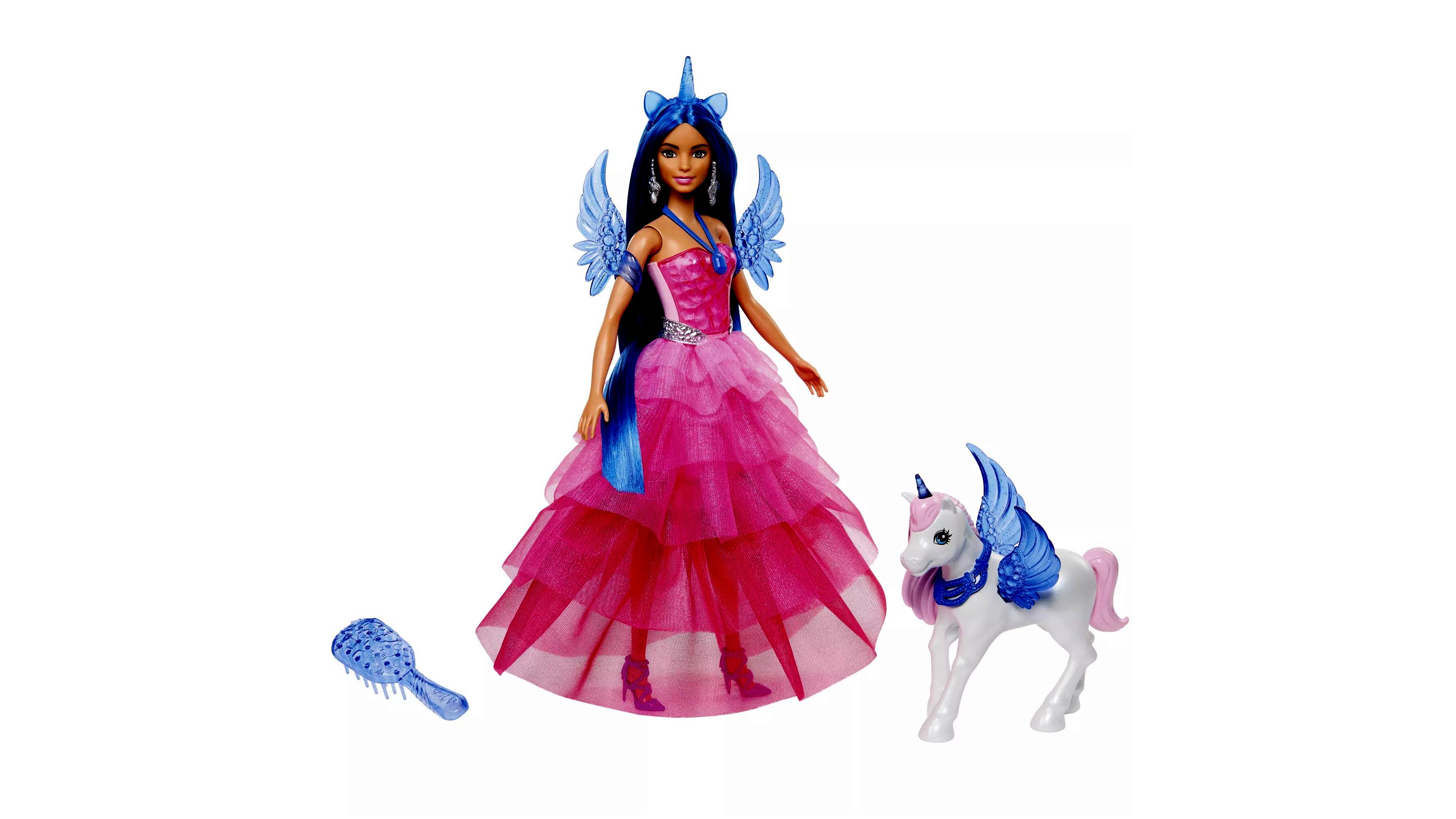 A meseszép külsejű baba rózsaszín, földig érő fodros ruhát visel. Gyönyörű kék frizurájára az alikornis tiara teszi fel a koronát, a karjára illeszthető szárnyakkal és a levehető farkincával pedig igazán mesebeli lesz a megjelenése. A készletben további kiegészítők és egy alikornis barát is megtalálható.