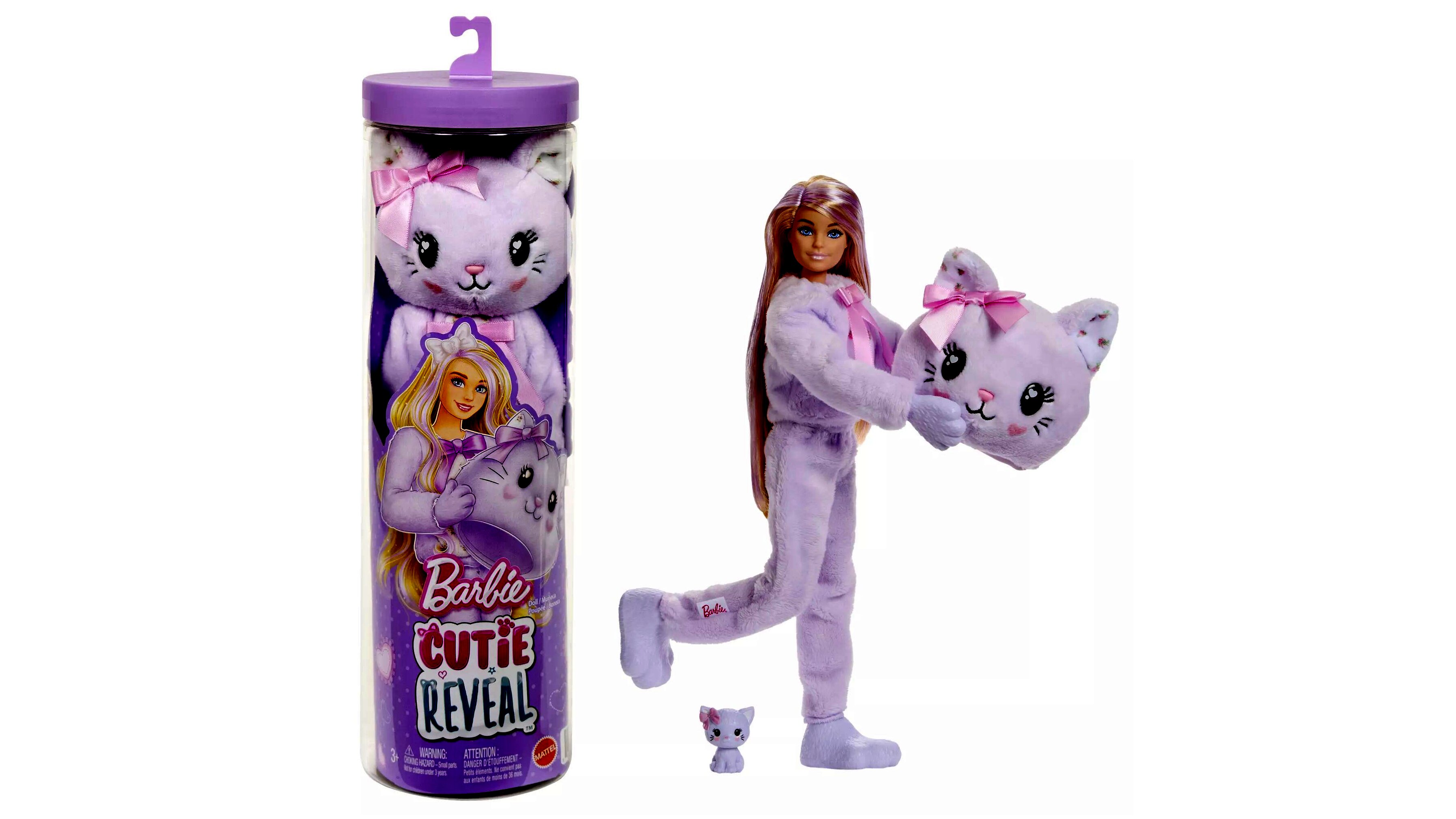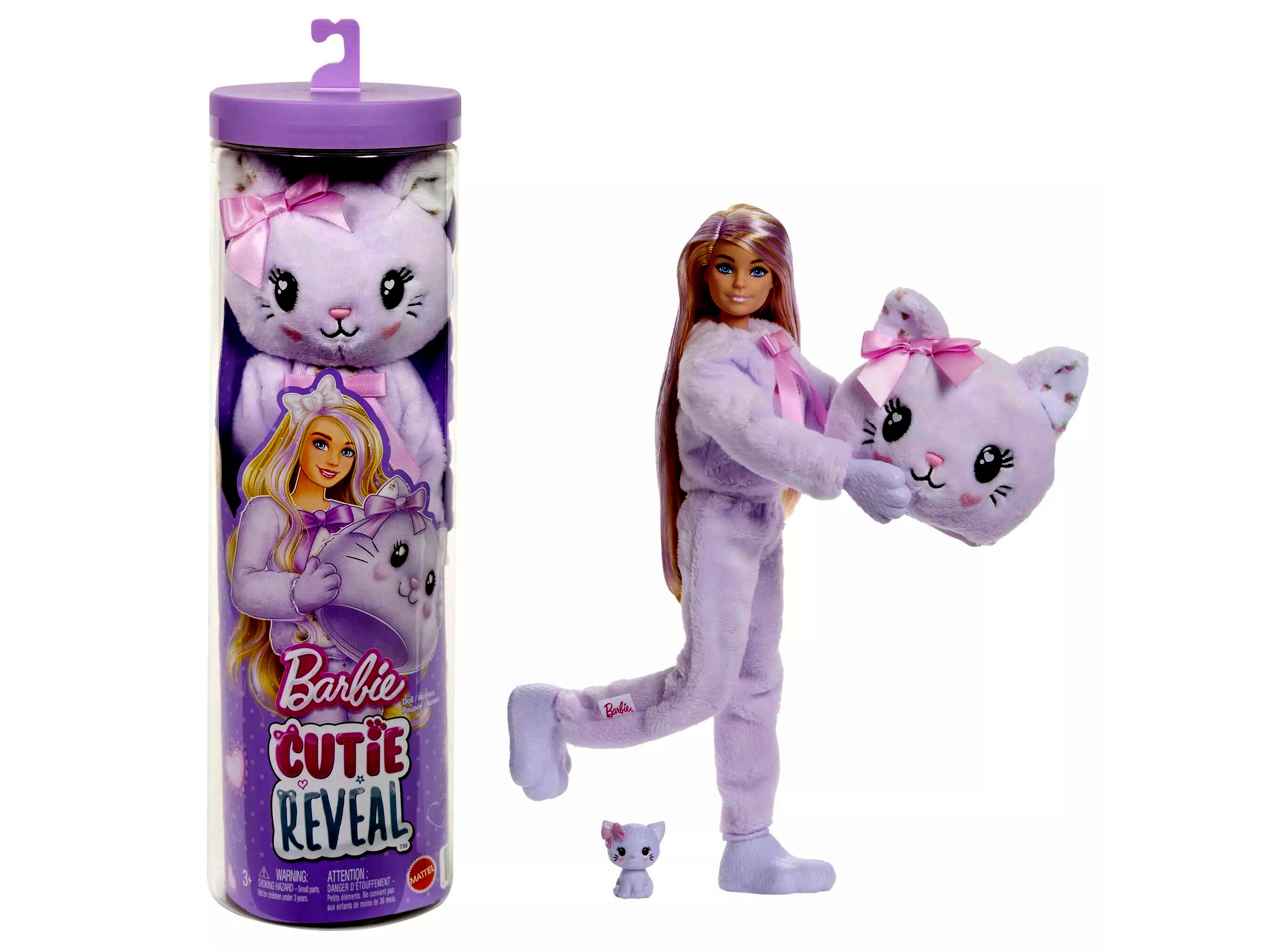 A Barbie Cutie Reveal Cica egy meglepetésekkel teli divatbaba-szett: a puha, pasztell cica jelmez alatt egy hosszú hajú Barbie baba rejtőzik, a csomagban pedig további kiegészítők és egy karakterhez illő kis kedvenc is található. A jelmez kifordítva ruhaként is használható, a hideg és meleg vizes játék pedig extra átalakulásokat kínál.