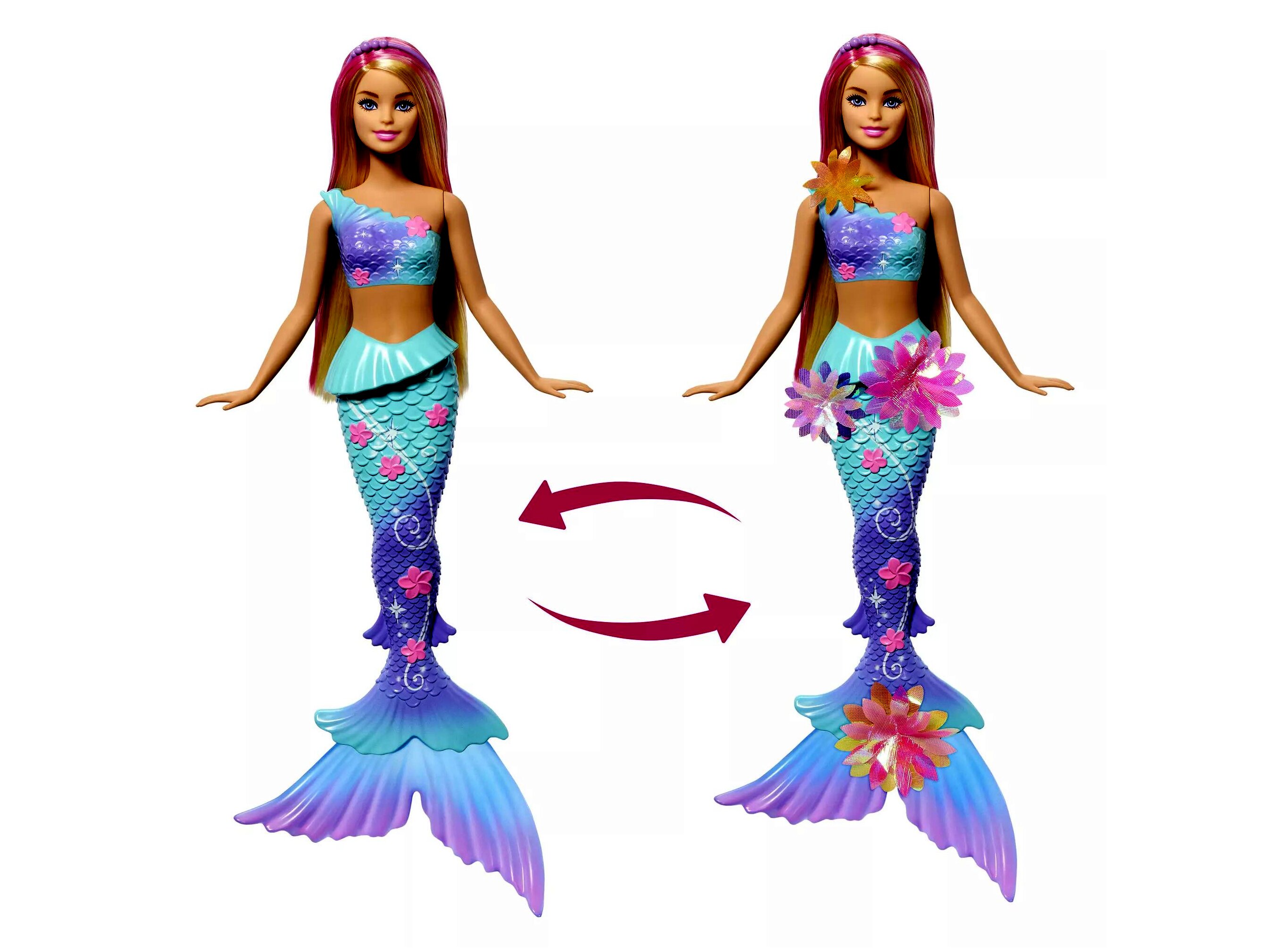 - Varázslat Egy Mozdulattal: A baba hátán lévő kar elcsúsztatásával varázslatosan előbukkannak a virágok a felsőjén, a derekán és a sellőfarkán.