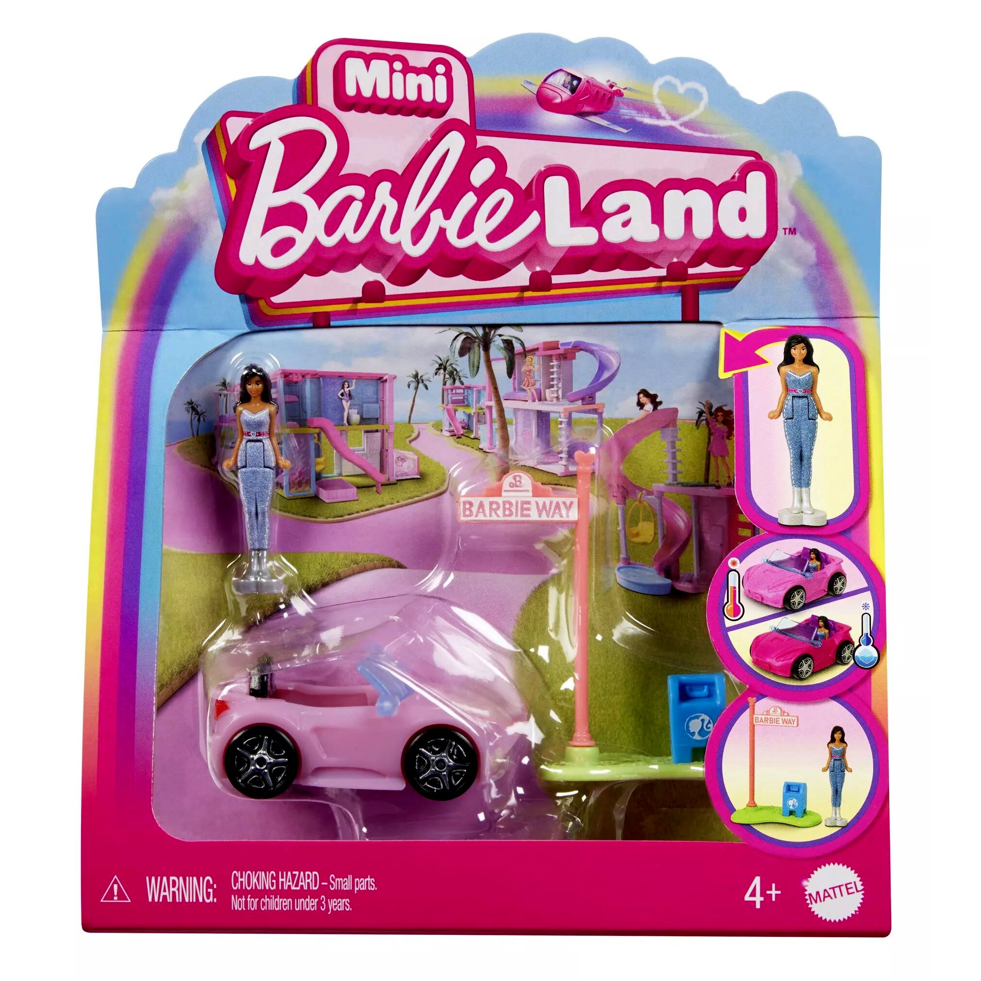 Minden szett tartalmaz egy 3,8 cm-es, bájosan öltöztetett Barbie babát, amely derékban hajlik, hogy le tudjon ülni és elvezessen a nagy kalandok felé Mini BarbieLand-ben. A 4 éves vagy idősebb rajongók biztosan szeretnék majd mindet összegyűjteni, hogy megépíthessék saját mini világukat! Minden termék külön kapható, a készlet erejéig. A színek és díszítések eltérhetnek.