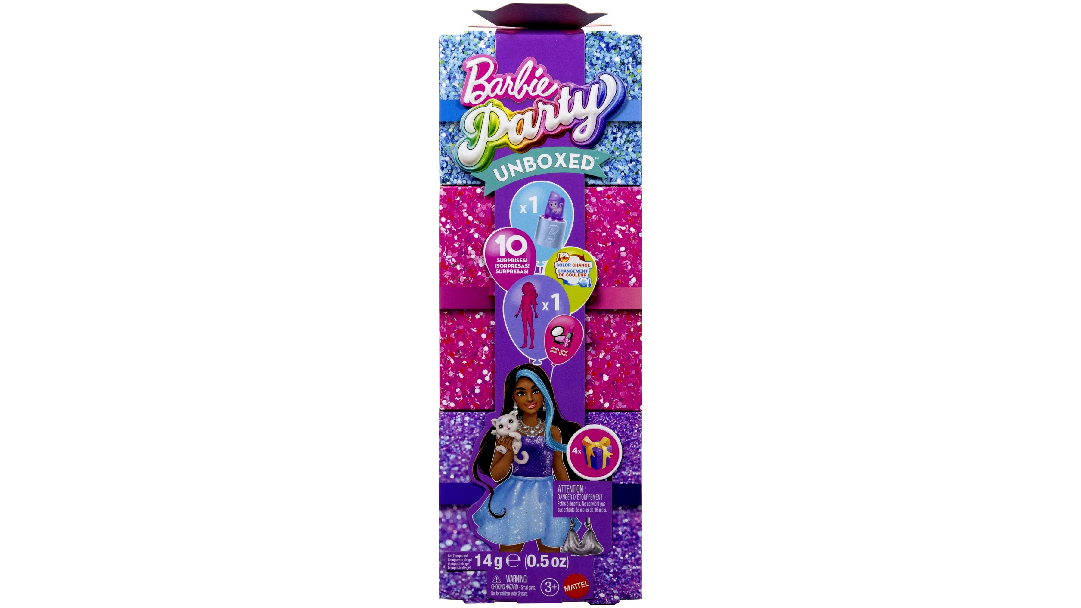 A Barbie Party Reveal Glamour meglepetés szett egy meglepetésekkel teli babacsomag, amelyben a buli előtti készülődés és a partyhangulat kiegészítői egyaránt helyet kapnak. A csomagban egy Party Reveal Glamour Barbie baba, egy kiskedvenc és több tematikus kiegészítő található, valamint egy színváltós játékfunkció, ami hideg és meleg vízzel ismételhető.