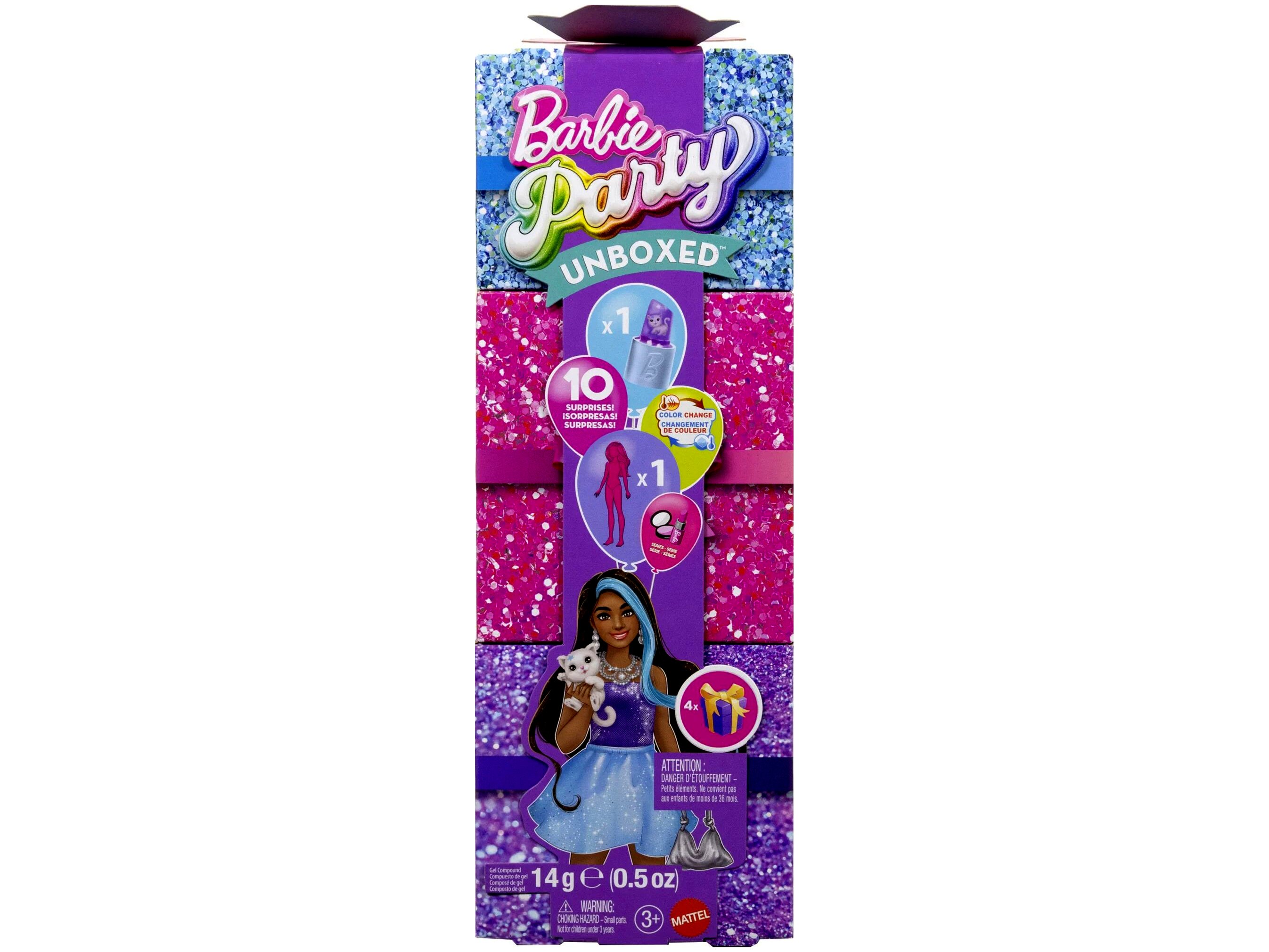 A lila változat egy hosszú, fekete hajú Party Reveal Glamour Barbie babát és egy kiskedvencet tartalmaz, így a játék rögtön több szereplővel indulhat.