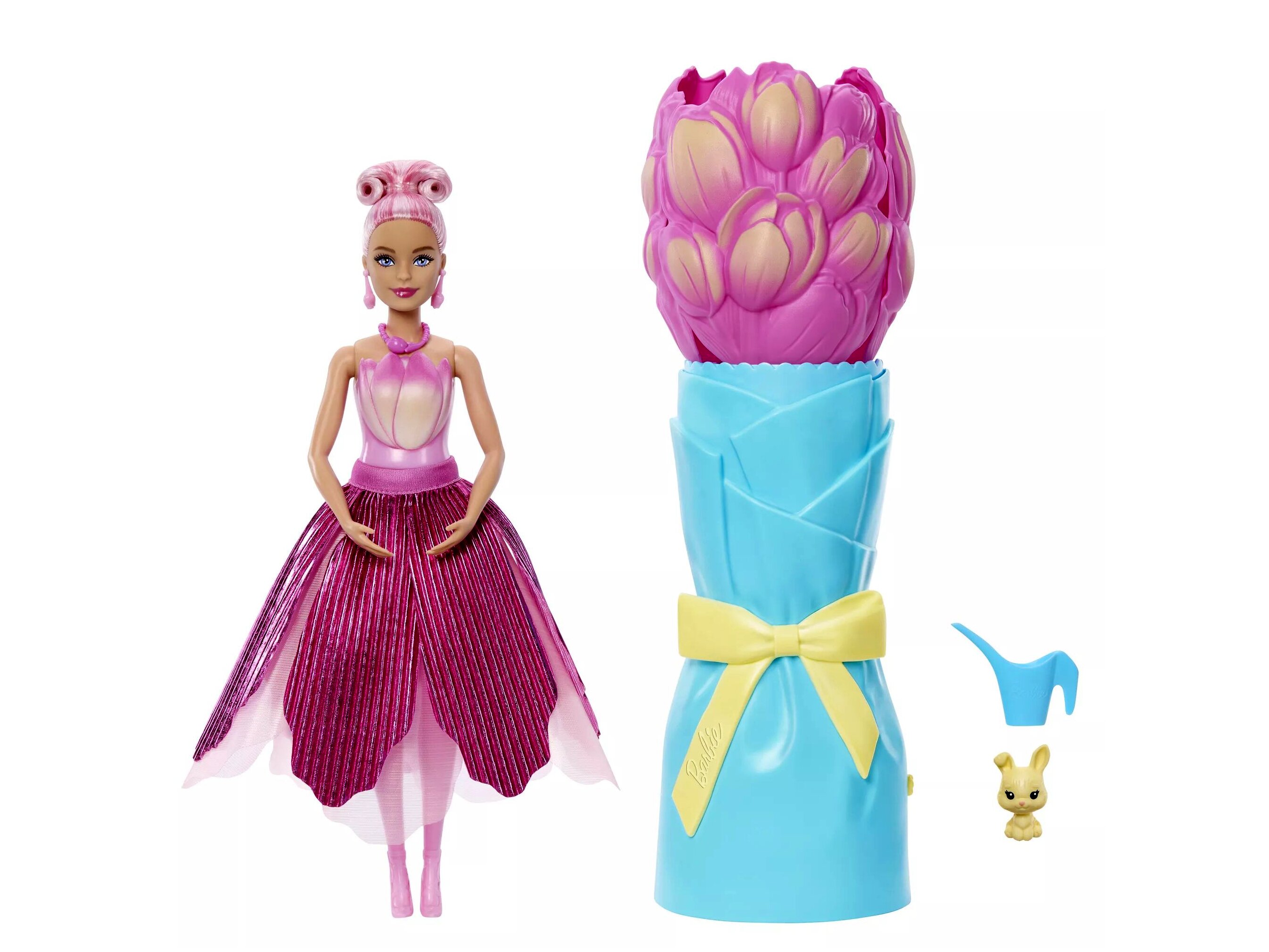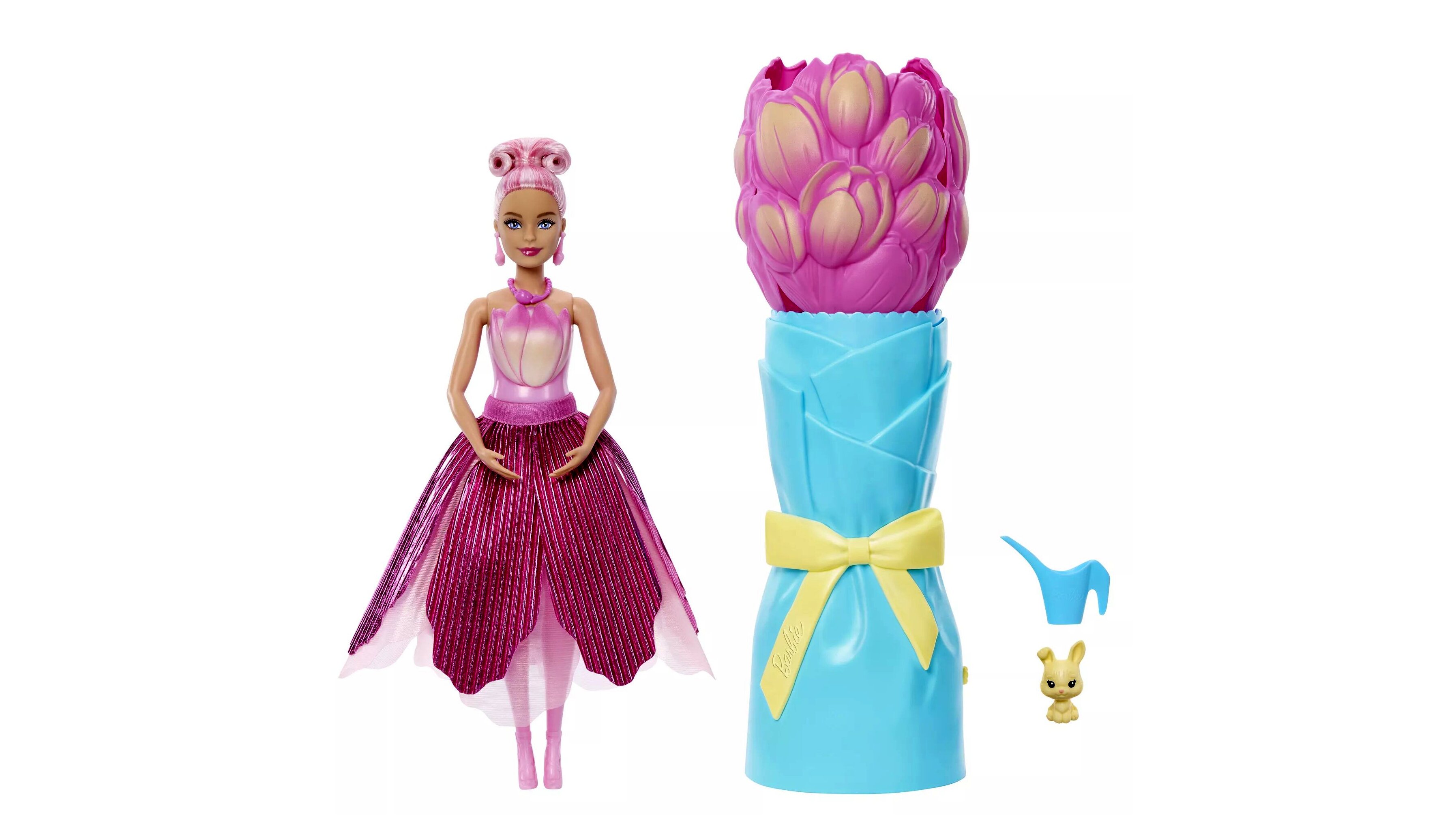 A mellékelt kis öntözőkanna a játék része: a csokor „meglocsolásával” jelenik meg a Barbie baba. A csokorba visszahelyezve a folyamat újra megismételhető, így a játék többször is újraélhető.