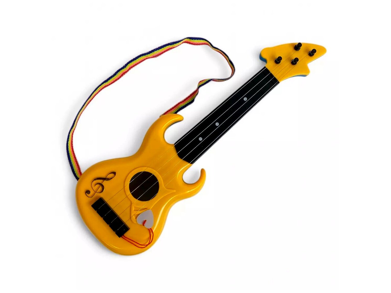 Ez a hangszer valódi húrokkal rendelkezik, így igazi gitáros élményt nyújt a kicsik számára. A szuper menő, rockos megjelenés garantáltan felkelti minden kis zenész figyelmét. A hangszer kényelmes, színes nyakpánttal van ellátva. A pengető használata még élethűbbé teszi a játékot.