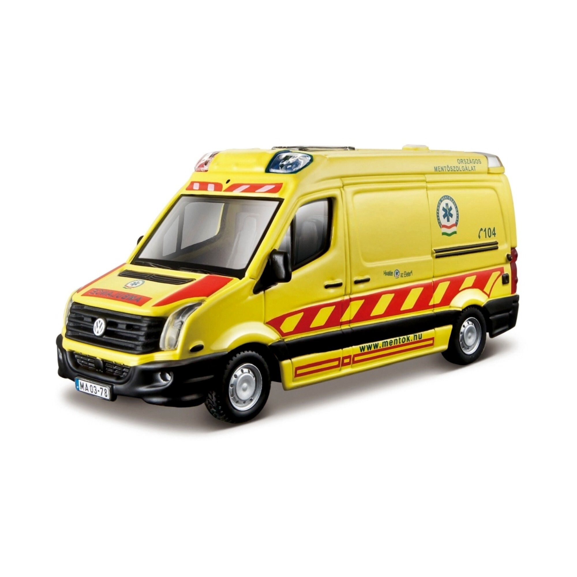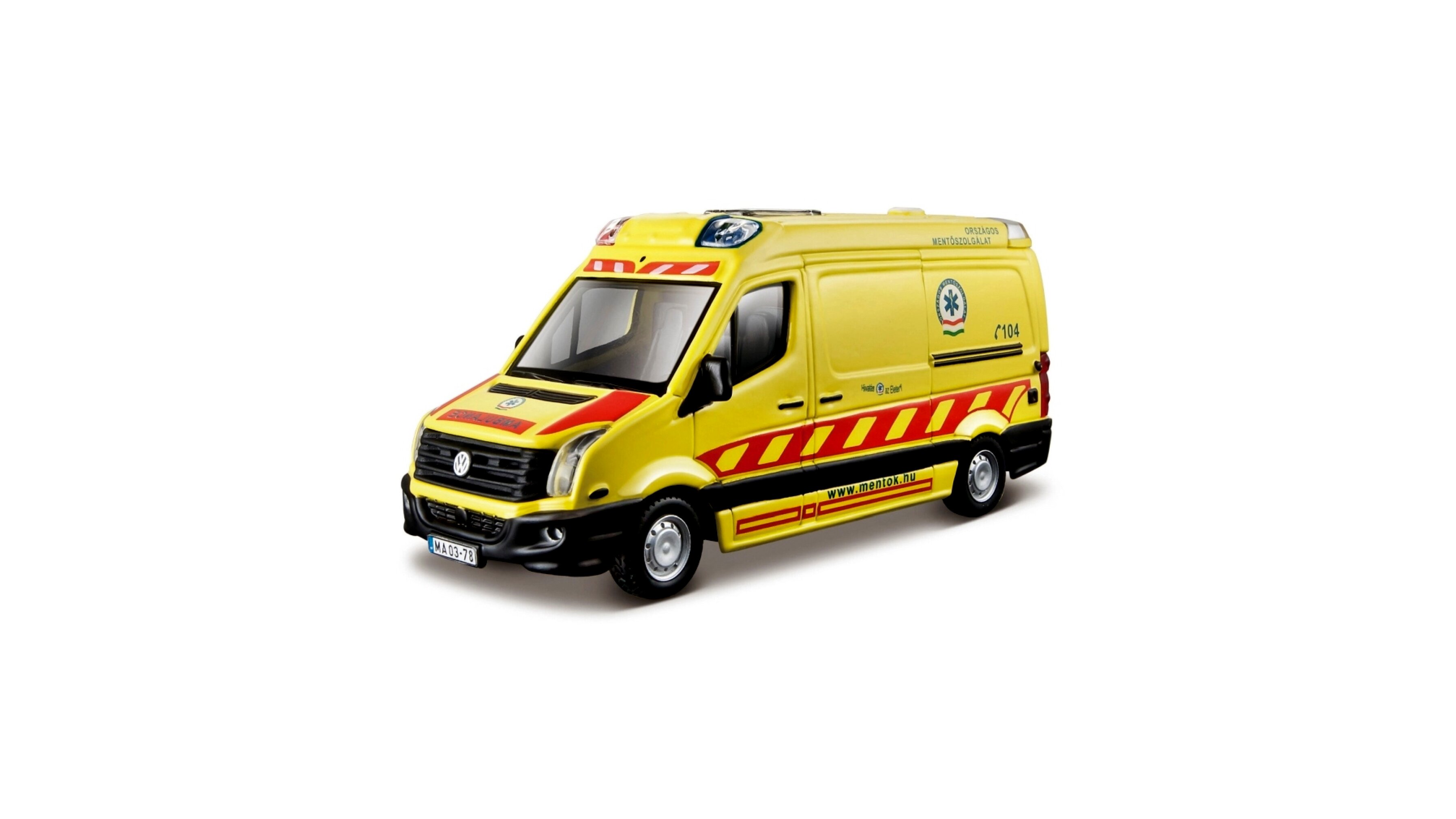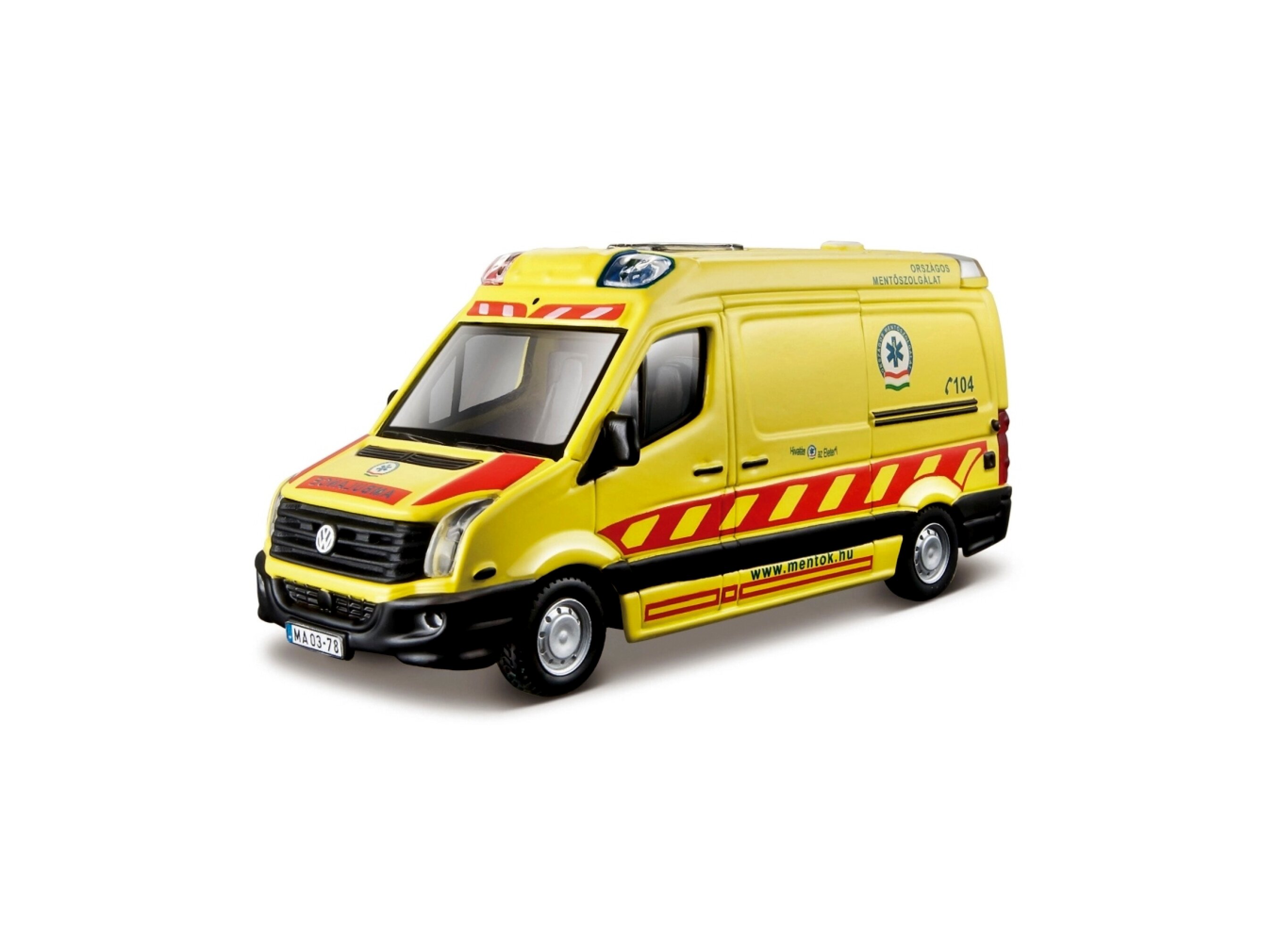 Fémből készült, sárga színű Bburago magyar mentőautó - Volkswagen Crafter.