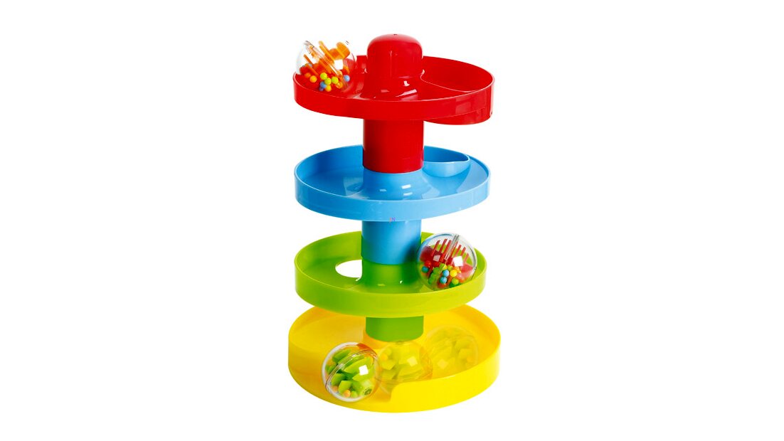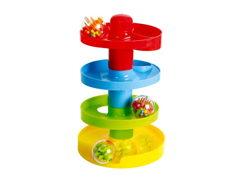 Műanyagból készült, kis kezekre tervezett készségfejlesztő bébi golyópálya. A labdák pörögnek a színes emeleteken, majd egyre lejjebb pottyannak, végül az alsó tálcán fognak kikötni! A játék segíti a szem-kéz koordináció fejlesztését, és a csörömpölő labdák hangos kacajra ingerlik a gyermeket! Csomagolási méretek: 26 x 10 x 26 cm.