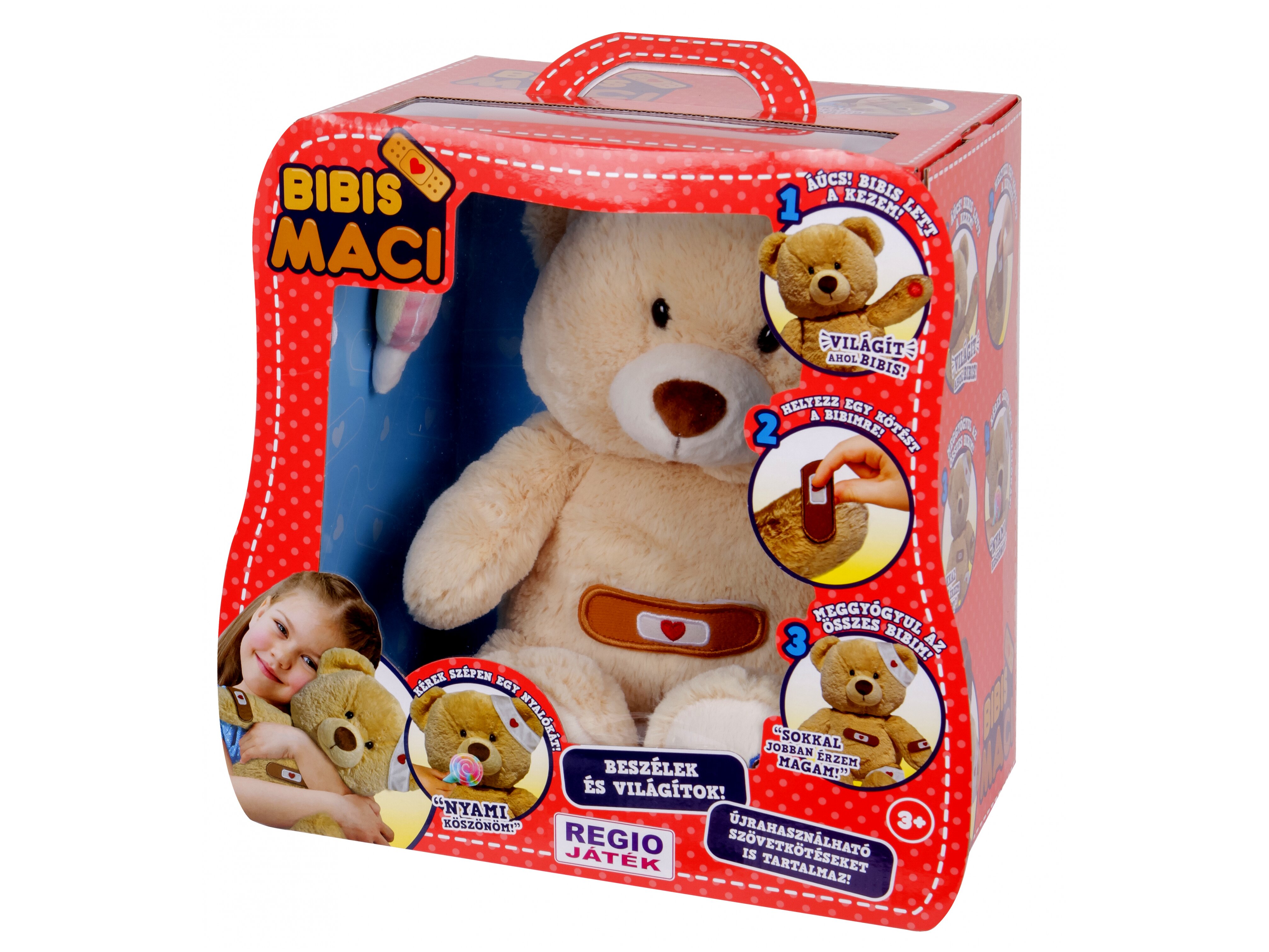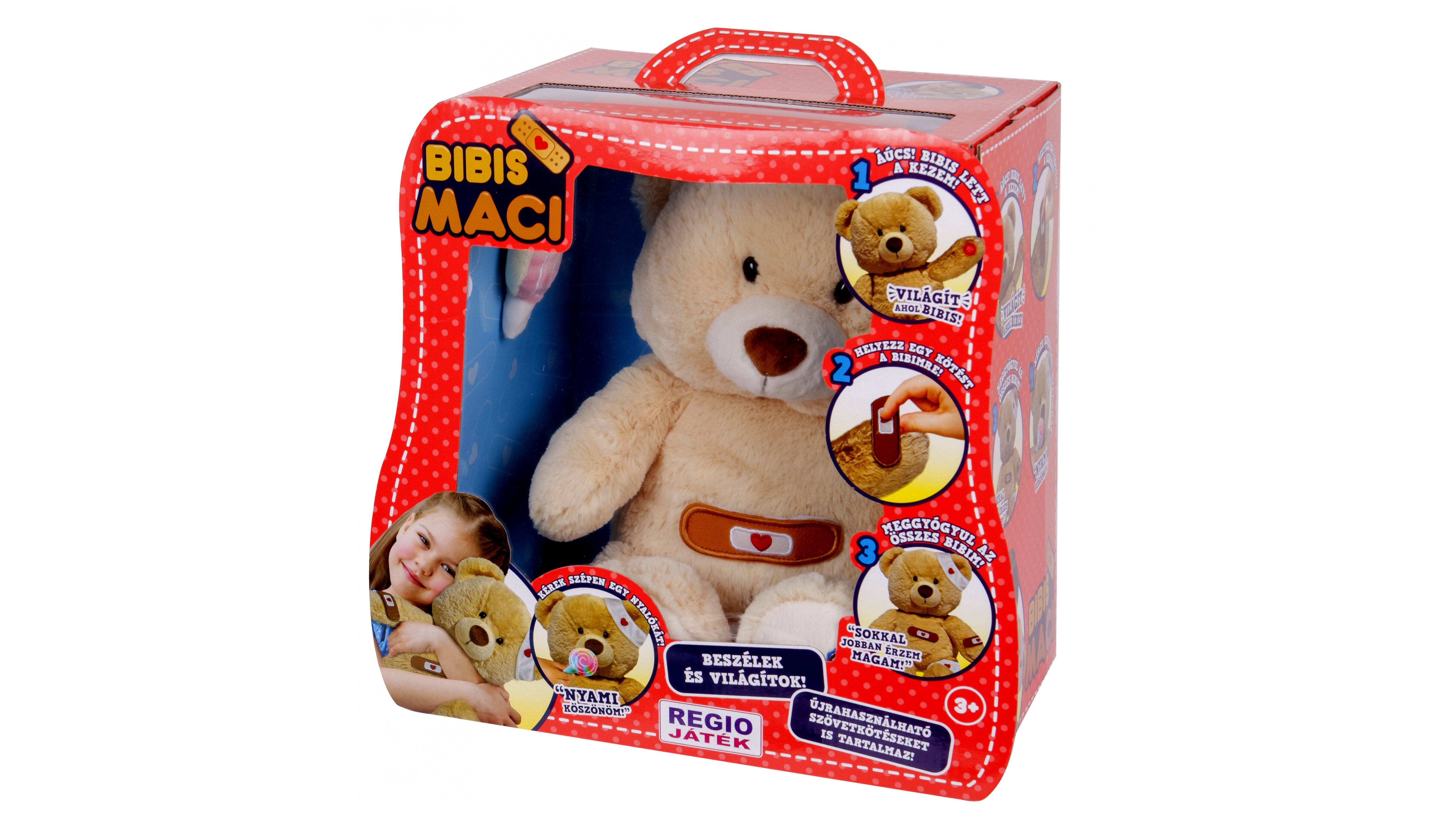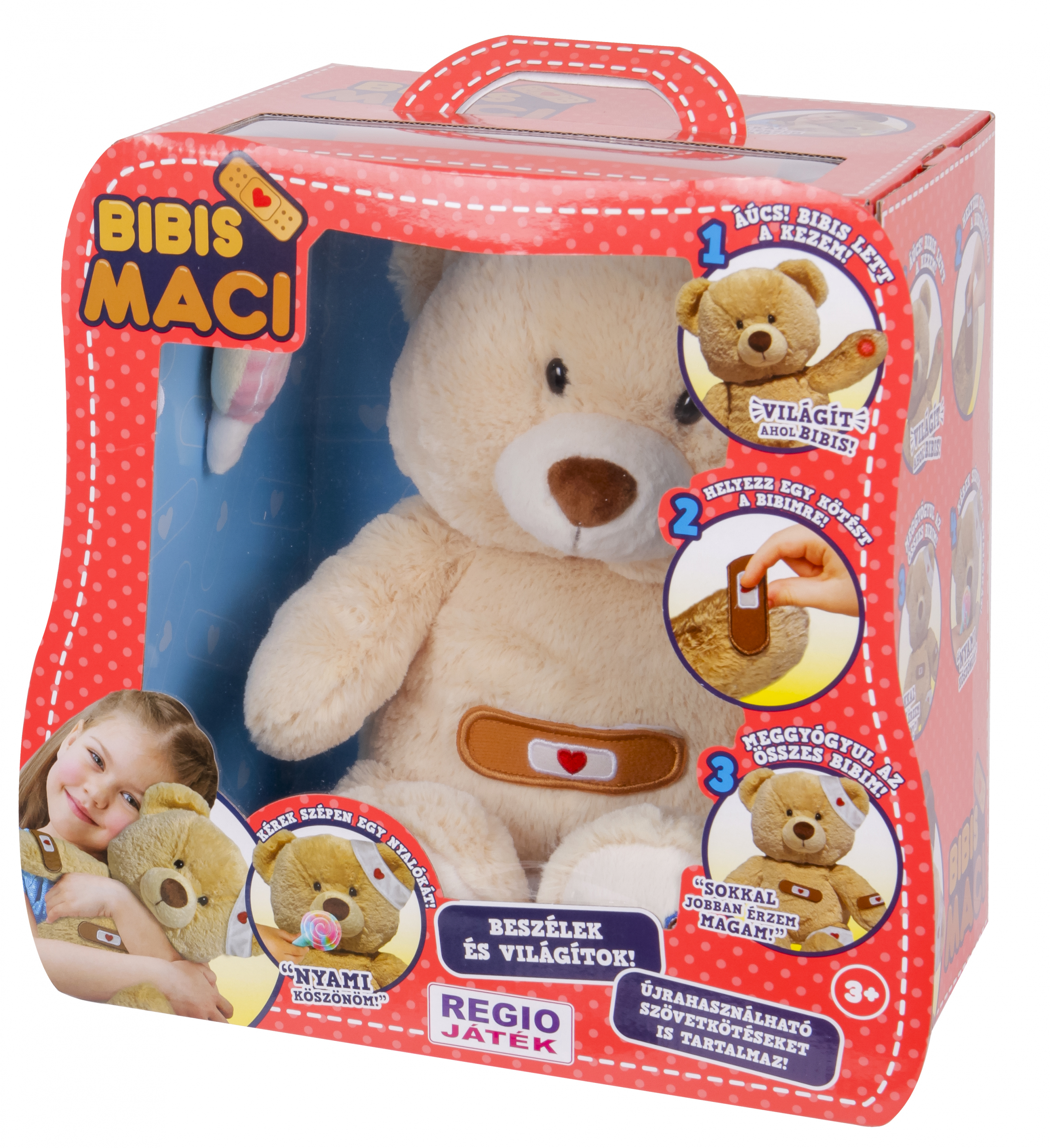 Tartalom: Maci plüss, 2 db újrafelhasználható kötszer, 3 db újrafelhasználható tapasz, 1 db nyalóka, 1 db használati útmutató