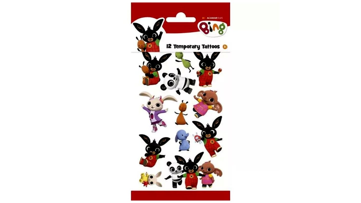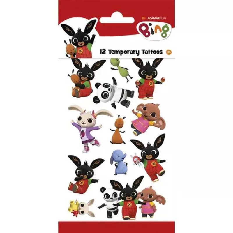 Ezzel a Bing és barátai lemosható tetoválás szettel a kicsik magukon viselhetik kedvenc karaktereiket. A felhelyezéshez csupán ki kell vágni a kiválasztott képet, eltávolítani az átlátszó filmréteget, majd ráhelyezni a matricát a száraz bőrre. Ezután nedves szivaccsal kb. 30 másodpercig kell áztatni, amíg le nem választható a papírréteg, és ha ez megtörtént, már kész is a vagány tetkó.