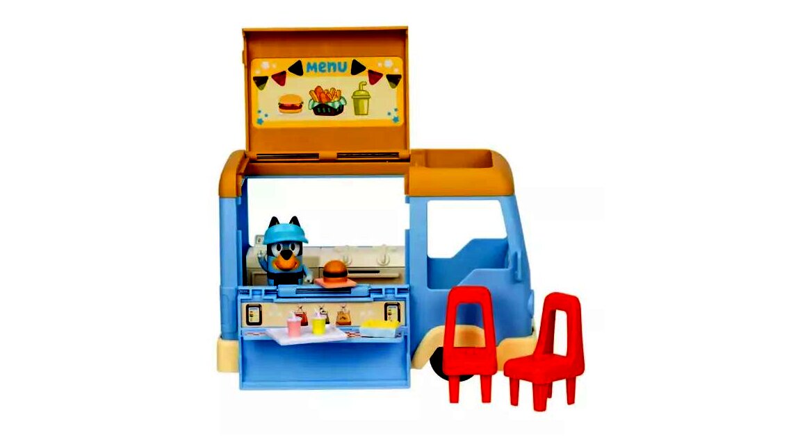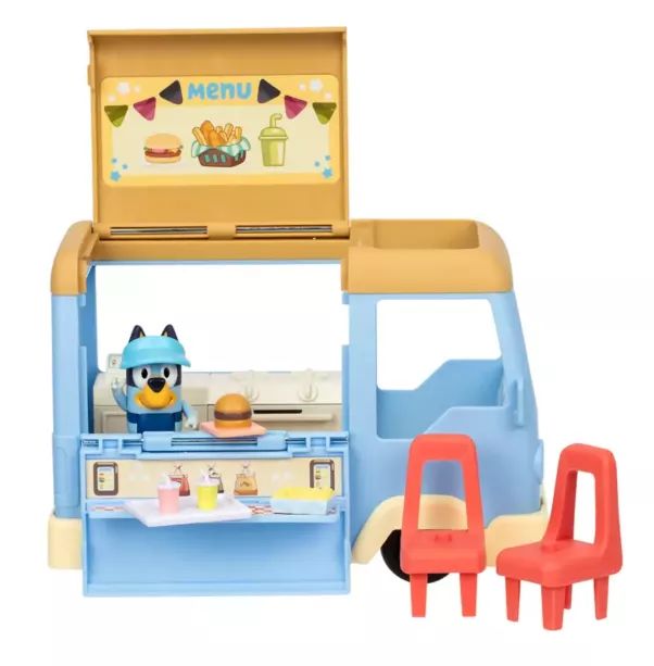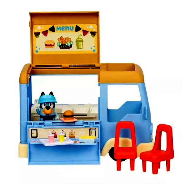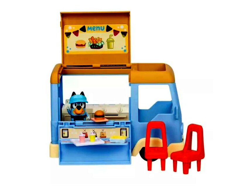 - Tartalom: Ételkocsi, Bluey figura, 2 szék, kiegészítők (italok, tálca, hamburger)