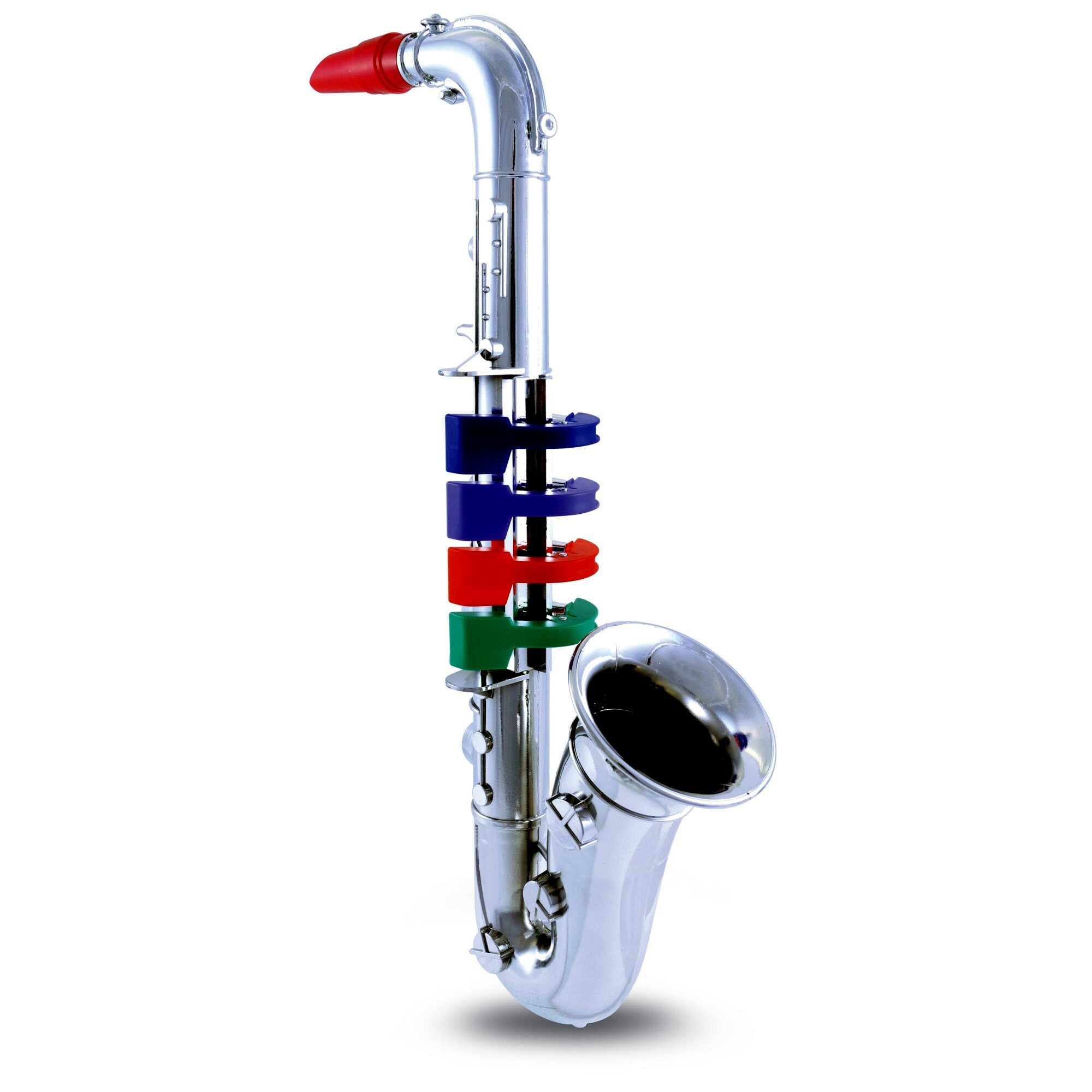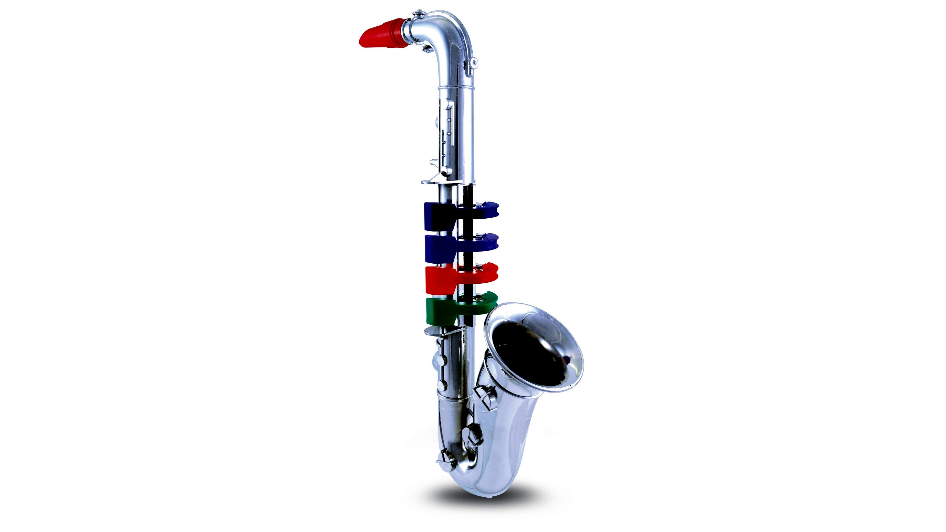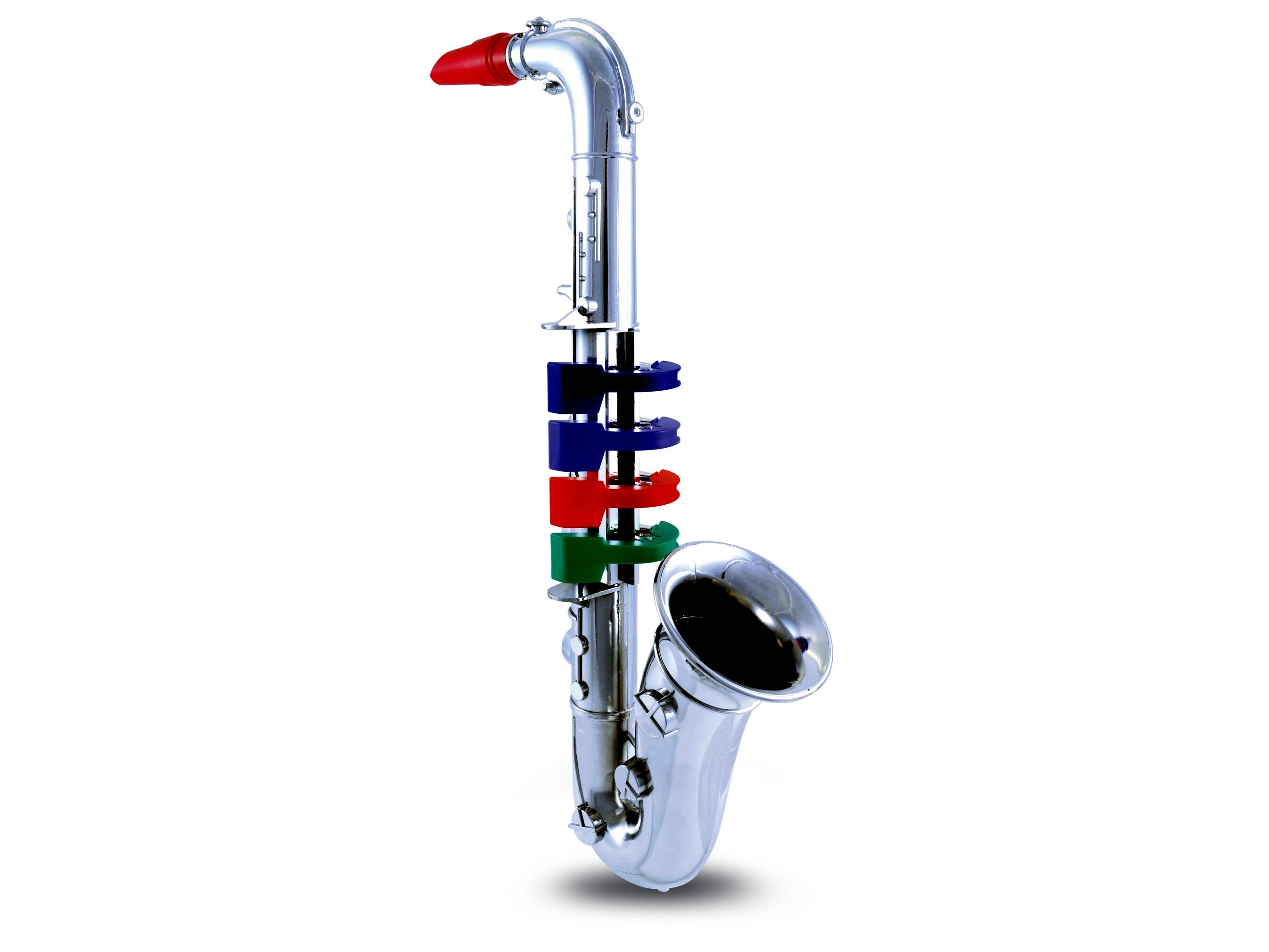 Műanyagból készült szaxofon, színes billentyűkkel.