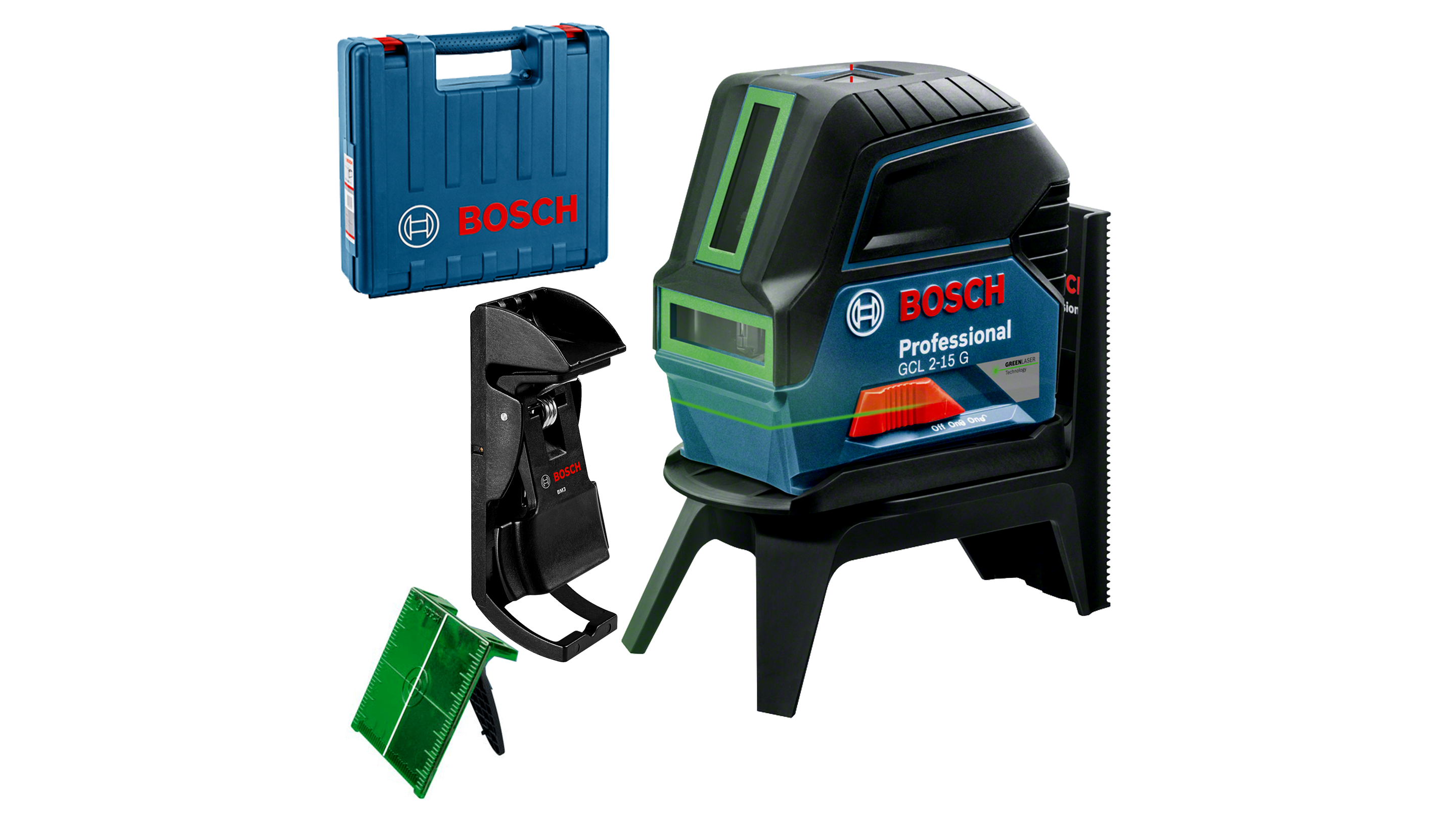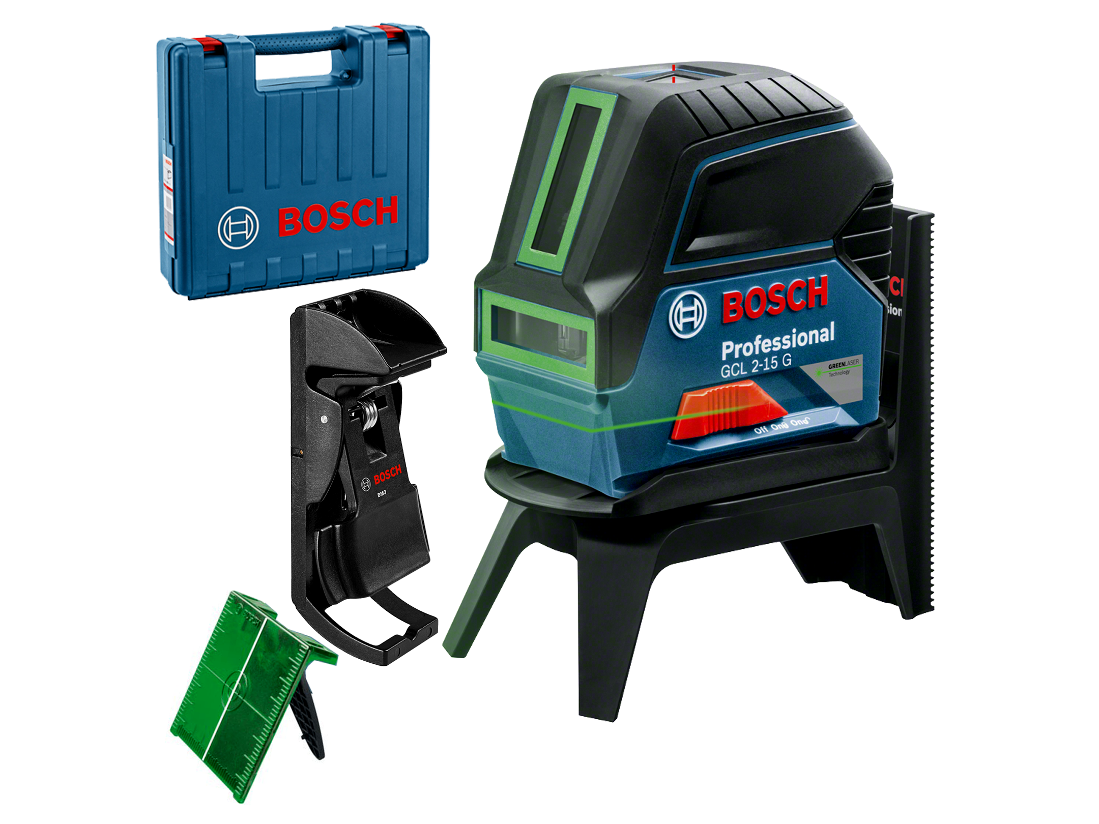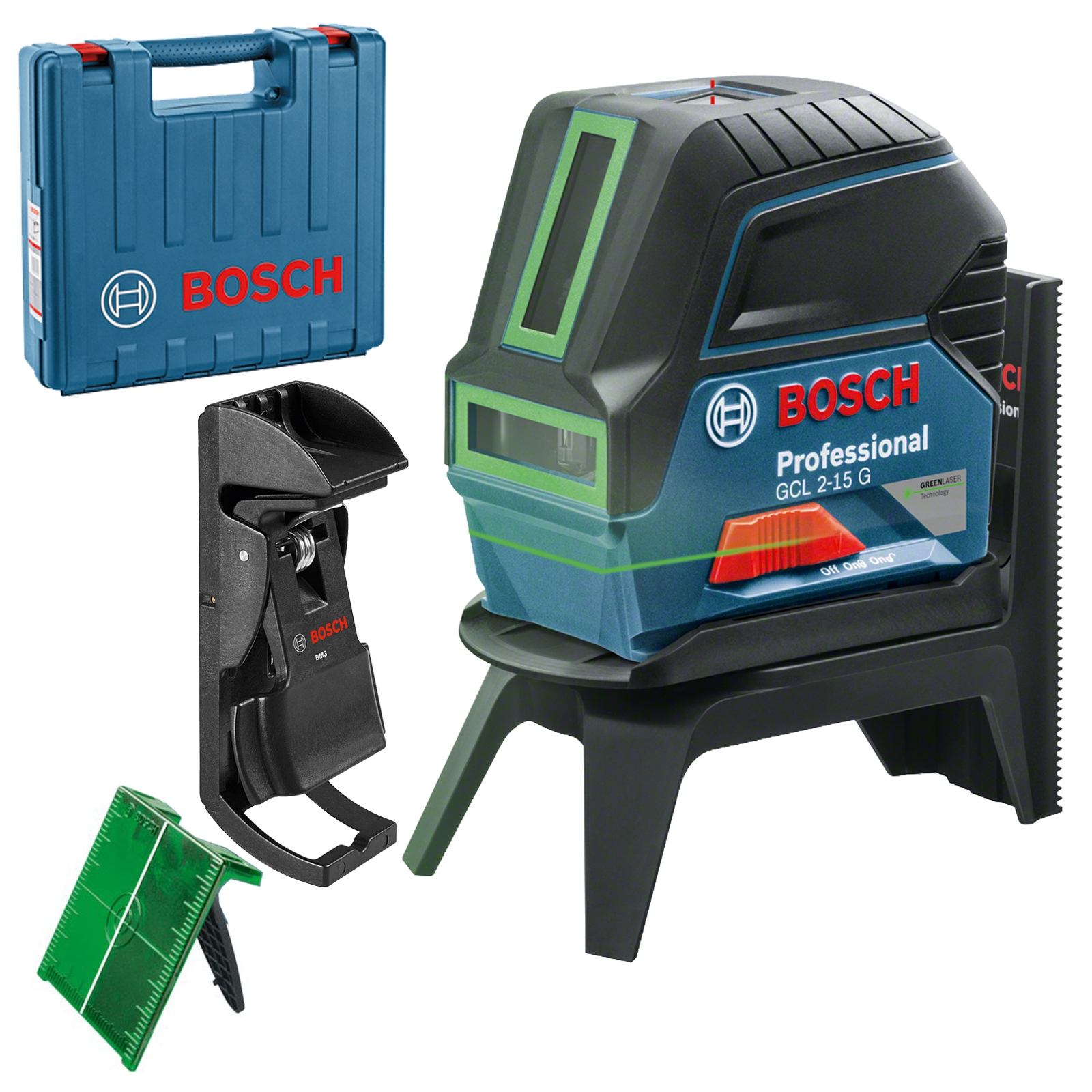Akár négyszer jobban látható a zöld lézervonalaknak köszönhetően, és sokoldalúan alkalmazható – ez a Bosch GCL 2-15 G Professional kombinált lézer. A két lézervonal precíz függőleges és vízszintes beigazítást tesz lehetővé, a piros függélyező pontokkal pedig egyszerű az alkalmazások átvetítése. A lézervonalak egyszerűen a függélyező pont köré igazíthatók a sokoldalú RM 1 Professional forgószerelvénnyel.