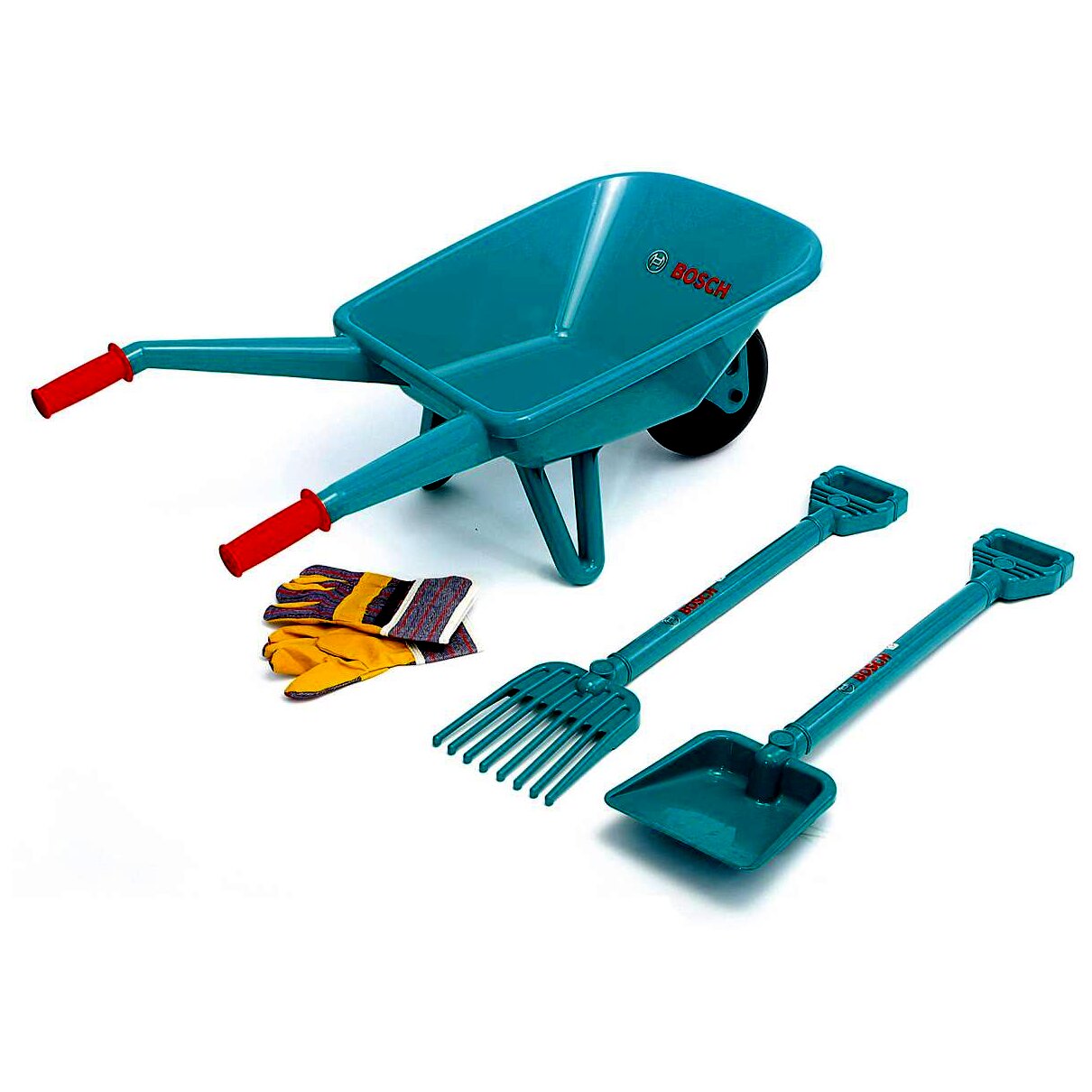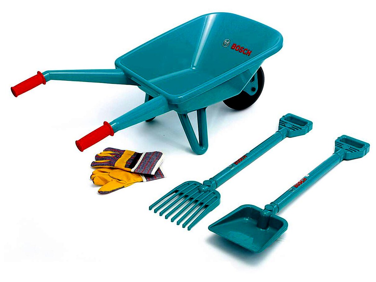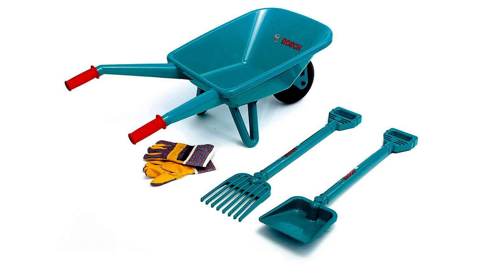 4 részes BOSCH kerti szett talicskával, lapáttal, gereblyével és kerti kesztyűvel.