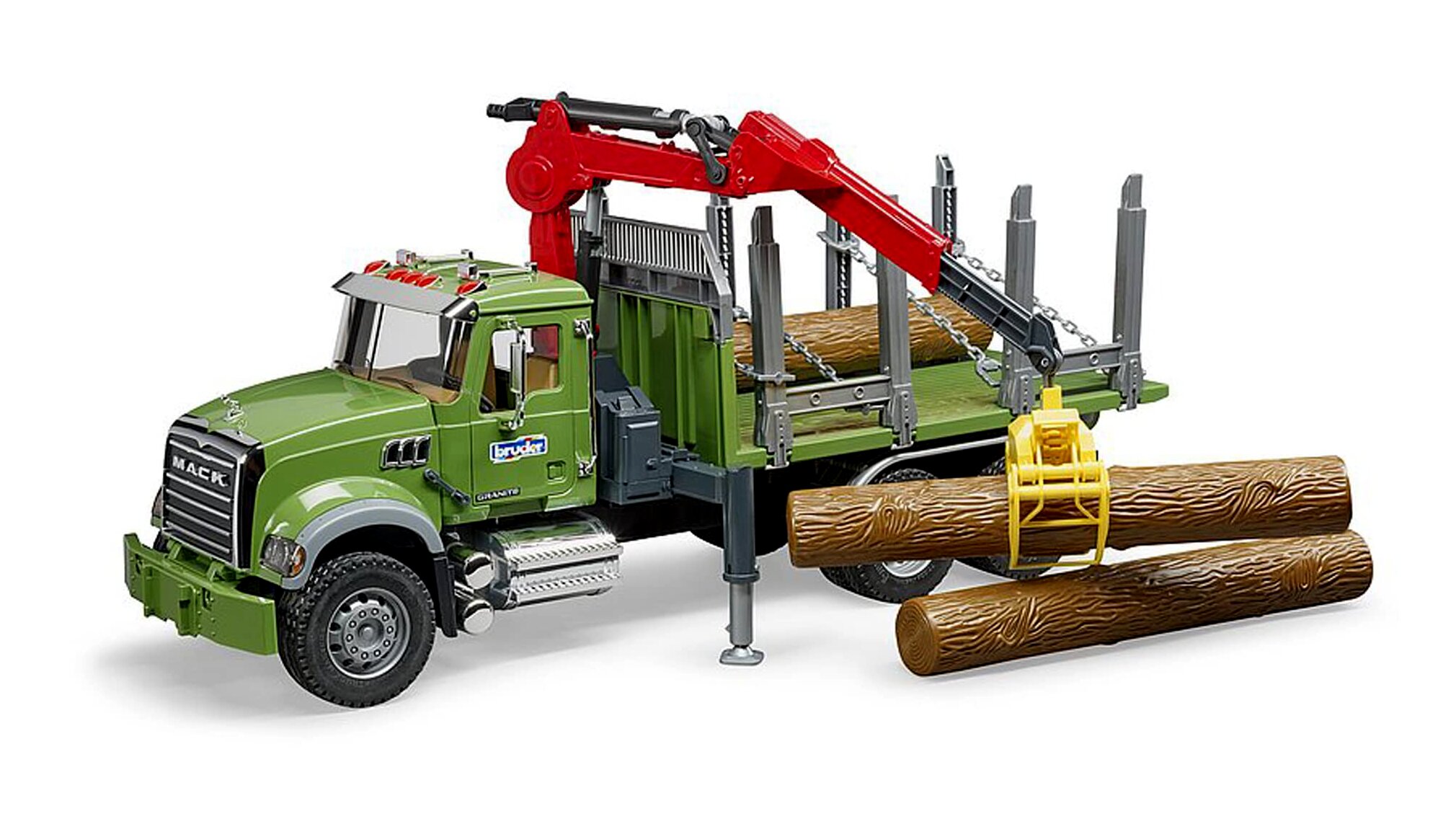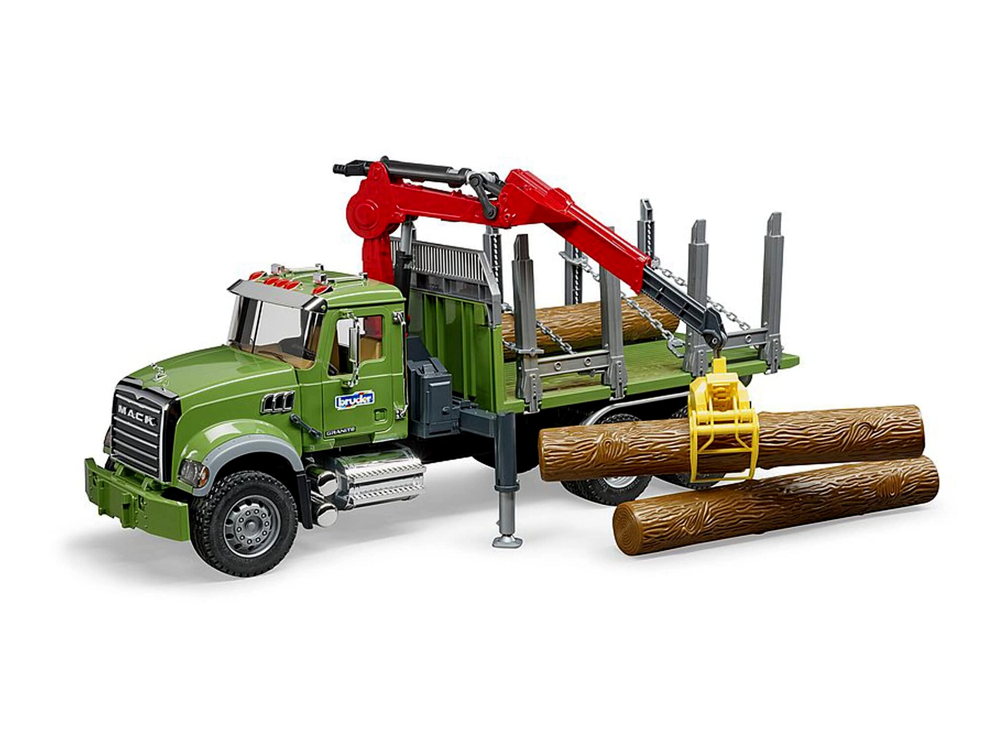 A MACK Granite teherautó farönk szállító kivitelével minden kis erdei favágó szívesen dolgozik. A részletesen kidolgozott modell méretaránya 1:16, a hasznos funkciók hosszú órákig biztosítják a szórakoztató játékot.