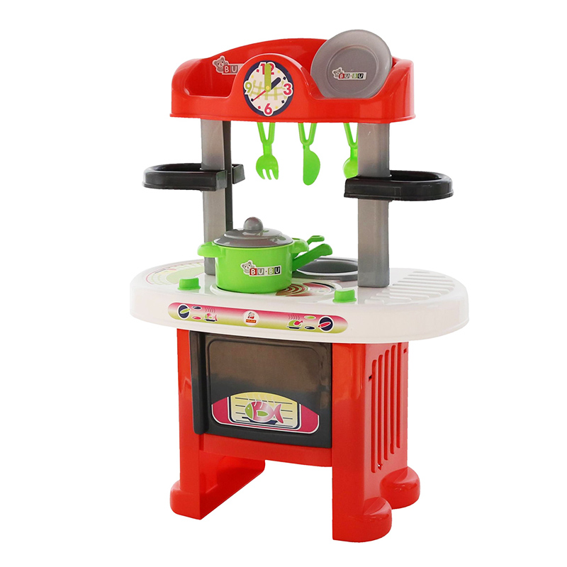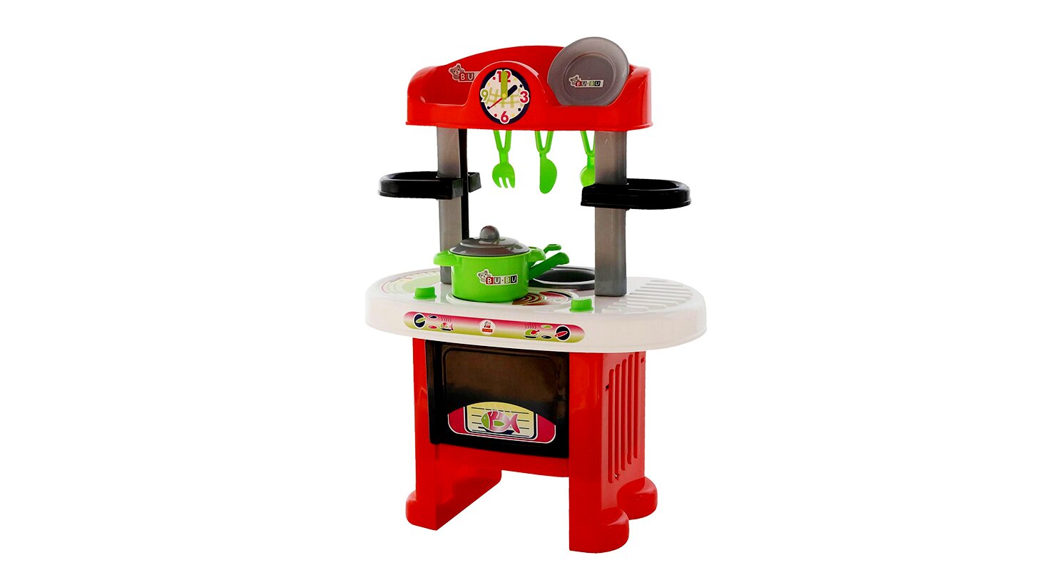 A szett tartalma: tűzhely, sütő, mosogató, 1 db fazék, 1 db tányér, 1 db kanál, 1 db villa, 1 db kés. A sütő ajtaja nyitható.