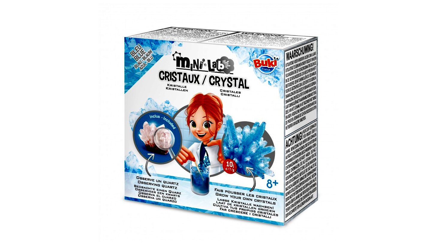 A BUKI Mini Lab kristálynövesztő készletével a gyerekek tudósnak érezhetik magukat, és a dobozban rejlő alapanyagok segítségével elkészíthetik saját kristályukat. Csupán össze kell keverni a színes kristályport vízzel, majd várni, amíg megtörténik a csoda: az eredmény egy csodálatos, kék színű kristály lesz. A készletben egy kvarc is rejlik, amit a gyerekek közelről tanulmányozhatnak a nagyító segítségével. Kísérletezésre fel!