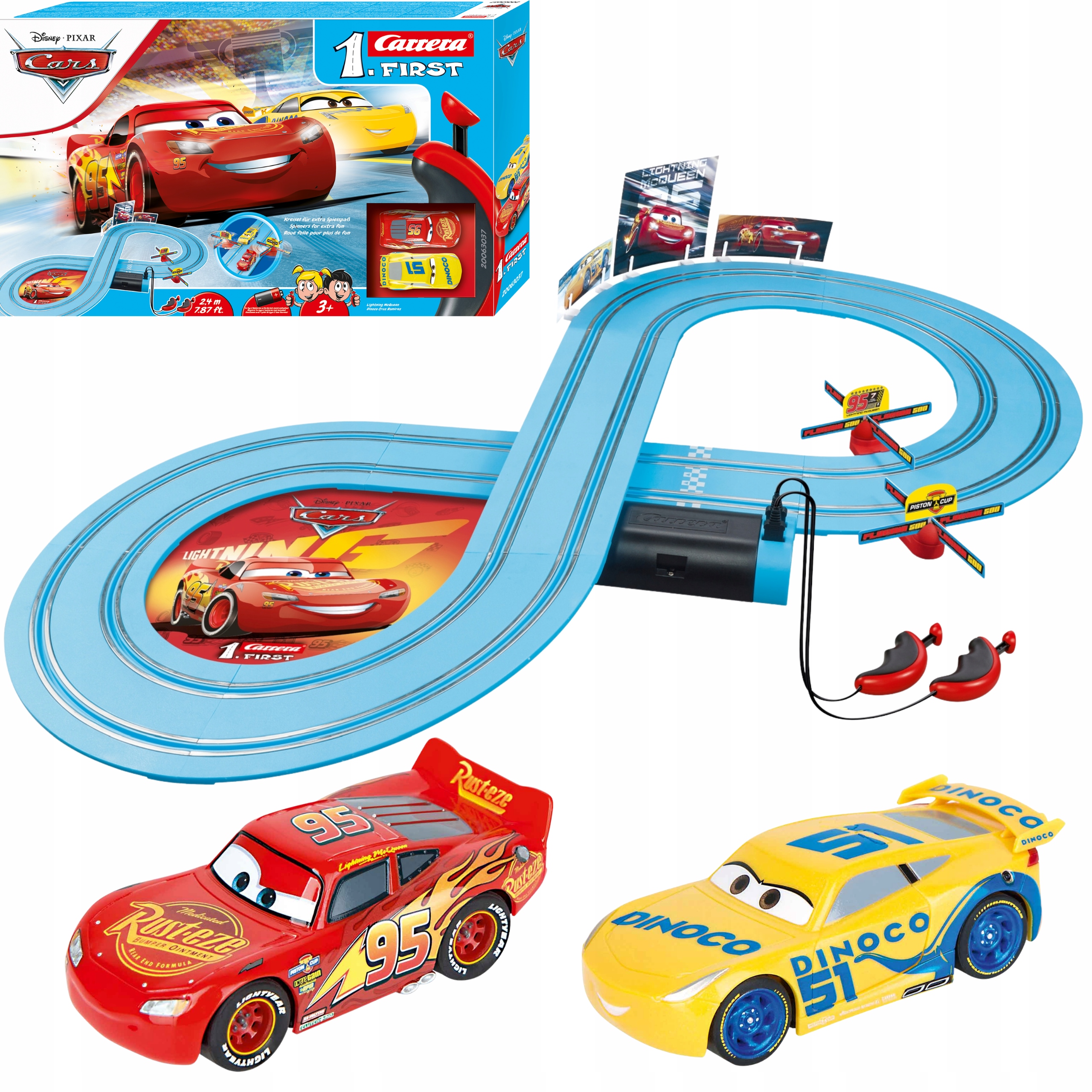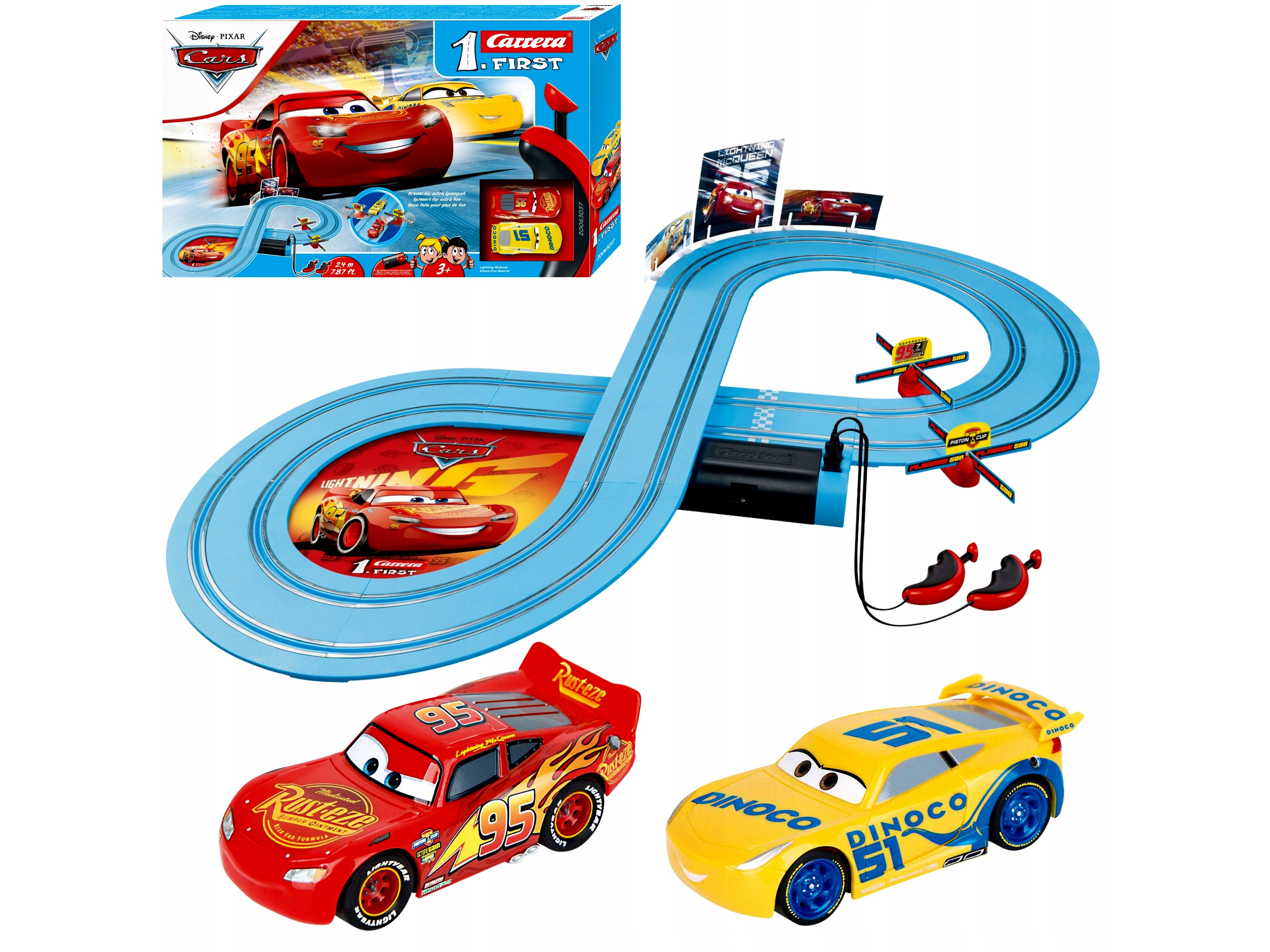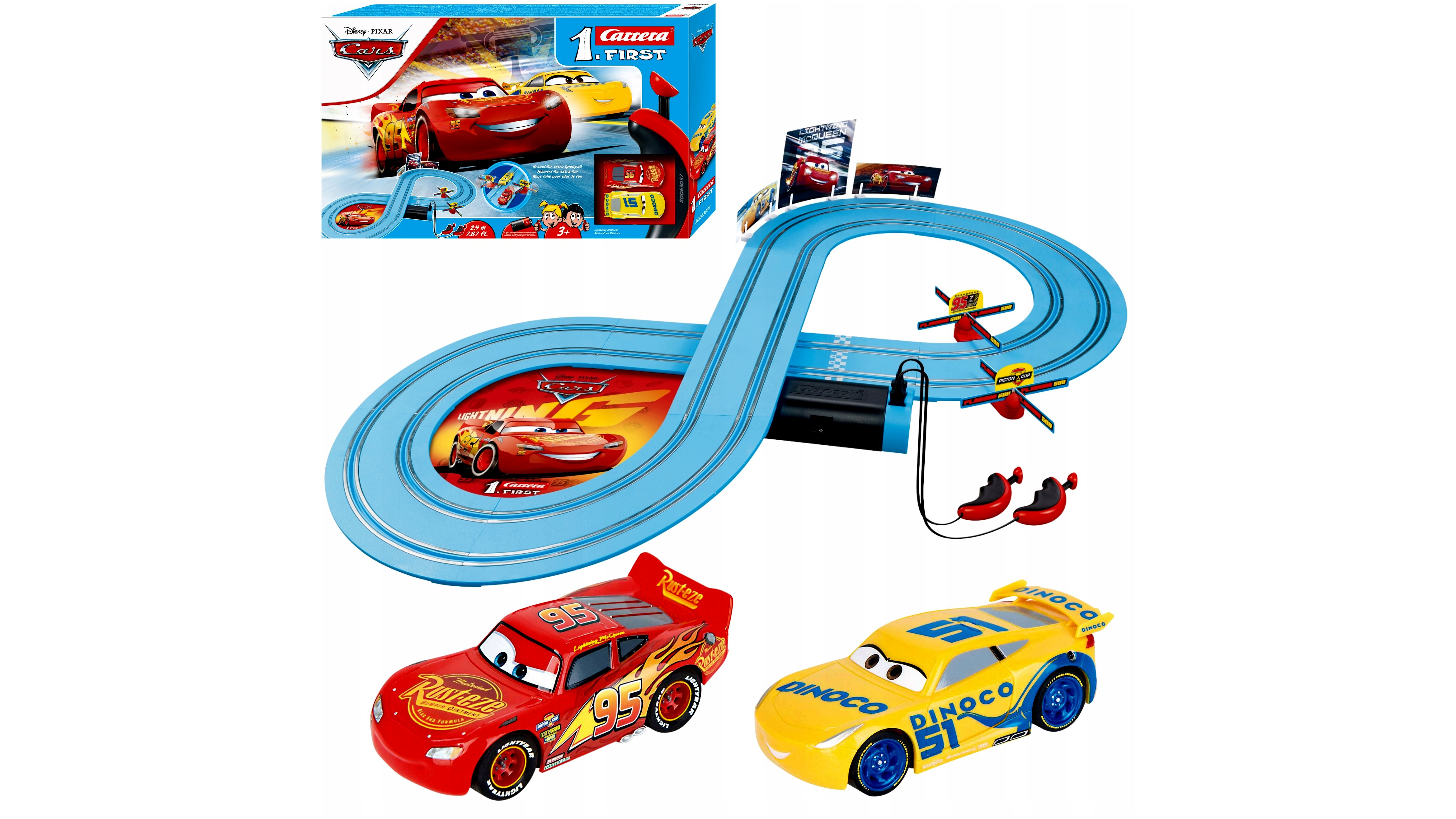 Igazi öröm vezetni a csomagban található 2 darab, 1:50-es méretarányú kisautót. Villám McQueent és Dinoco Cruz Ramirezt is kettős áramszedővel szerelték, így növelve a tapadást a pályán.