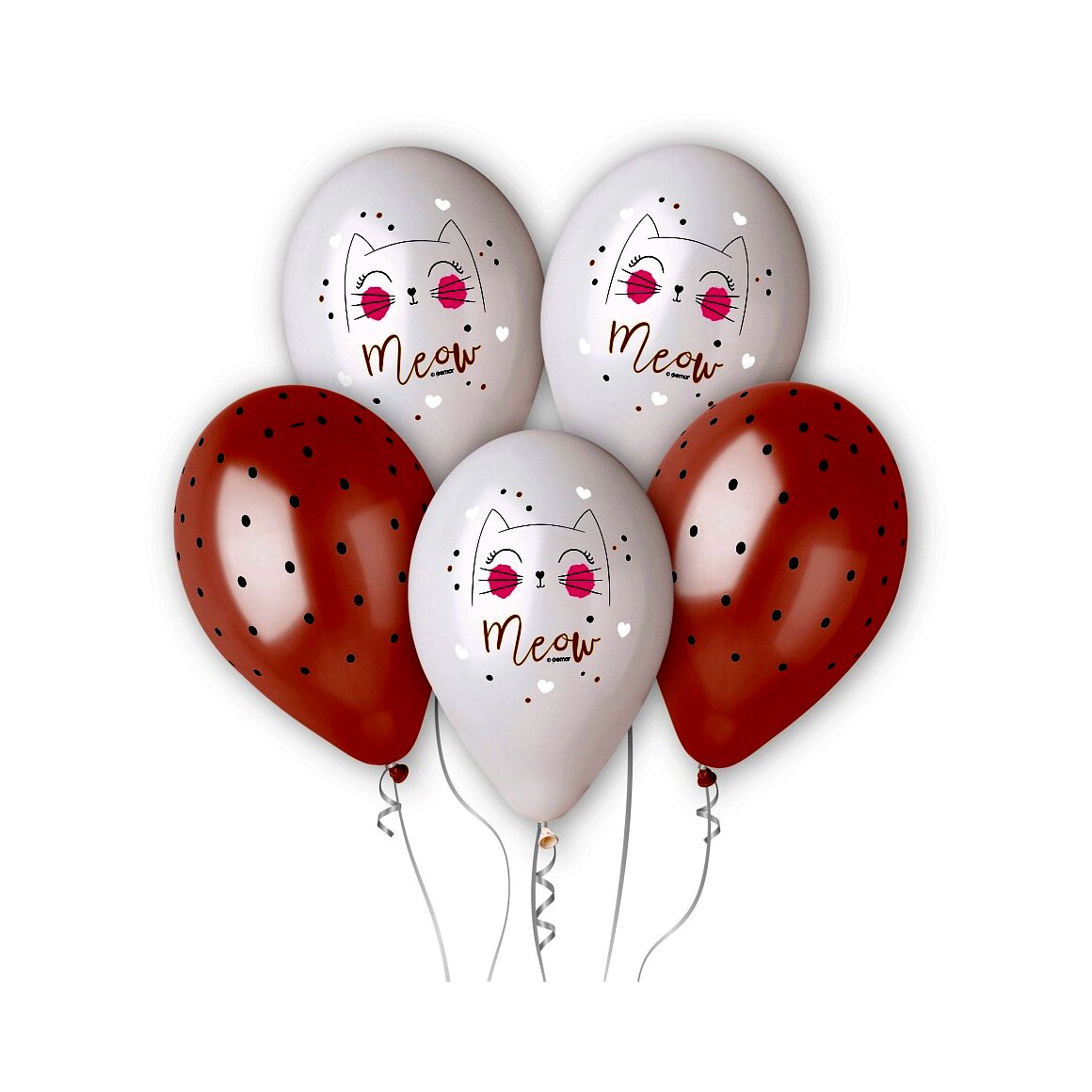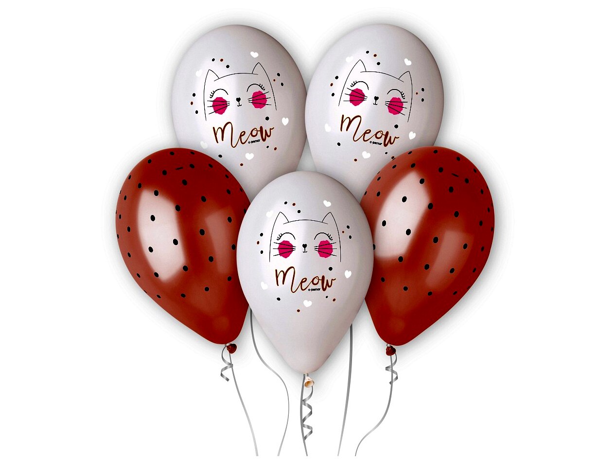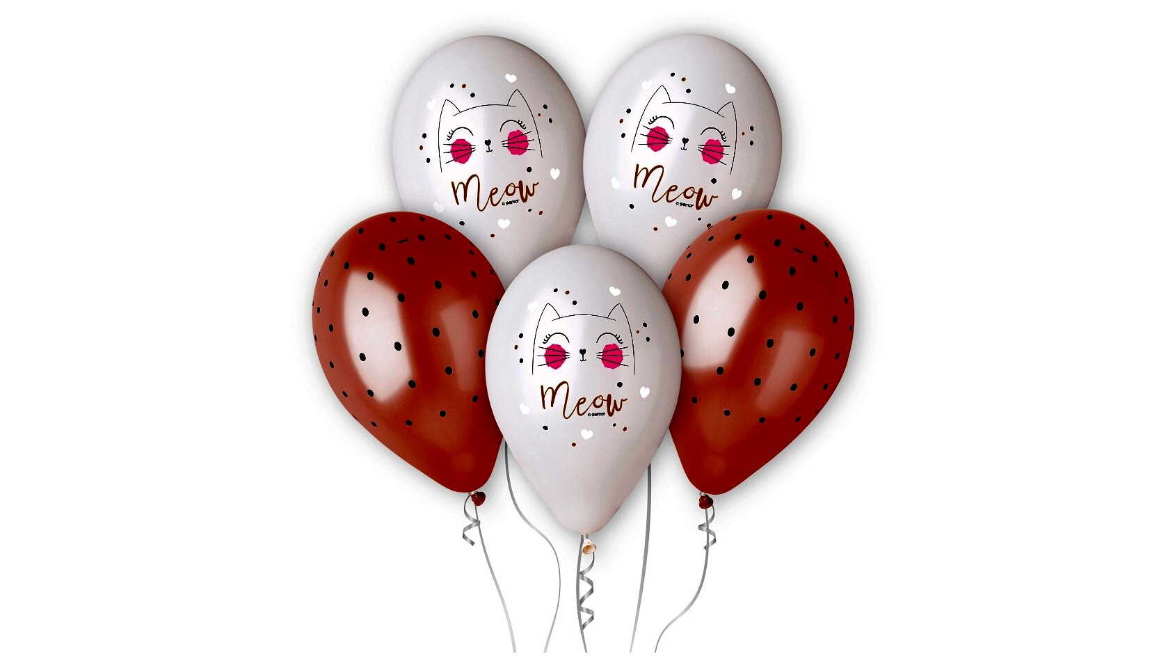 Cica mintával díszített pöttyös fehér és mályva színű prémium lufi csomag. Tökéletes választás ünnepi dekorációnak vagy ajándéknak is.