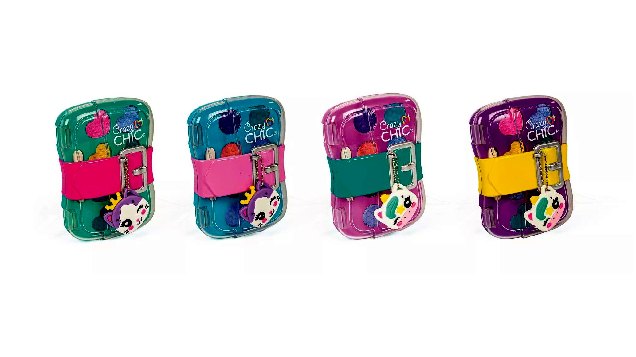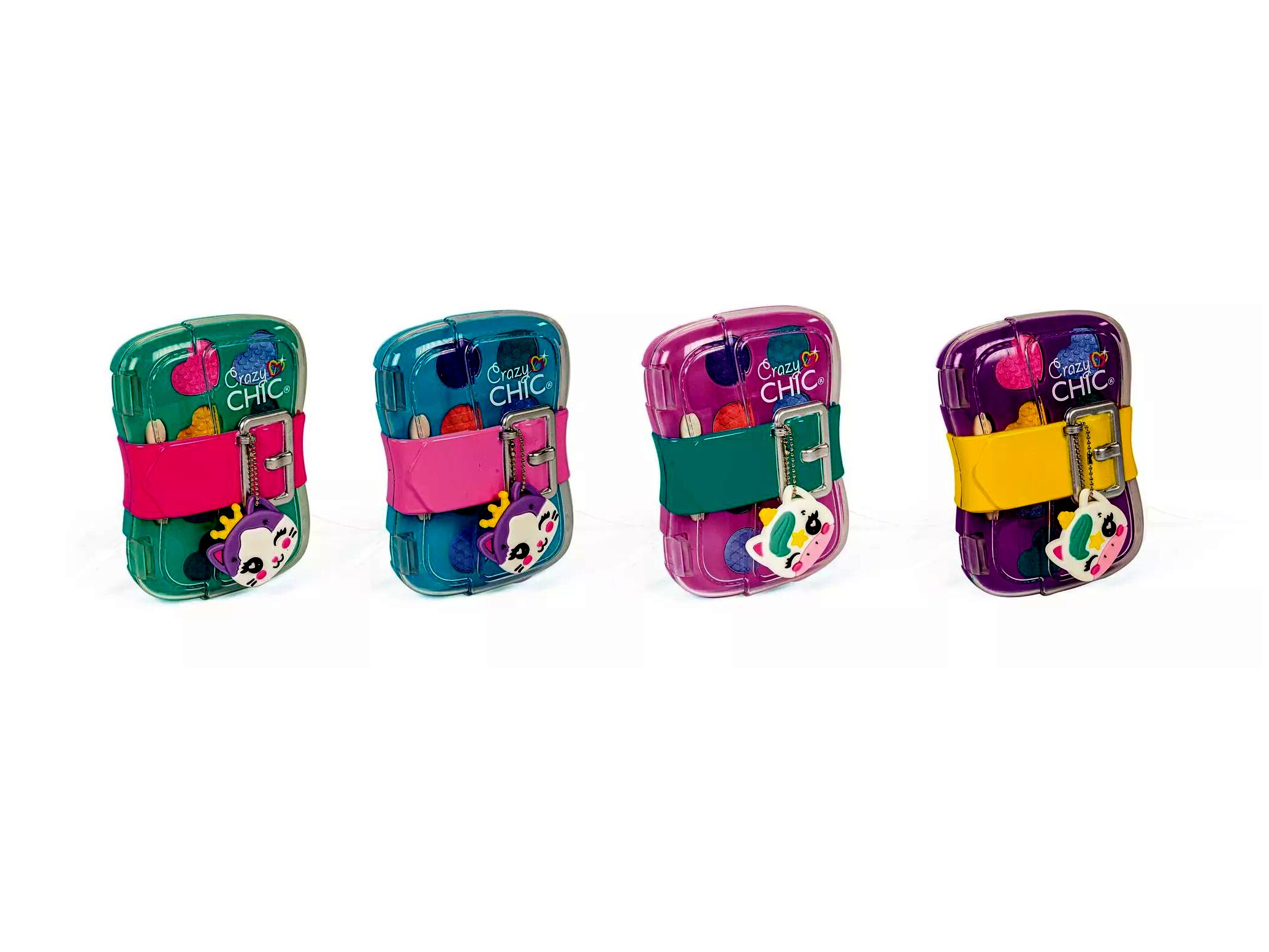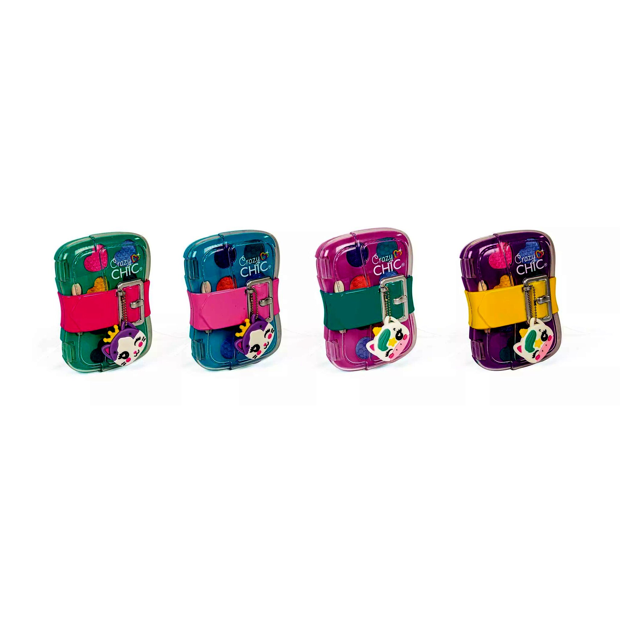 A Crazy Chic mini kozmetikai készlet egy kompakt, hordozható sminkes készlet kislányoknak, amellyel játékosan kipróbálhatók különböző szemhéjfesték-színek. A kis táska kialakításának köszönhetően könnyű magaddal vinni, így otthon vagy utazás közben is kéznél lehet.