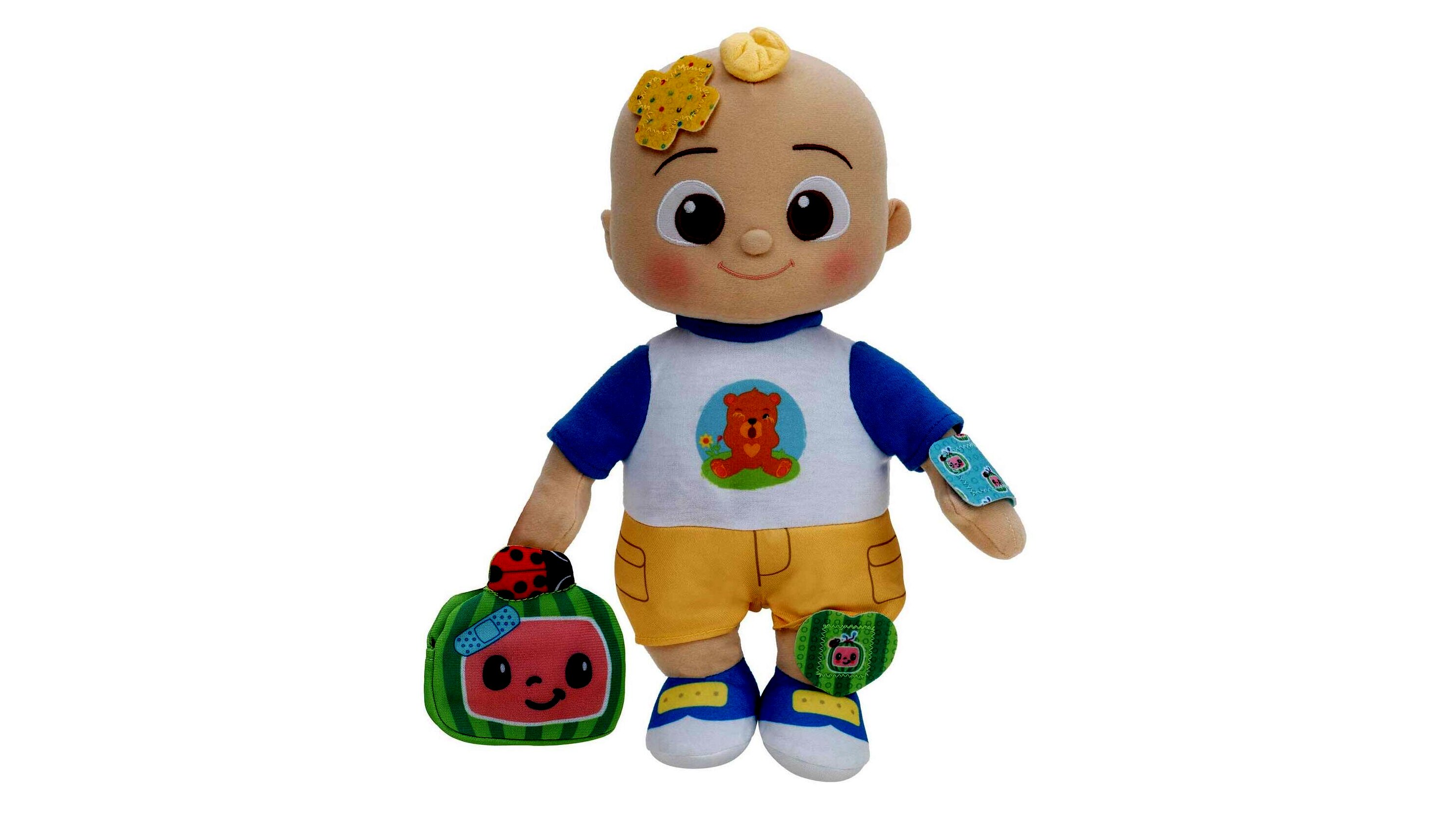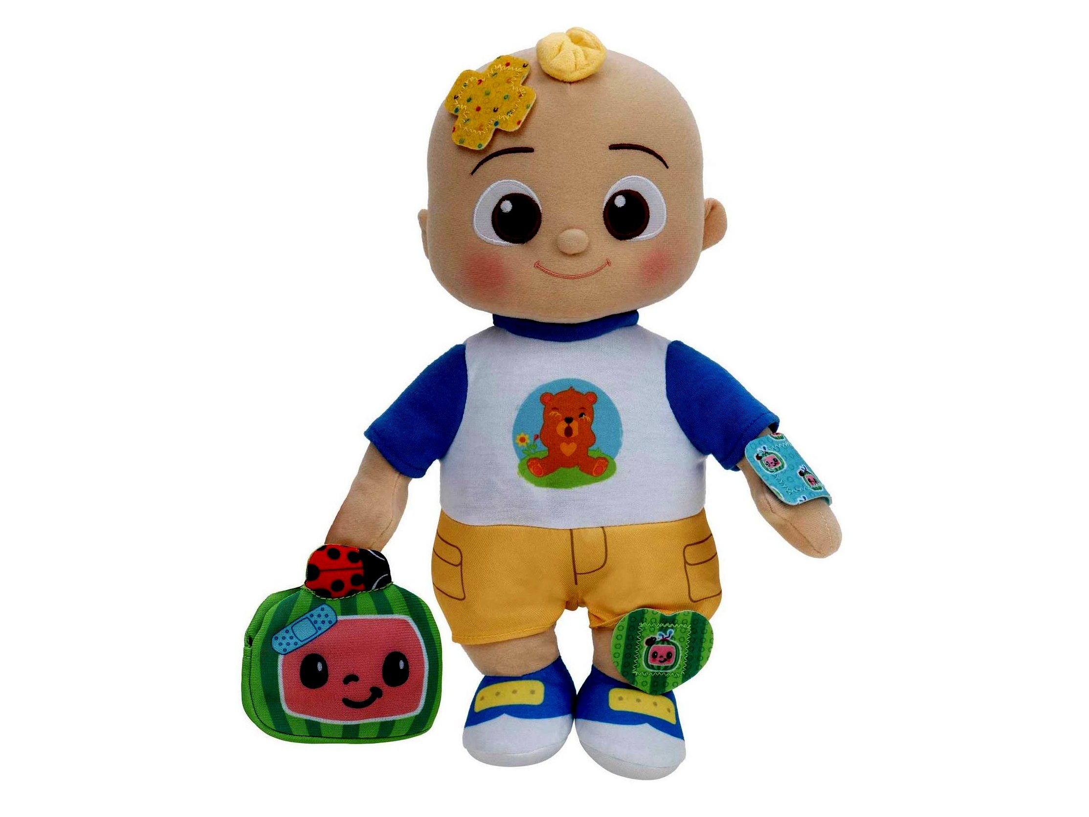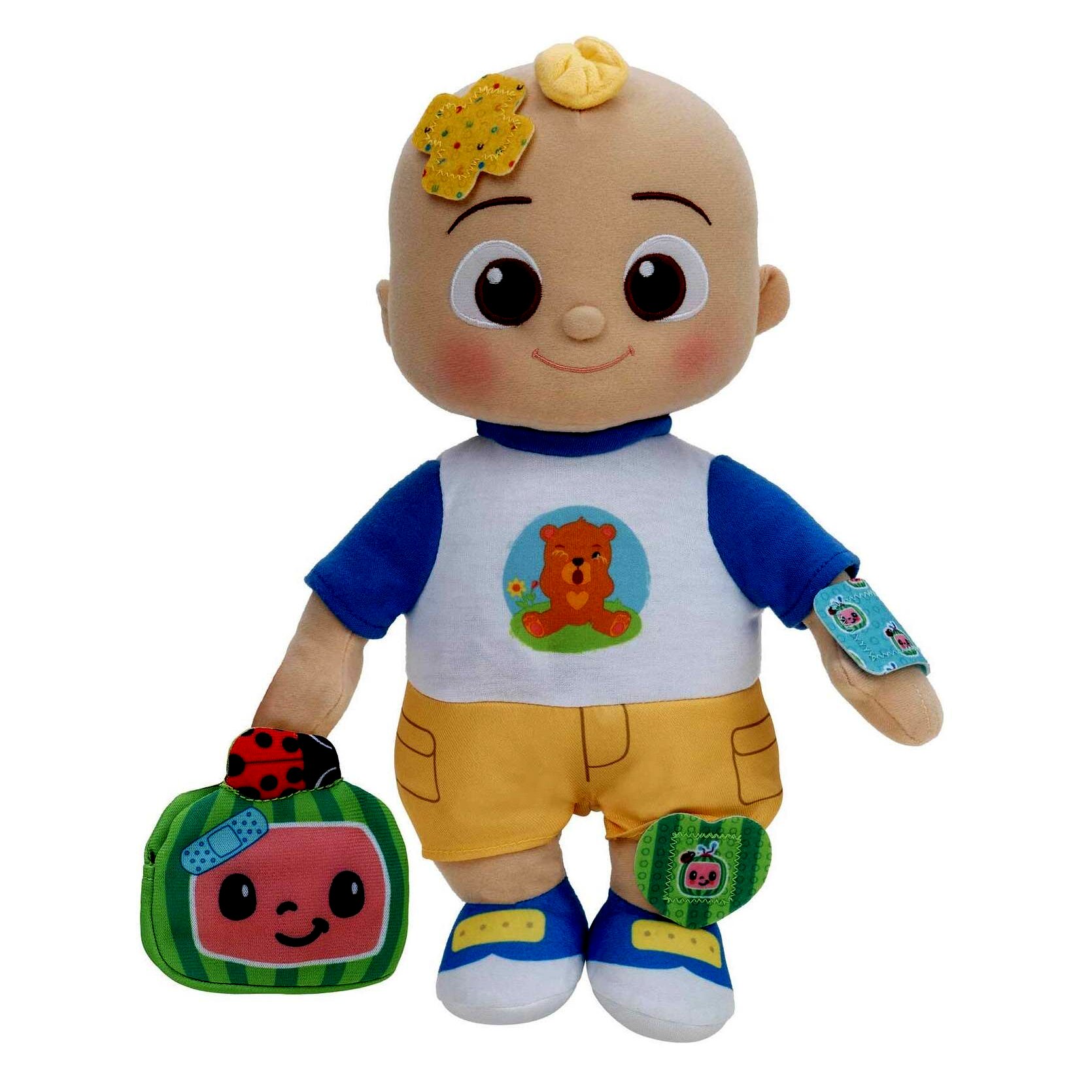 A CoComelon Boo Boo JJ plüss segítségével JJ megmutatja, hol sérült meg, legyen az a fején, könyökén, térdén vagy lábfején. Ezek a területek világítanak, hogy gyermeke gyorsan segítségére tudjon jönni. A kötszertároló három CoComelon témájú kötszert/ragtapaszt tartalmaz. JJ reagál, ha megsérült, majd amikor meggyógyult.