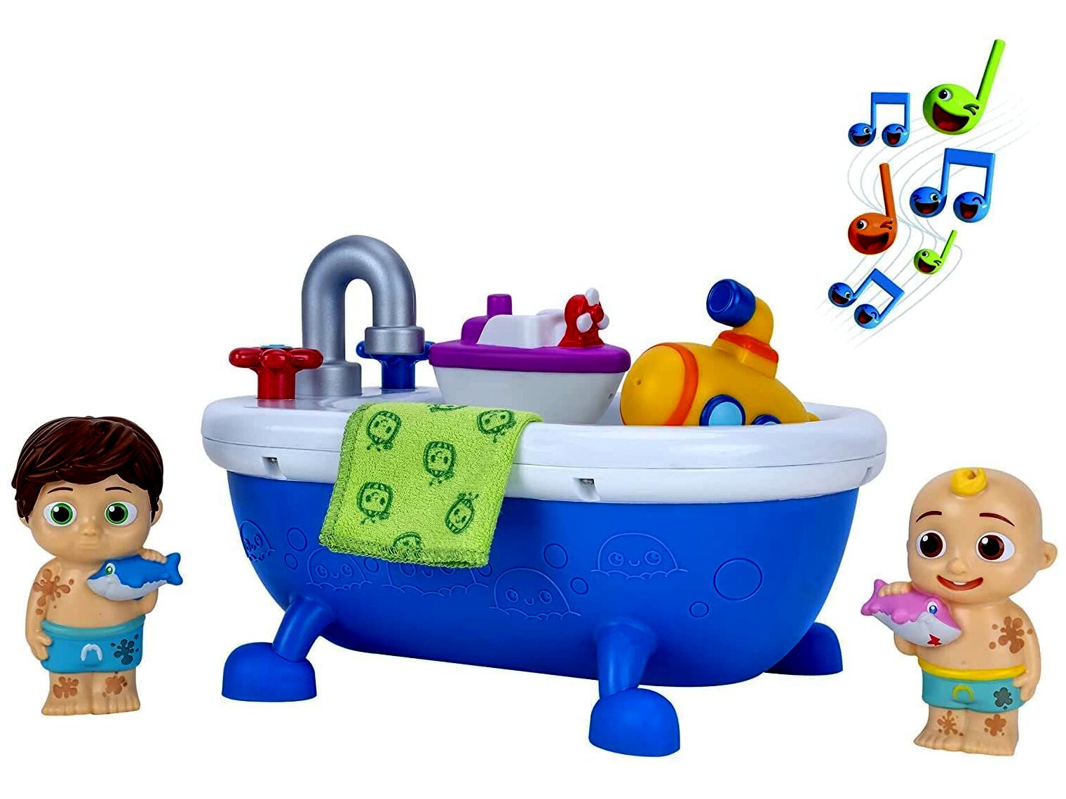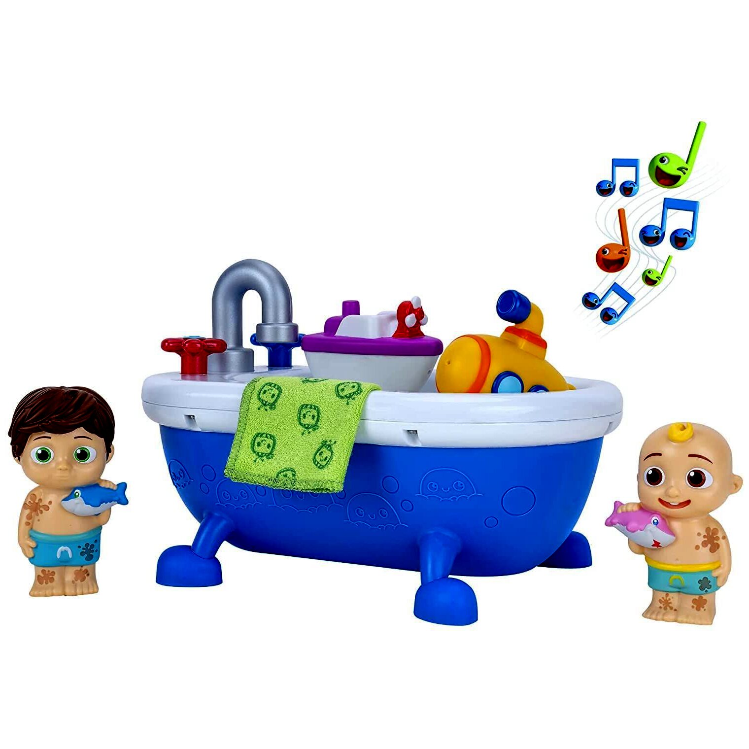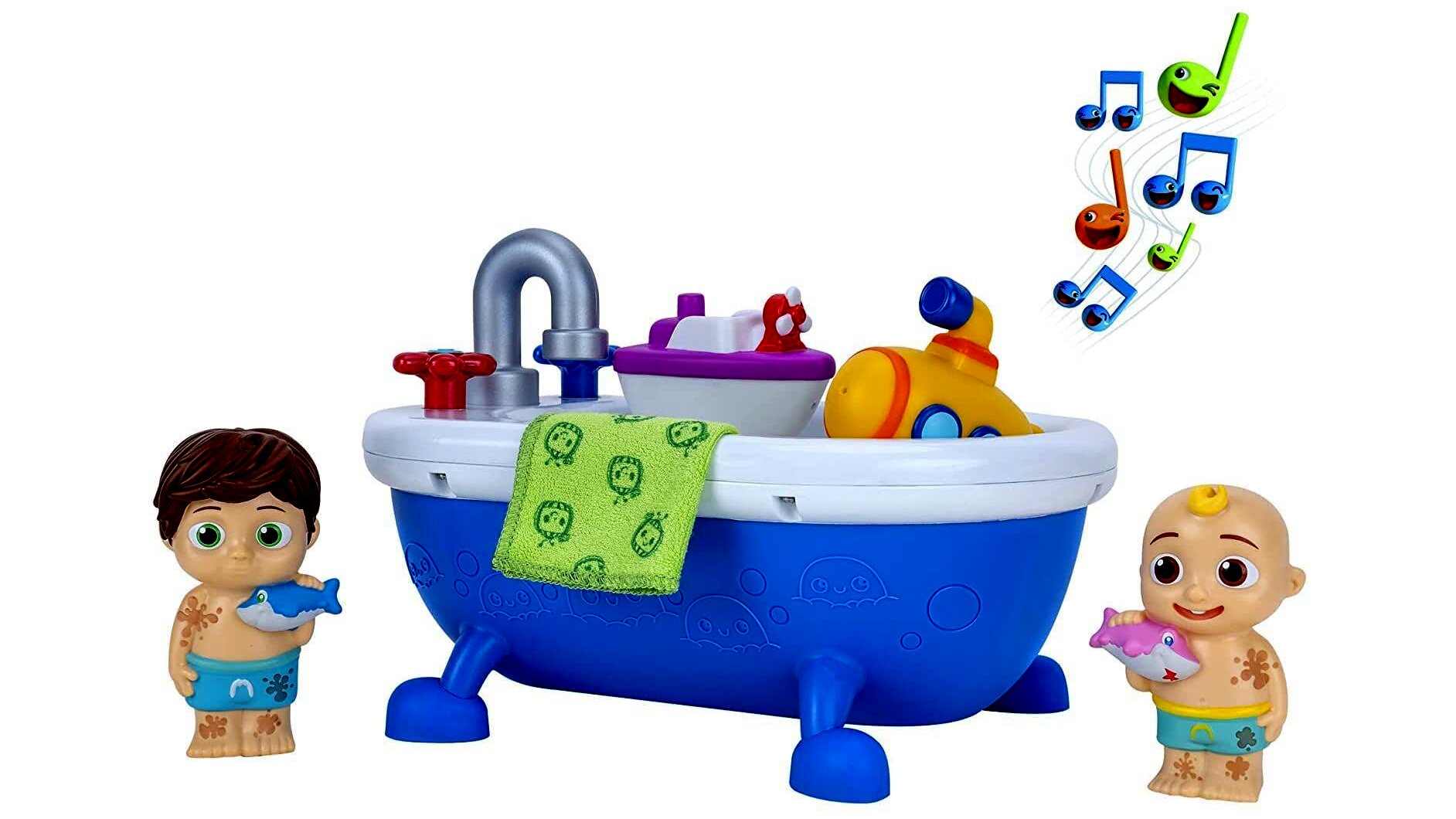 A dal közvetlenül a CoComelon slágersorozatból, segít megtanítani a kicsinek, hogyan fürödjenek meg! Bár a játékot nem lehet vízbe meríteni, a játékkádat megtöltheti vízzel. Imádni fogják nézni, ahogy a két CoComelon figura – JJ és TomTom – hideg színváltoztatáson megy keresztül, ami „piszkosból” „tisztává” varázsolja a fiúkat a tisztítókendővel megtisztítva őket! A színváltozást a víz aktiválja.