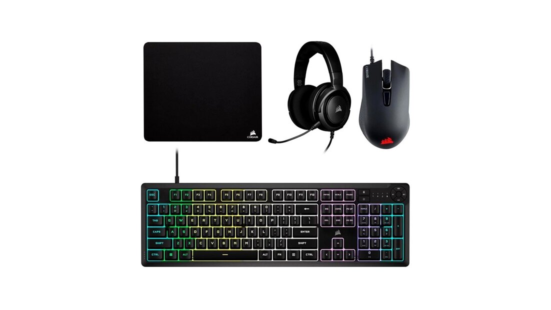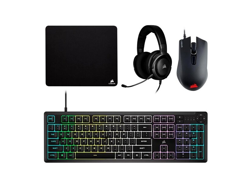 Corsair K55 CORE RGB billentyűzet 4in1 szett (amerikai - US, gamer, 4 az 1-ben: billentyűzet+egér+fejhallgató+egérpad, vezetékes, fekete)