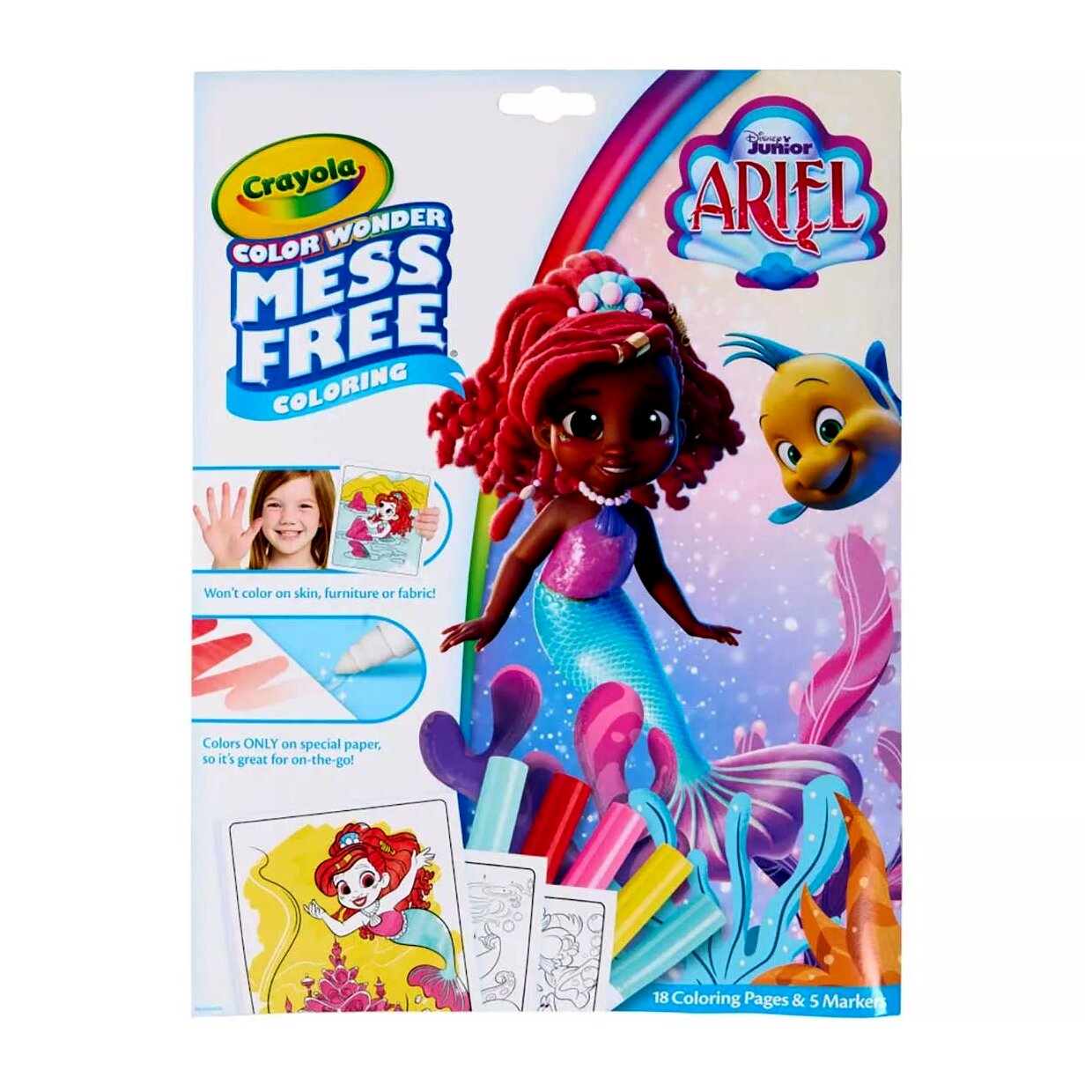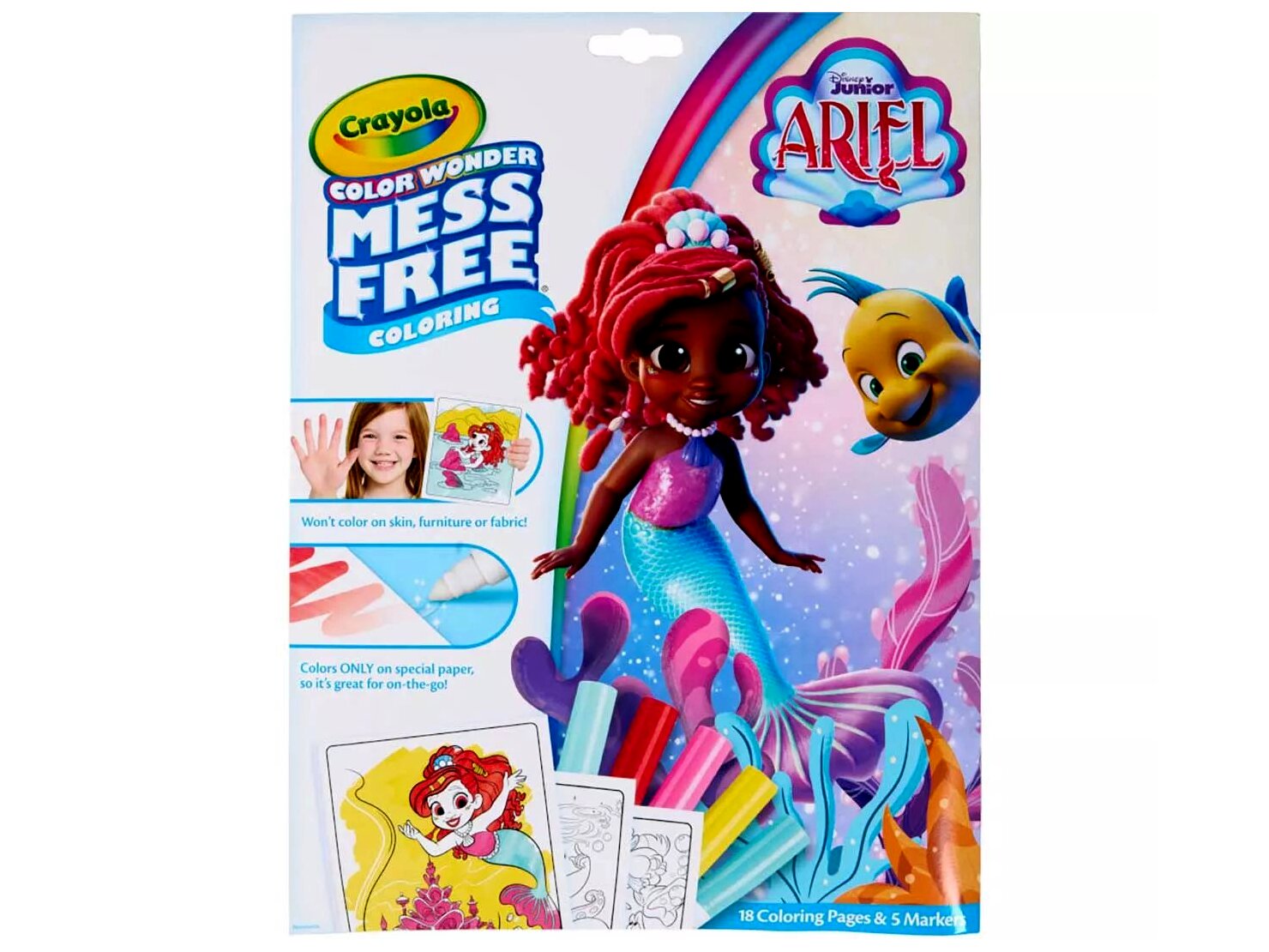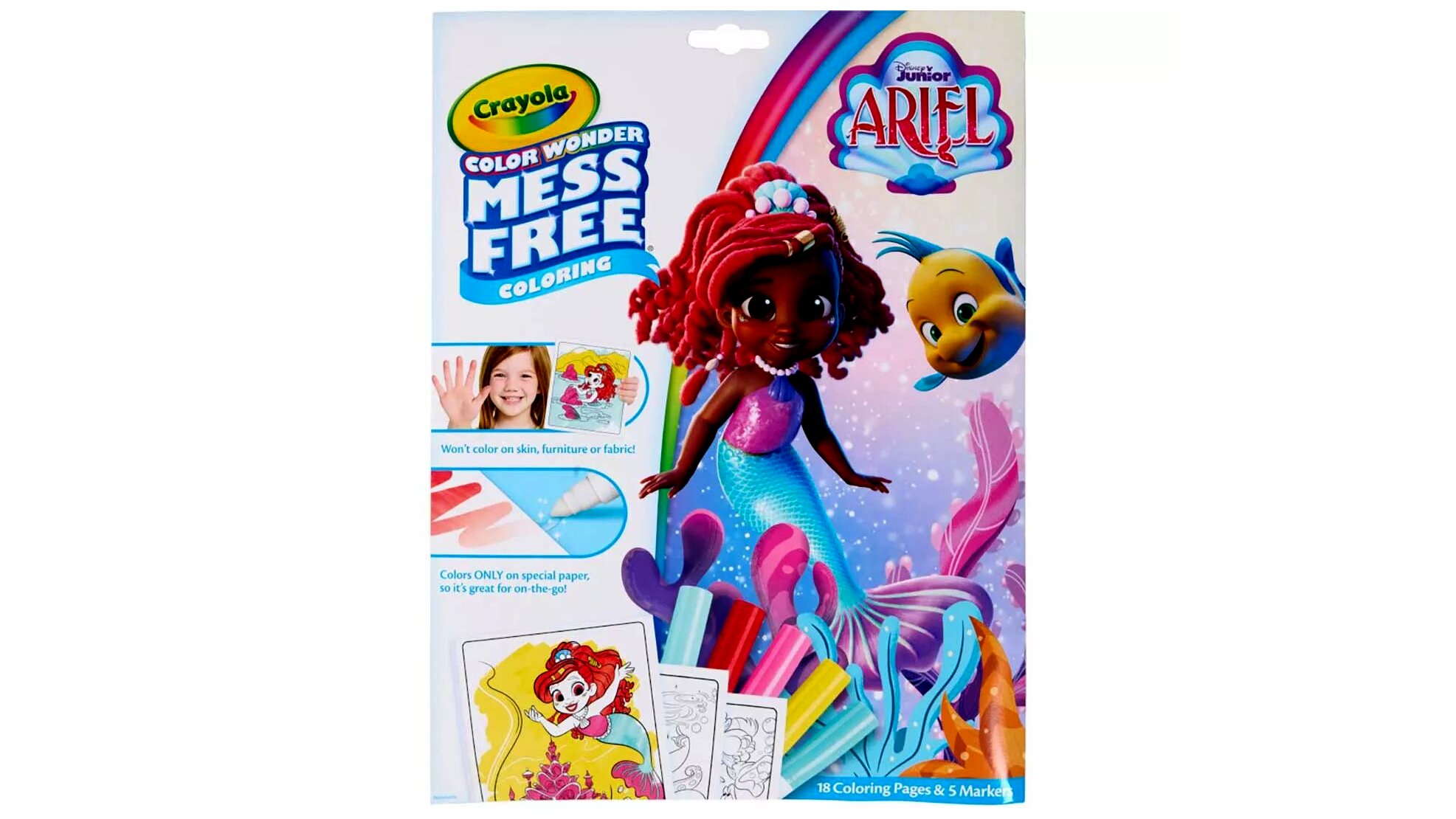 Varázslat! A Crayola Color Wonder termékekkel a gyerekek maszatmentesen alkothatnak, ugyanis ezek a filctollak sehol máshol nem hagynak nyomot, csakis a Color Wonder kifestőlapokon.Ebben A kis hableány maszatmentes színező csomagban Arielt és barátait ábrázoló képeknek adhatnak új színt a színezni szerető gyerekek. A dobozban a 18 színezőlap mellett 5 különböző színű filctoll kapott helyet, amelyek nem hagynak foltot a bőrön, a különböző szöveteken vagy a bútorokon, csak a készletben található speciális papíron. A praktikus mappában tárolható készletet a gyerekek magukkal vihetik a nyaralásokra, utazásokra - hiszen nincs is jobb, mint egy kis alkotással elütni az időt.
