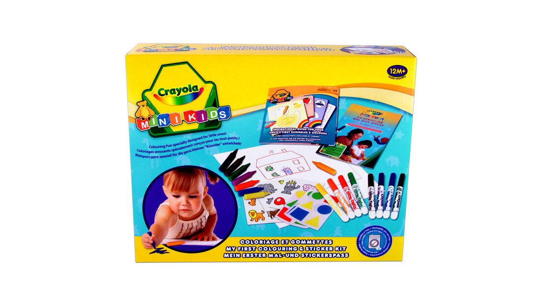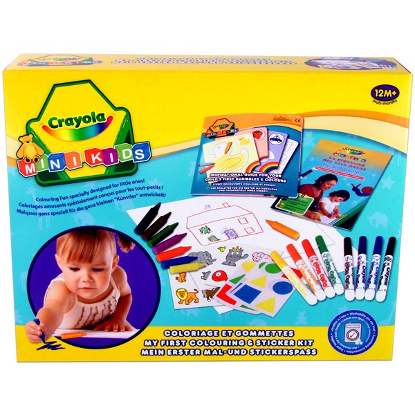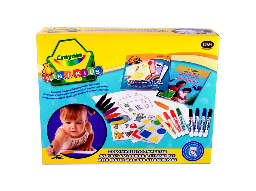 Pici kezekre tervezett kreatív készlet, amivel a gyerekek matricákkal díszített képeket tudnak rajzolni. A csomagban zsírkréták, színes filctollak és különbözõ fajta matricák kaptak helyet, amik segítségével játékosan fejlõdnek a finommotoros készségek.Ha a termékeket a gyermek véletlenül a szájába veszi vagy összemaszatolja magát, aggodalomra semmi ok. A Crayola termékek veszélyes, káros anyagot nem tartalmaznak!