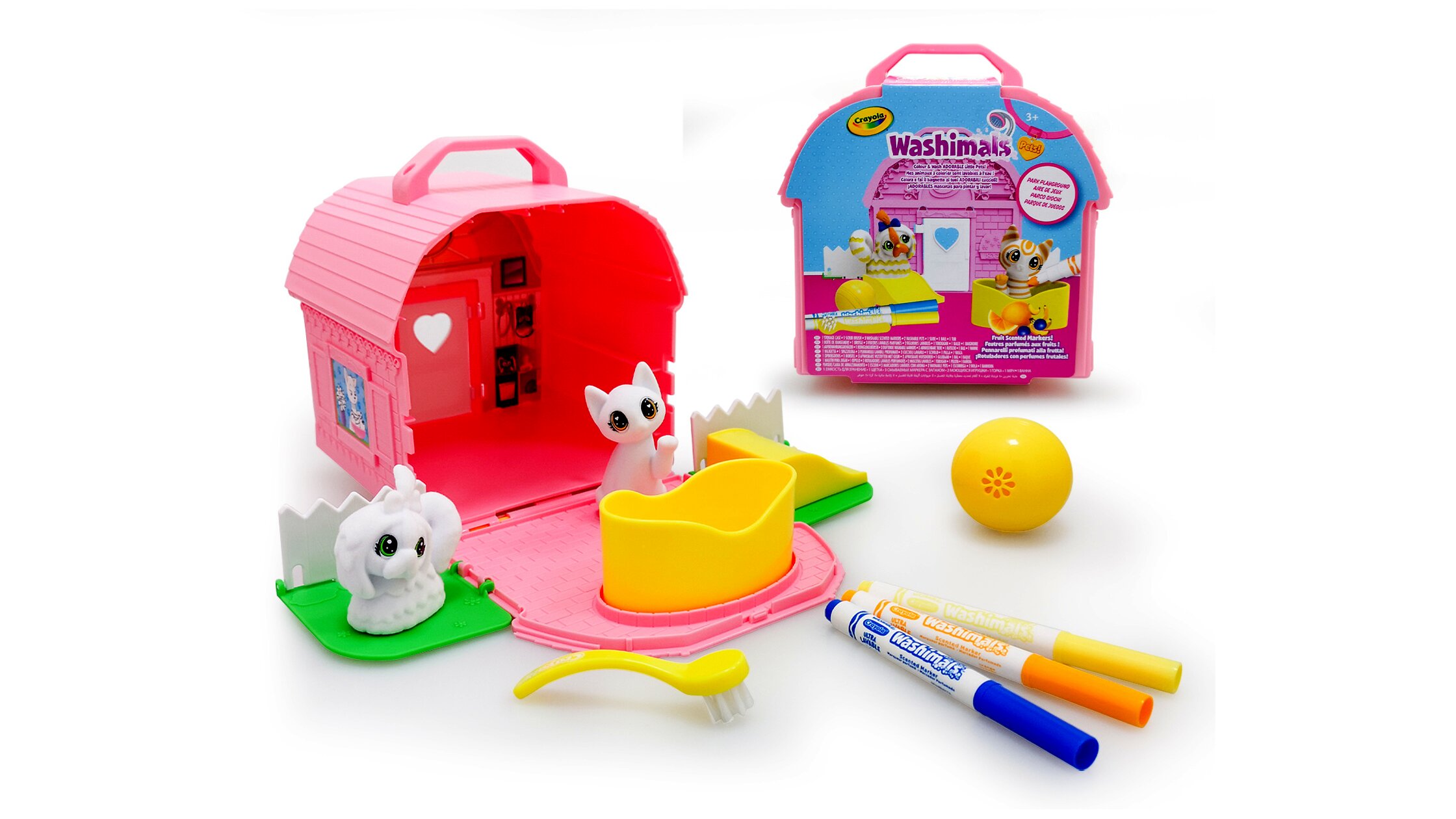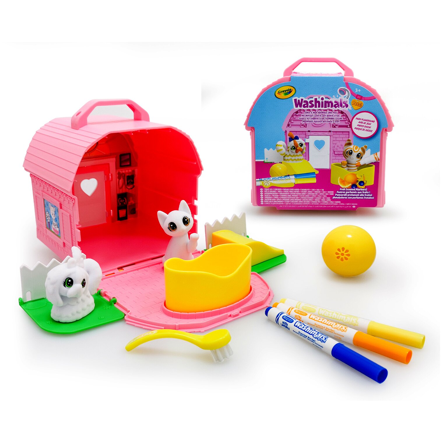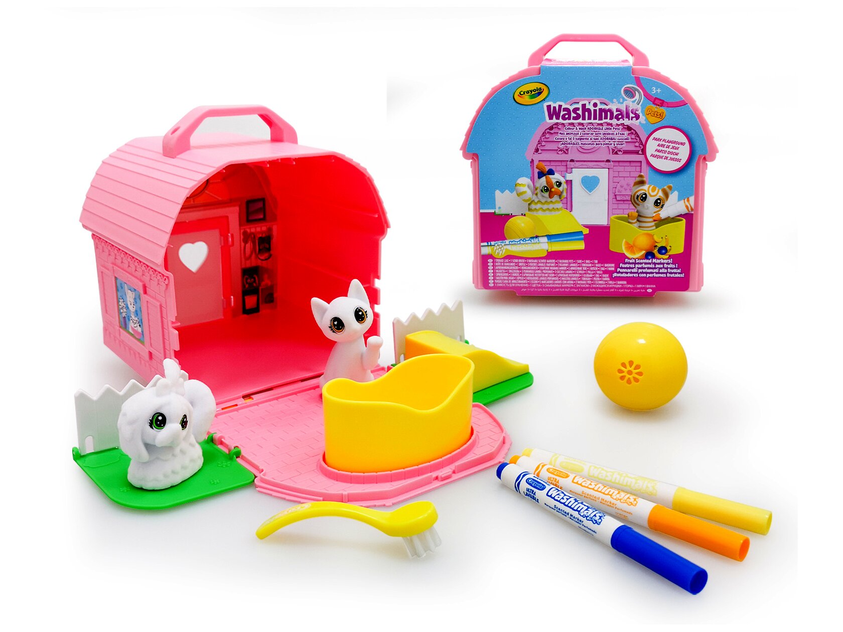 A Crayola Washimals Játék a parkban szett 2 db aranyos állatkát és egy dobozként is funkcionáló játékteret rejt. Az állatokat a gyerekek szabadon színezhetik és firkálhatnak rájuk újra és újra, ugyanis lemoshatók. A dobozban 3 db lemosható filctoll és egy kefe is található.