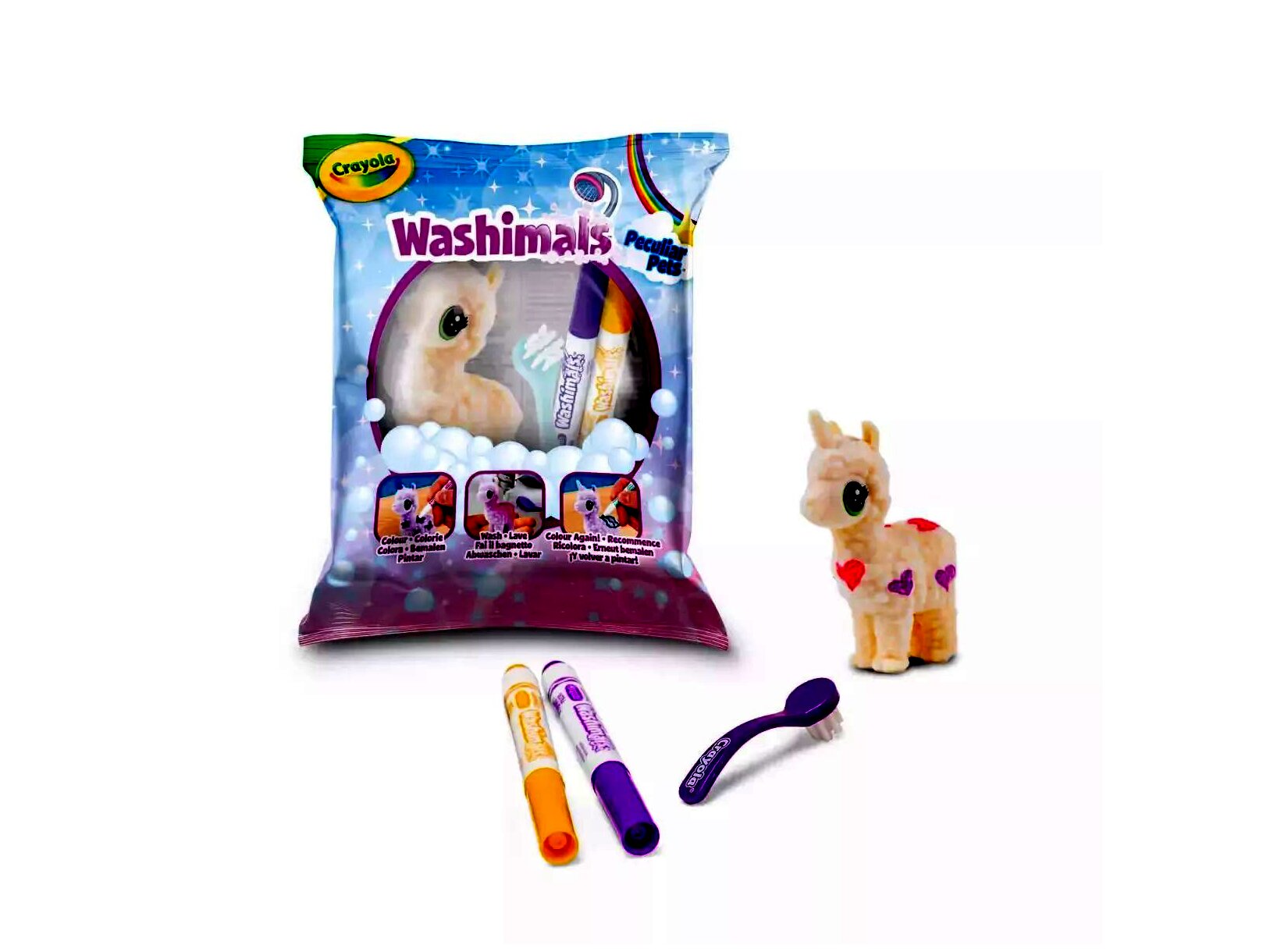 A csomag tartalmaz egy cuki egyszarvú lámát, valamint két Ultra-Clean Washable filctollat különböző színekben. A gyerekek szabadon színezhetik és dekorálhatják az állatkát, majd egyszerűen lemoshatják, hogy újra és újra elkezdhessék az alkotást.