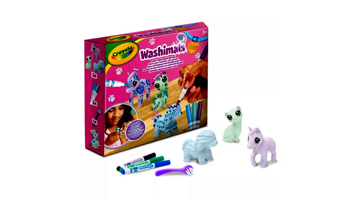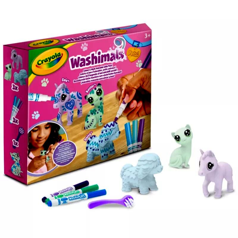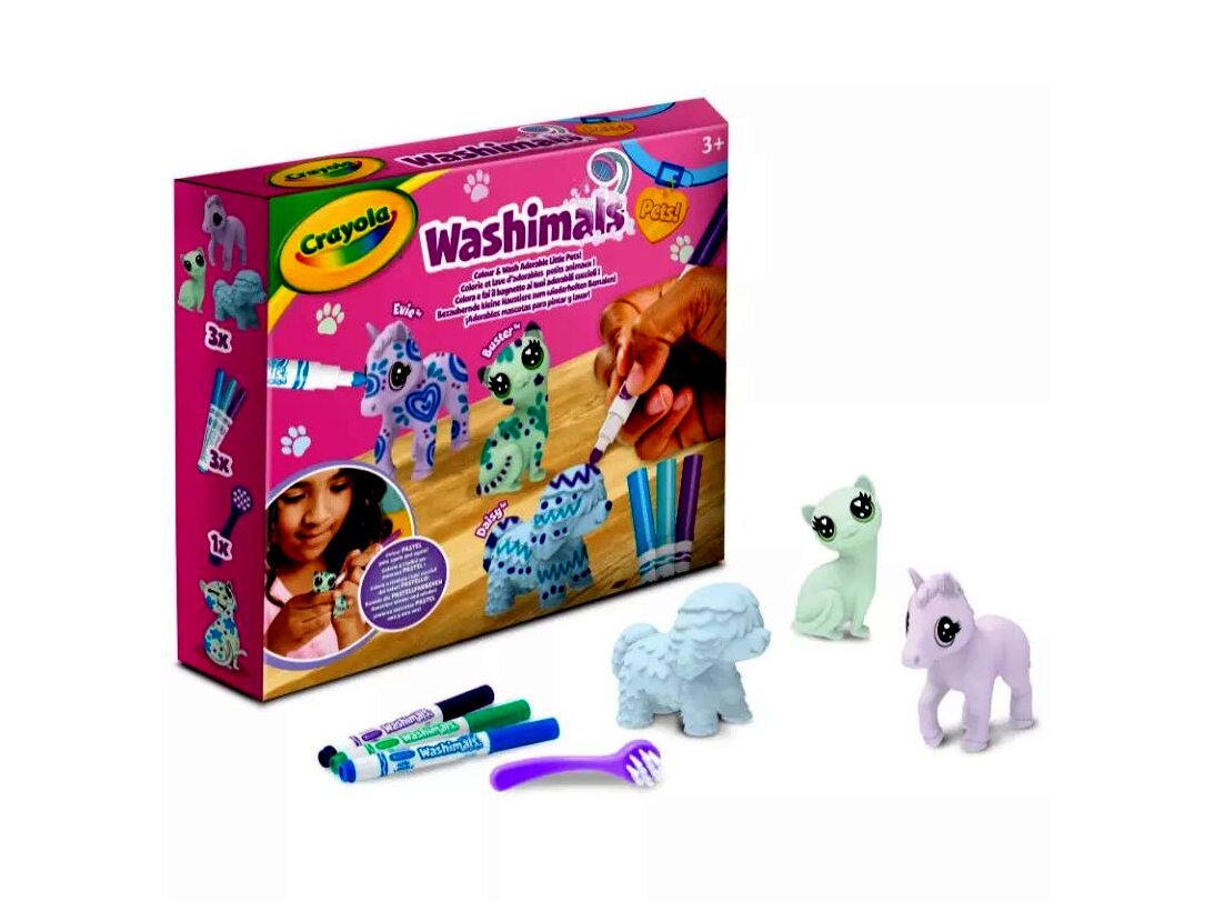 A Crayola Washimals Pasztell állatkák játékszettben 3 pasztell színű állatfigura, 3 darab különbözőszínű filctoll és egy kefe található. Ha elkészült az alkotás, elég csak lemosni az imádnivaló állatkákat, és kezdődhet is elölről a móka!