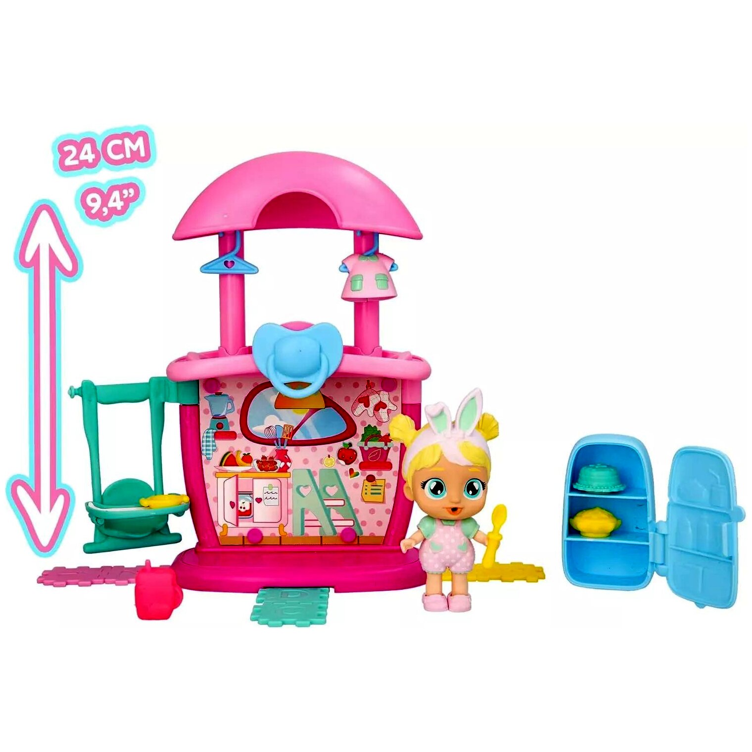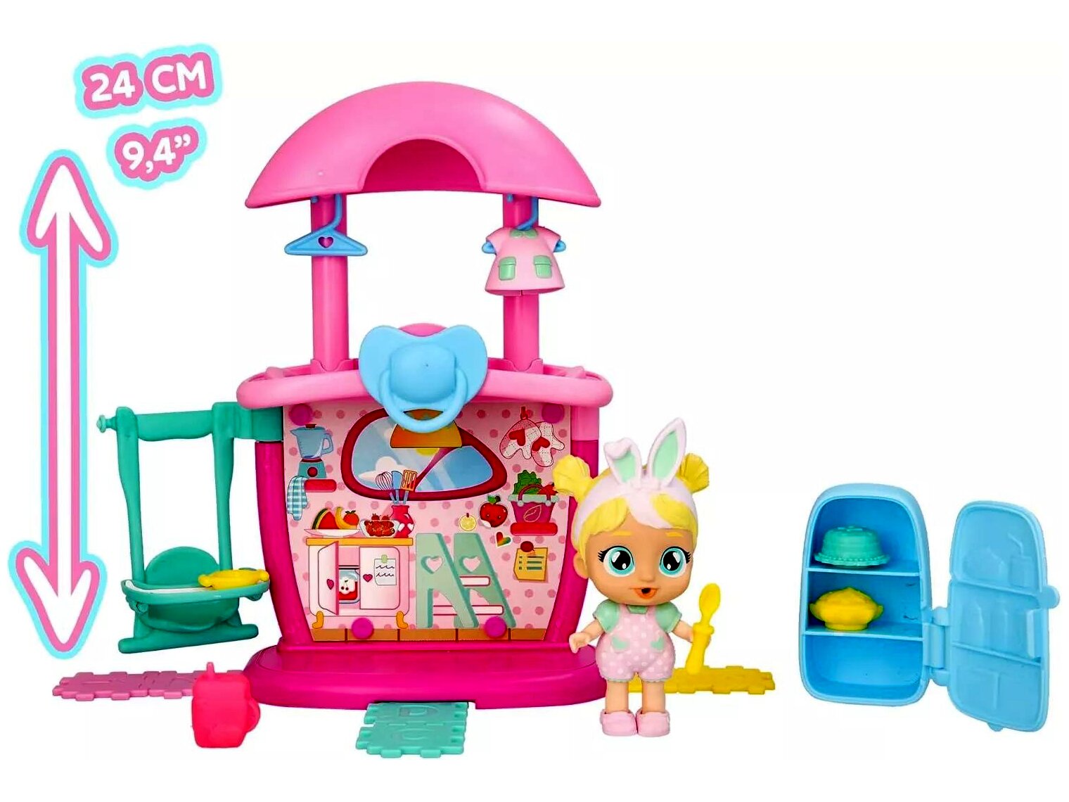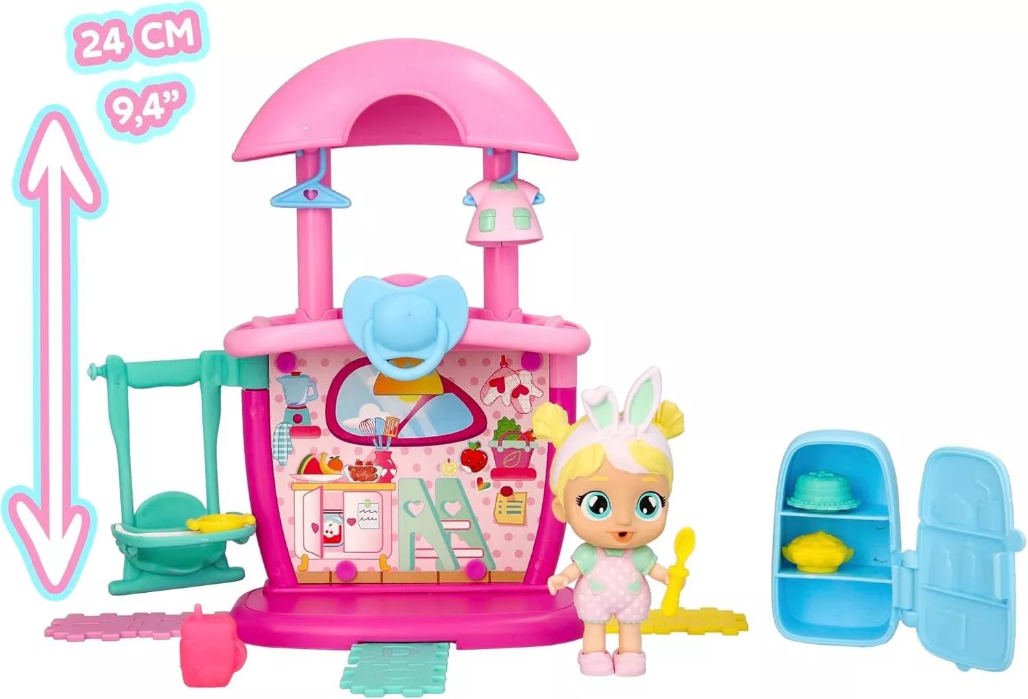 Chloe babával és konyhájával íncsiklandó kalandok várják a gyerekeket. A szett 14 darab kiegészítőt tartalmaz, mint például sütemények, tányér vagy hűtőszekrény. A csomagban egy 9 cm-es Chloe baba is található, ami igazi könnyeket sír, ha megnyomják a hasát.A játék lehetőséget teremt a szerepjátékra, amely során fejlődik a gyerekek képzelete, fantáziája, kreativitása és kommunikációja.