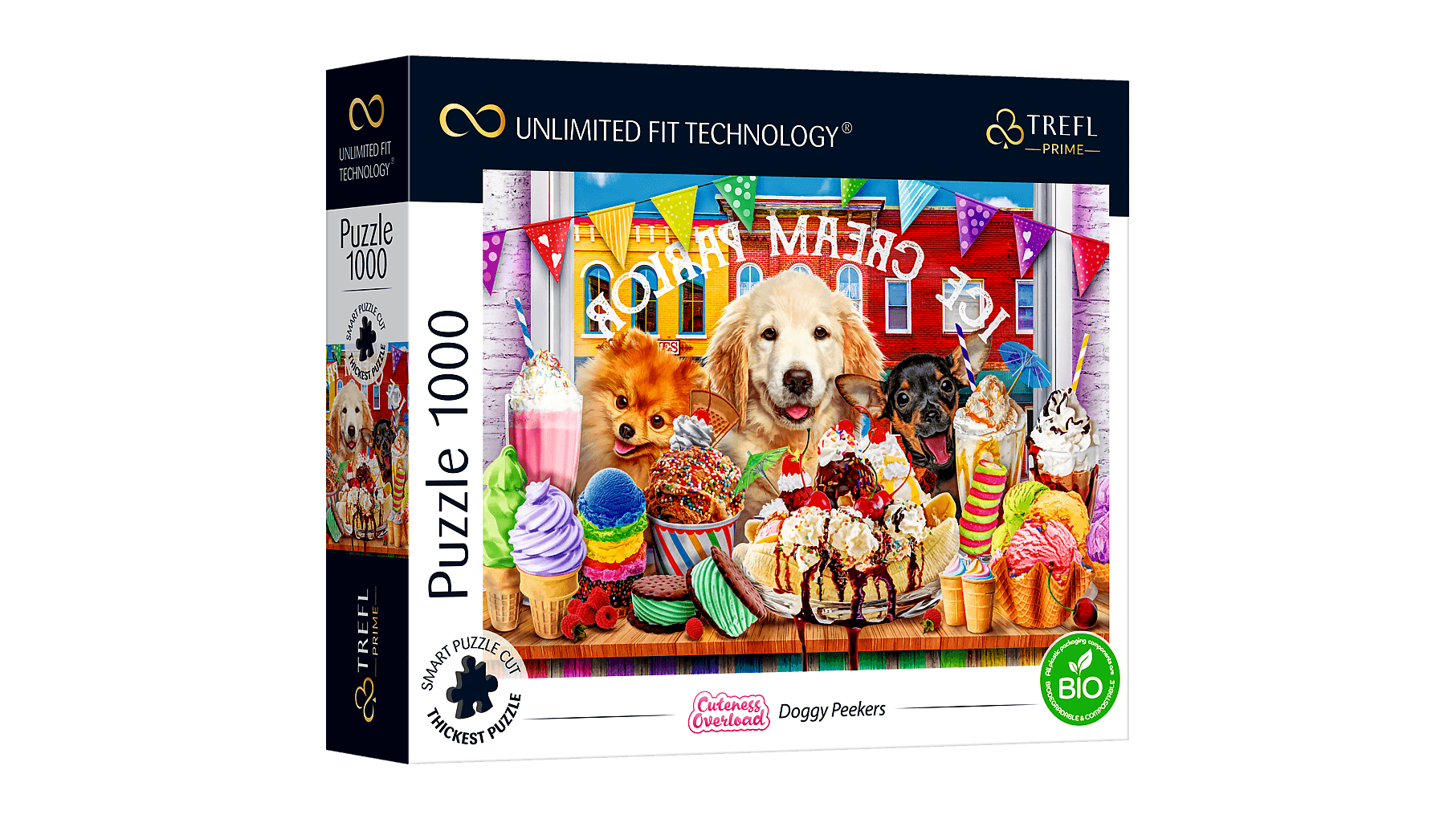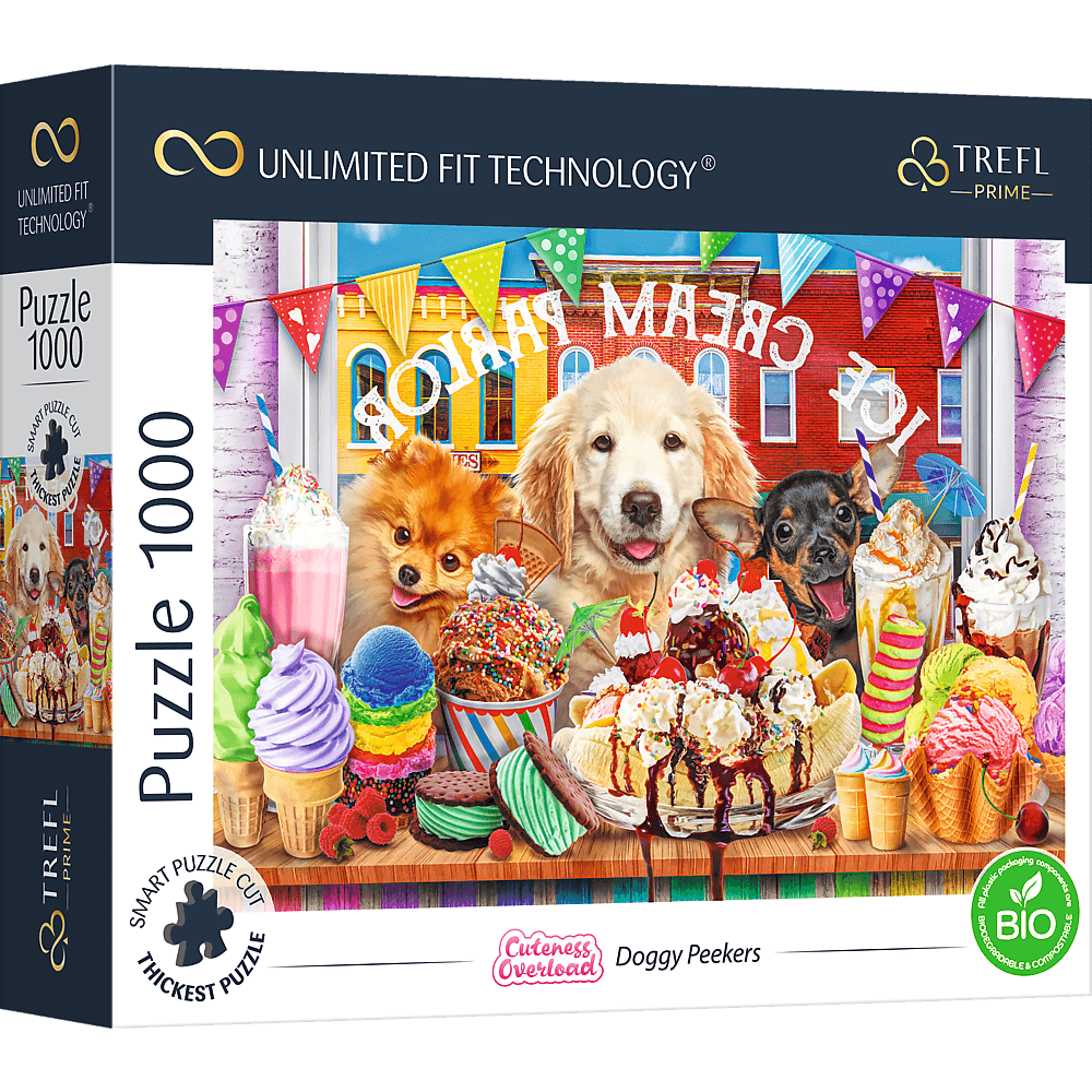 Prémium minőségű, 1000 darabos puzzle, amely cuki kutyákat és finomságokat ábrázol.