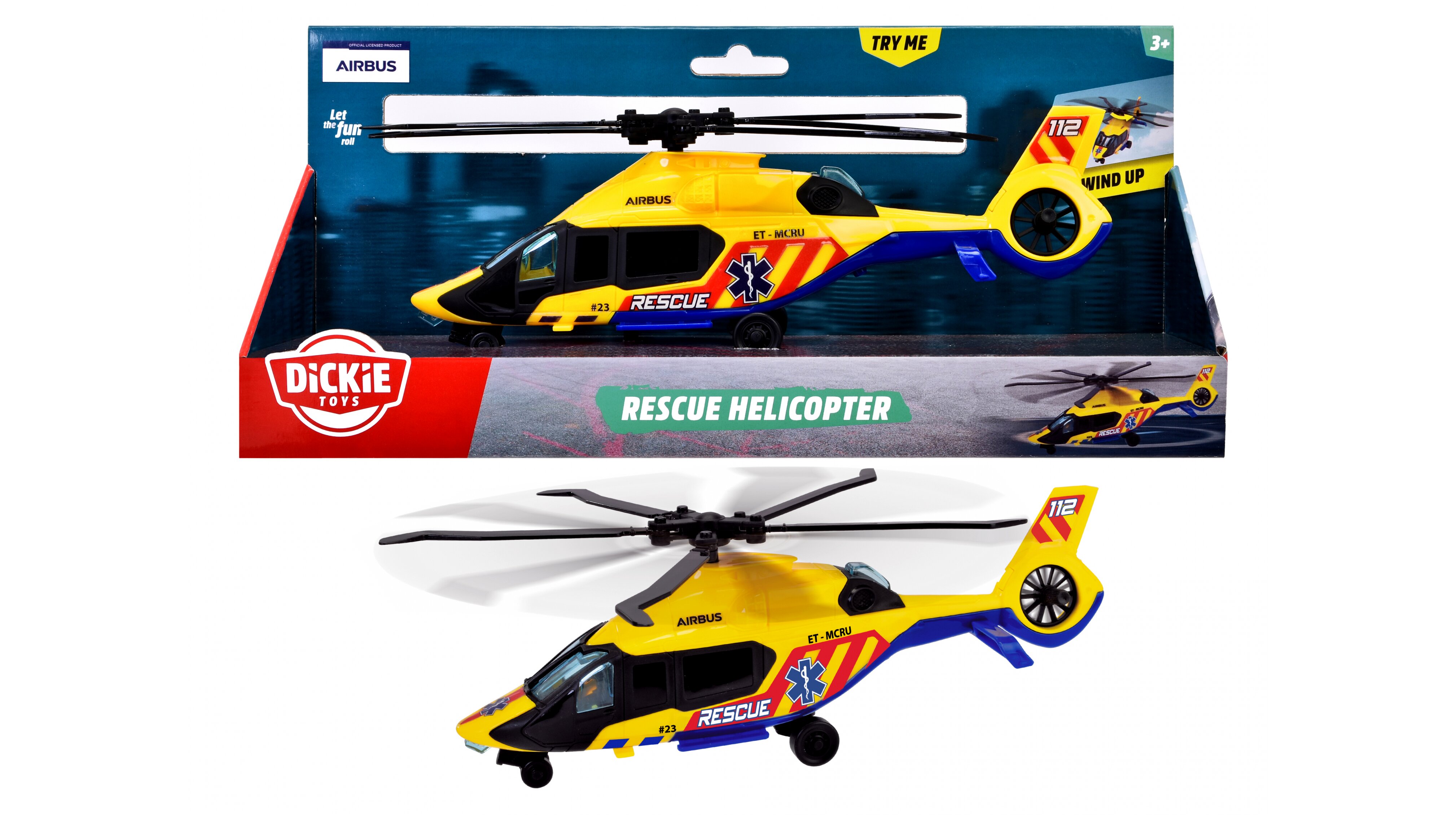 A Dickie Airbus H160 mentőhelikopter megszólalásig hasonlít az igazira. Sárga-kék színeivel a nemzetközi változatot idézi.A gyerekek izgalmas kalandokat élhetnek át játék közben - és ehhez hozzájárul a forgatható propeller, a kézzel forgatható hátsó légcsavar és a gördülő kerekek is.