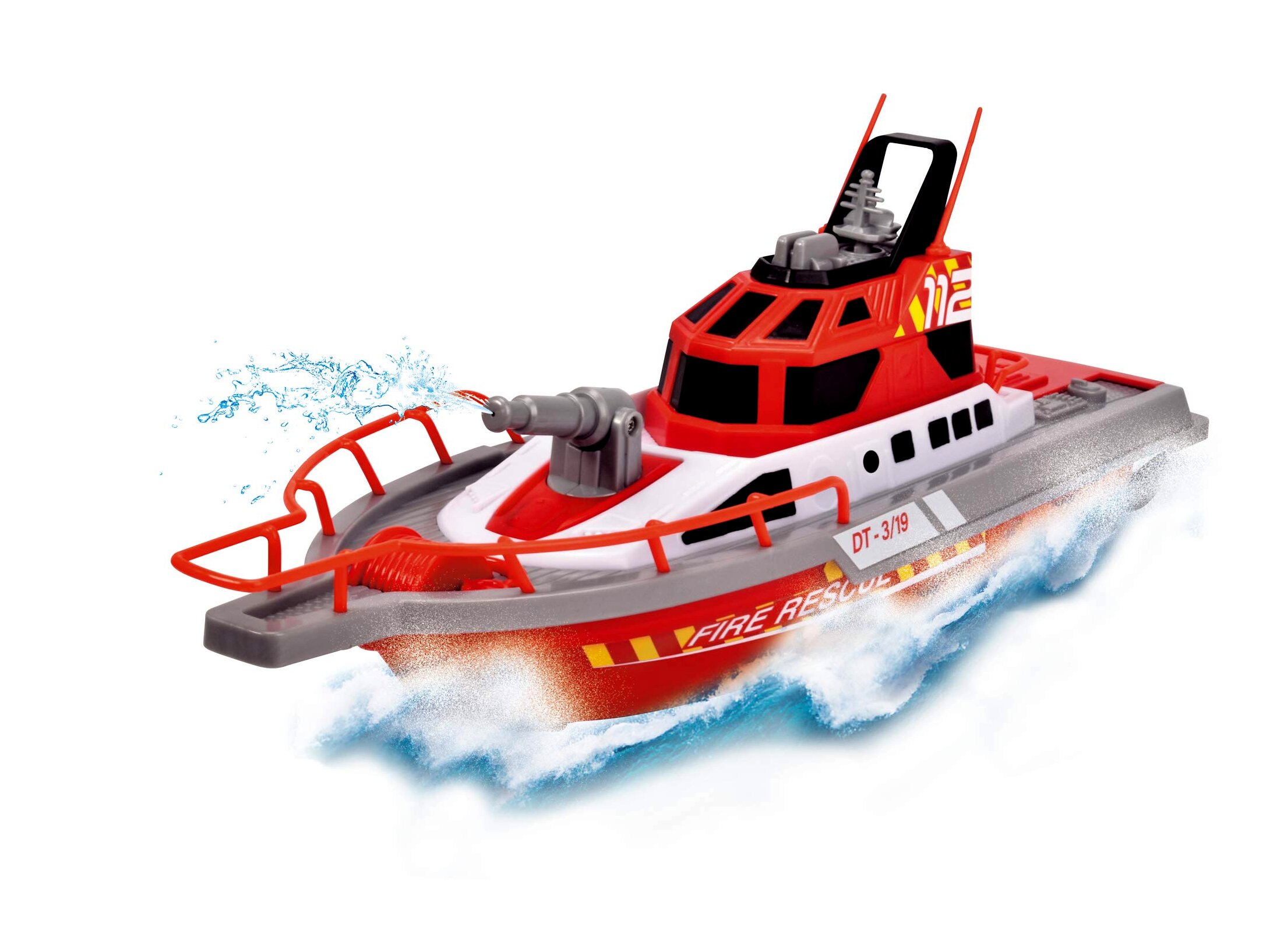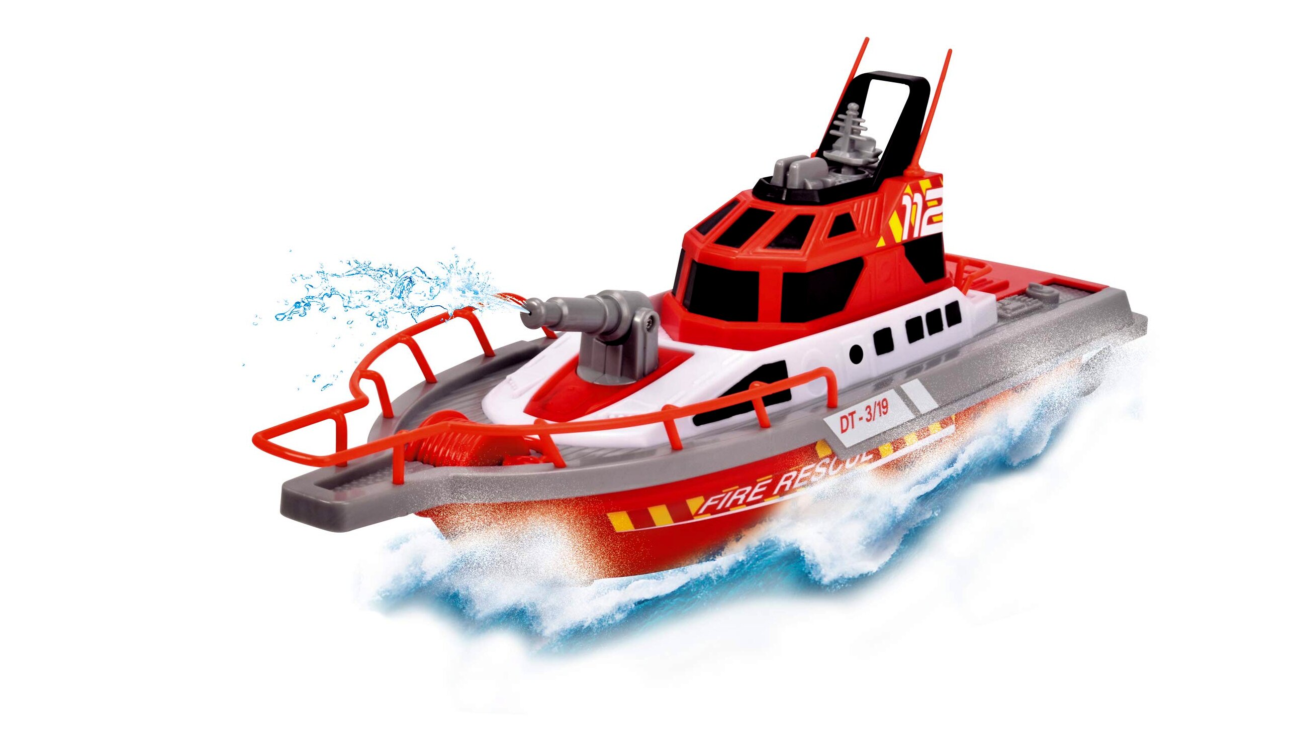 A Dickie Toys RC tűzoltósági hajó teljesen működőképes, sőt valódi irányítható vízágyúval is rendelkezik.
