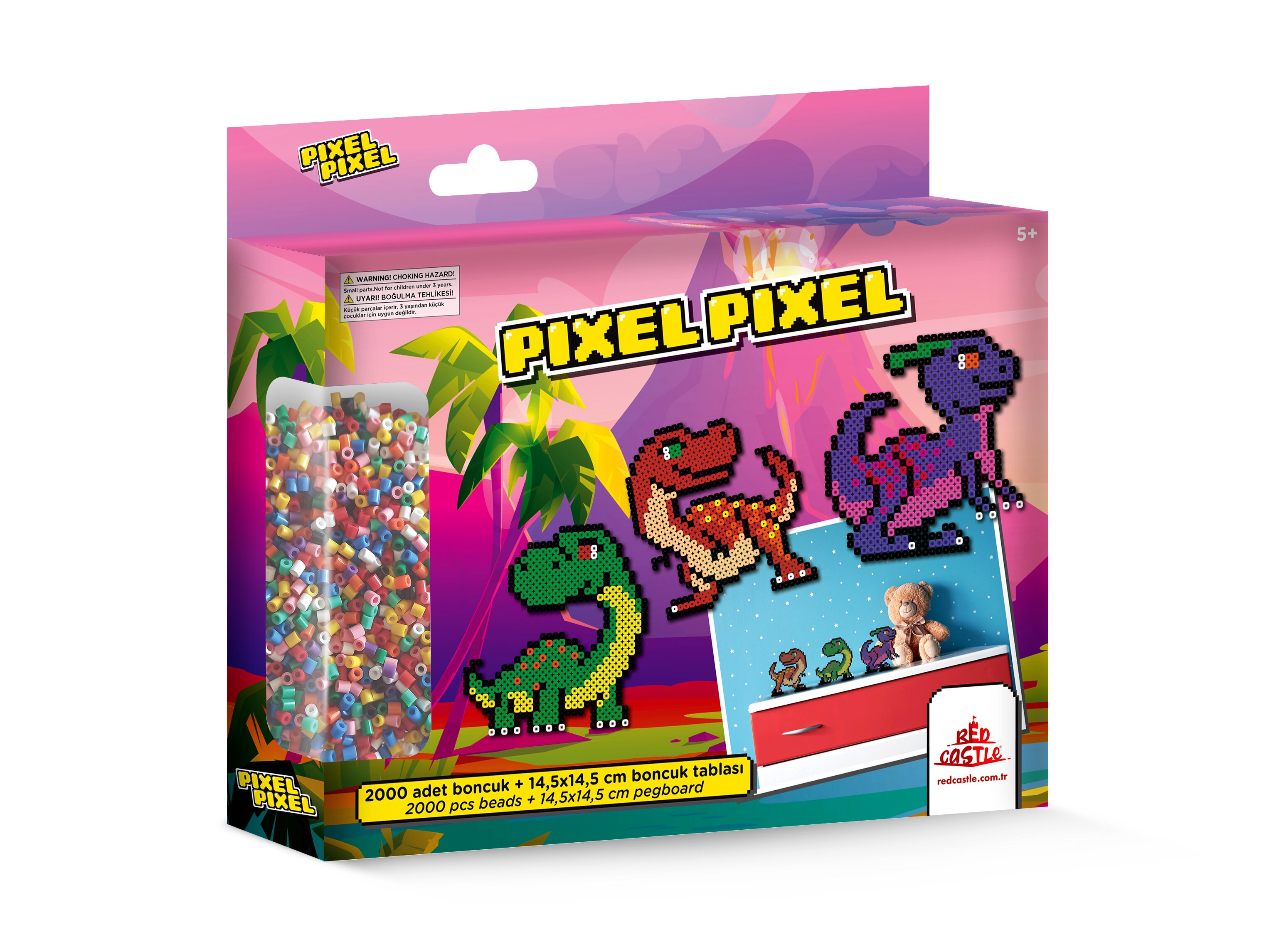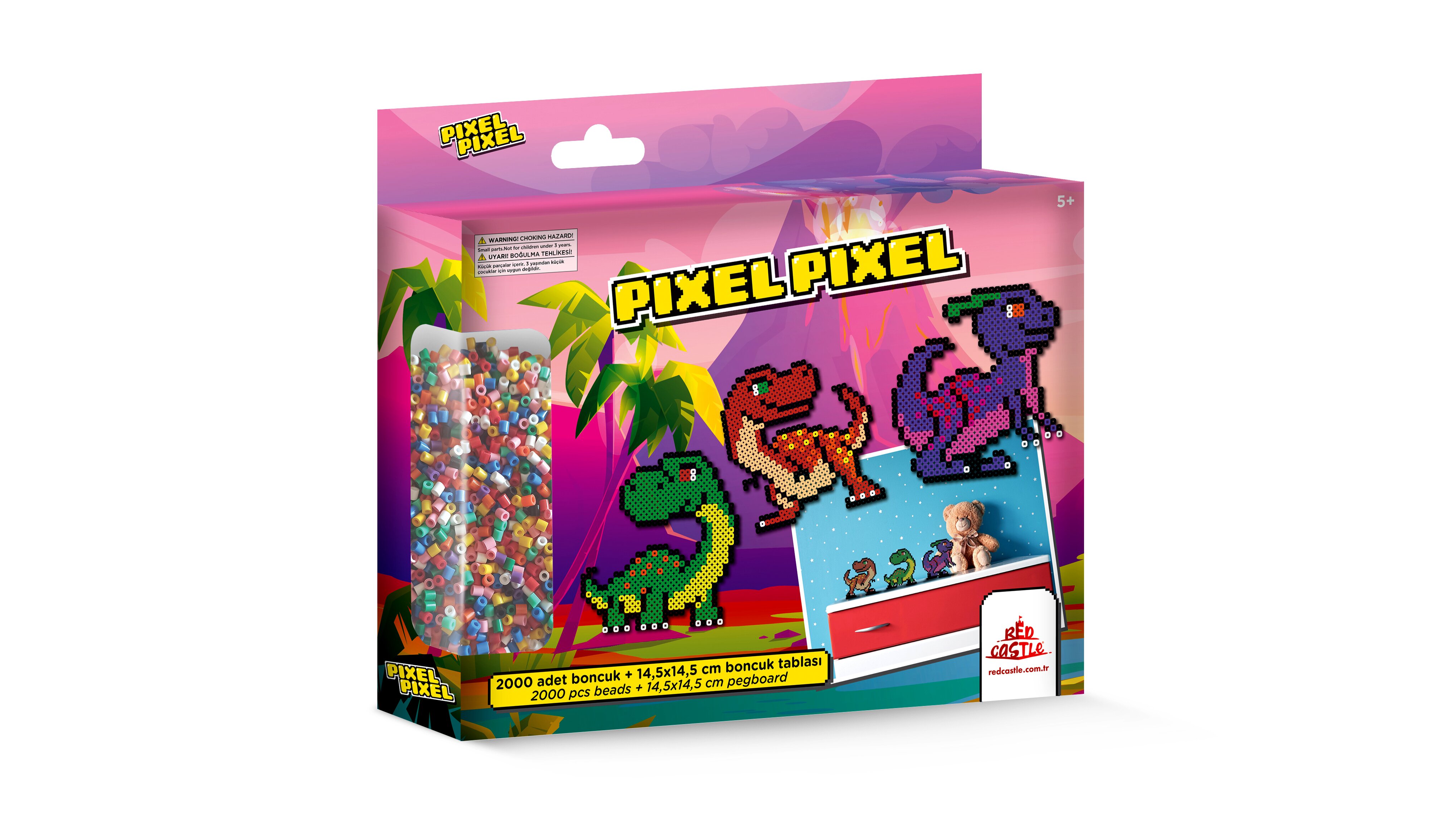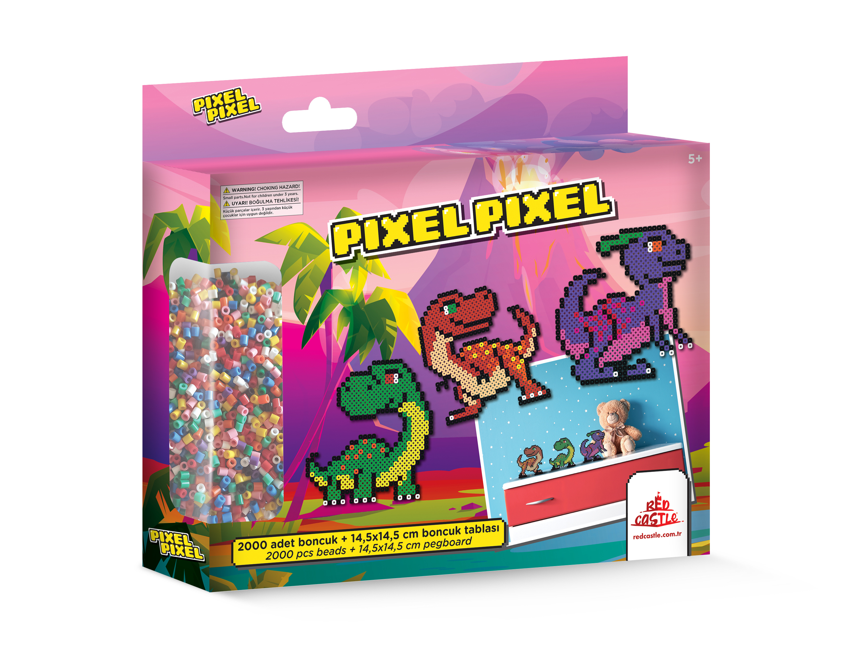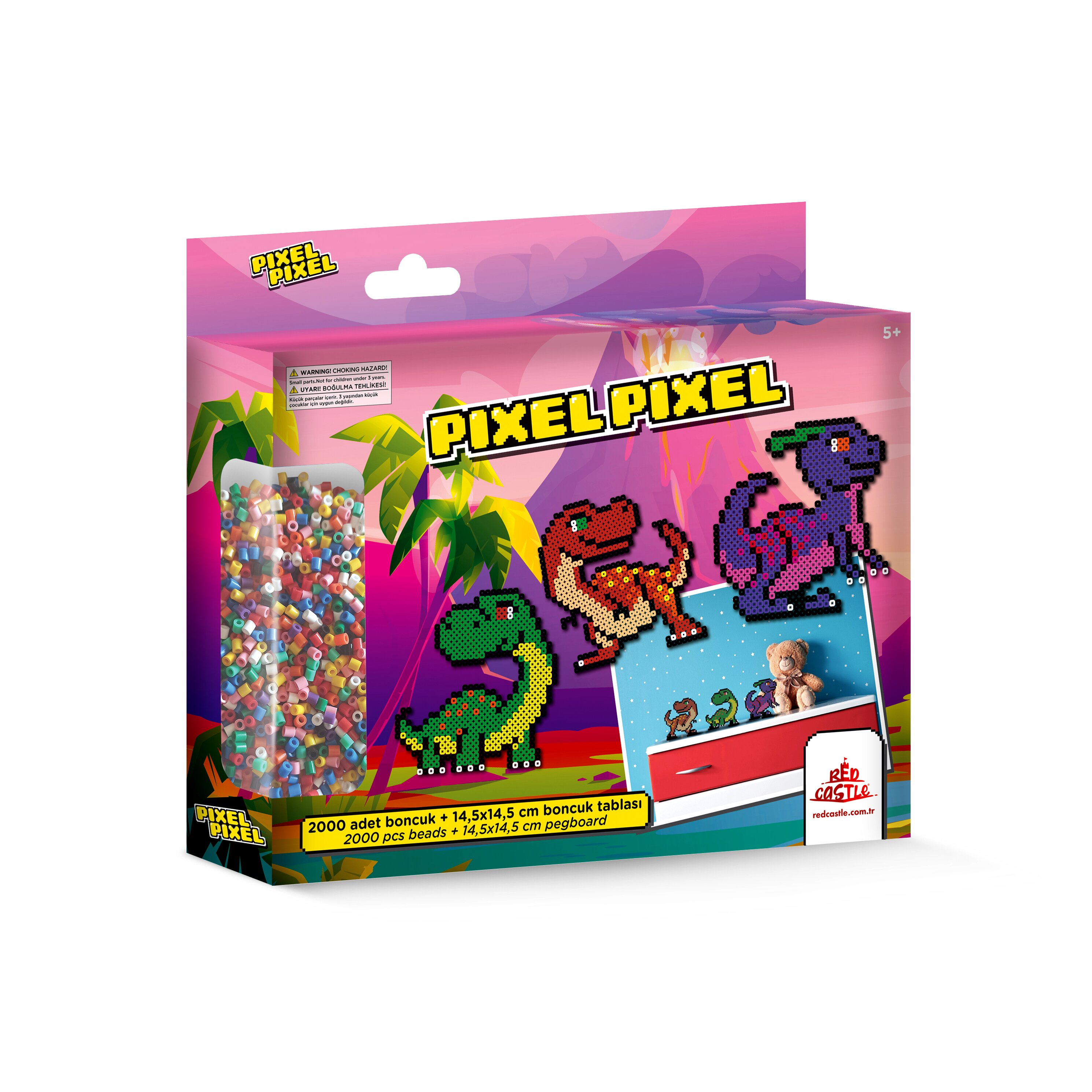 Ez a vasalható gyöngy készlet a dinoszauruszok világába varázsolja el a gyerekeket. A dobozban 2000 darab színes gyöngy található, amiből a gyerekek 3 darab 14,5 x 14,5 cm méretű, kétdimenziós gyöngyképet rakhatnak ki.A technika egyszerű: a tüskés alapok valamelyikére a kicsik elrendezik a megfelelő gyöngyöket, utána pedig felnőtt segítségével a mintára kell helyezni a vasalópapírt. A műanyag gyöngyök a hő hatására máris „összeragadnak". A vasalót nem károsítja a játék.