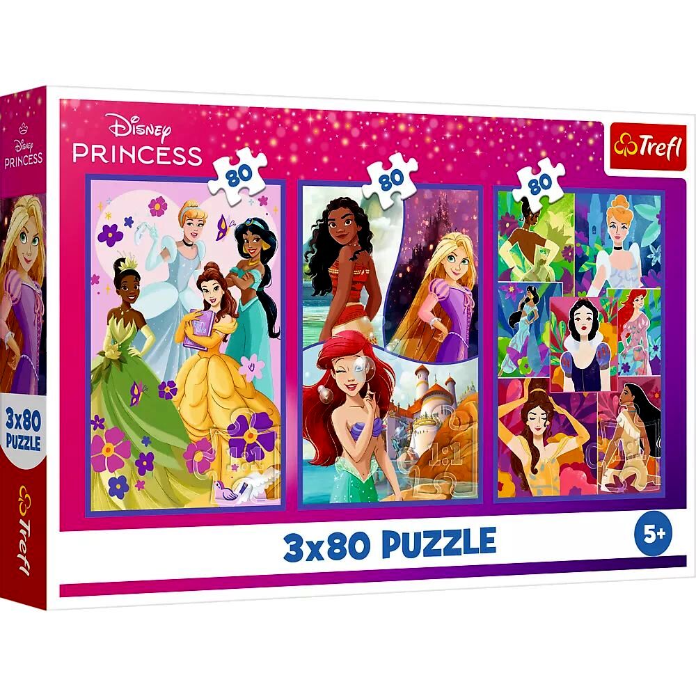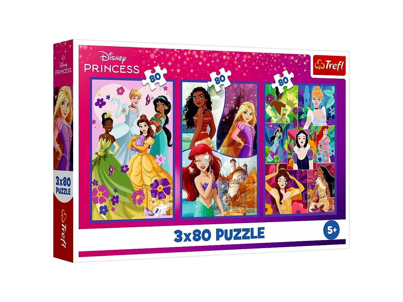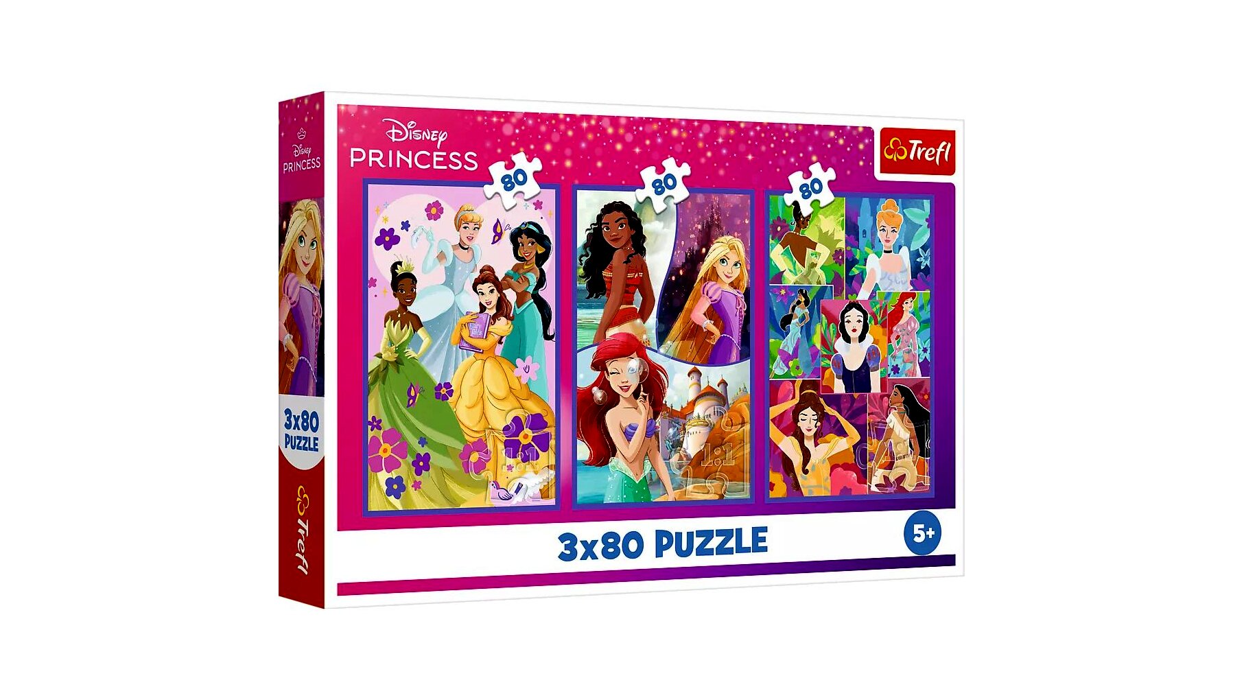 Prémium minőségű, 3 x 80 darabos puzzle a Disney hercegnő rajongóinak. A darabok tökéletesen illeszkednek. Kicsik és nagyok számára egyaránt izgalmas és szórakoztató időtöltés, amelyet egyszerűen képtelenség megunni. A puzzle szétszedhető, majd újra összerakható, ha pedig összeragasztjuk a darabokat, bekeretezve akár a szoba dísze is lehet.A puzzle játékok nem csak a memóriát, a megfigyelő- és a koncentrációs képességet fejlesztik, türelemre és kitartásra is tanítanak.
