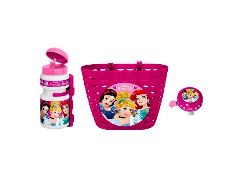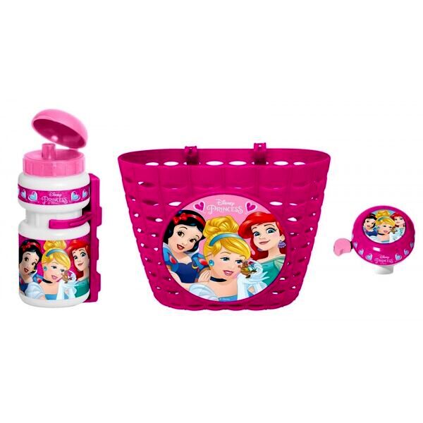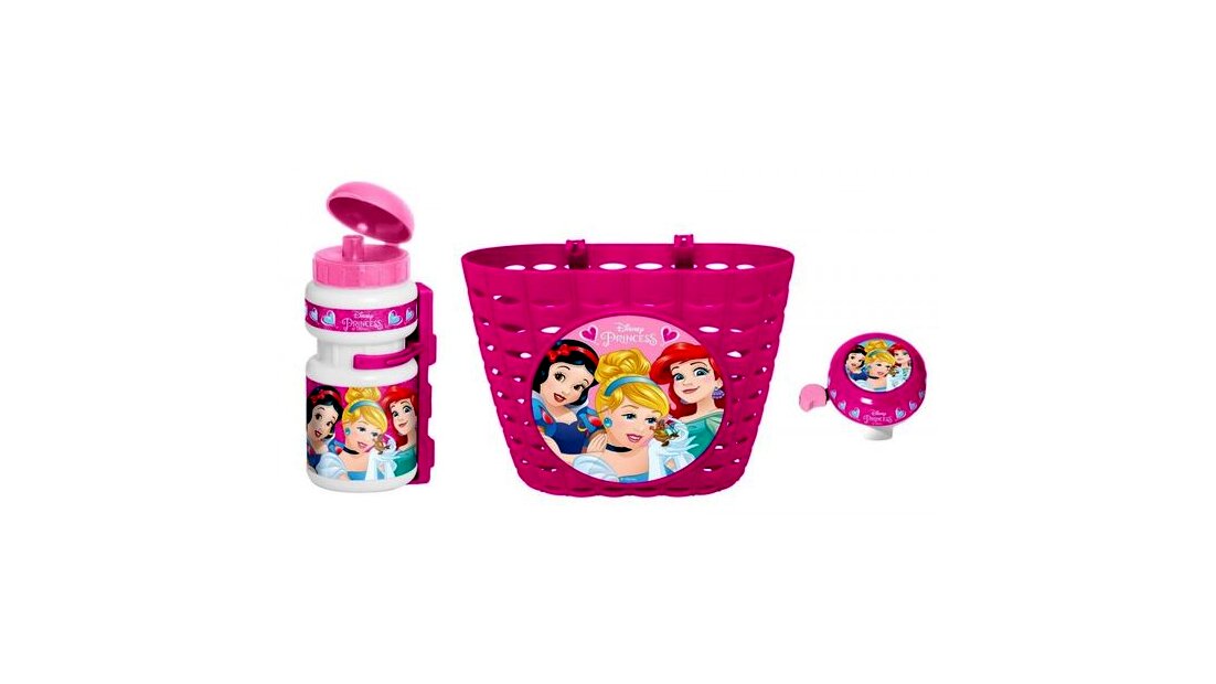 A Disney hercegnők tematikájú biciklis kiegészítő szett praktikus alapfelszerelés gyerek kerékpárra: a kulacs segít útközben inni, a csengő a jelzésben, a kormányra rögzíthető kosár pedig a kisebb holmik szállításában.