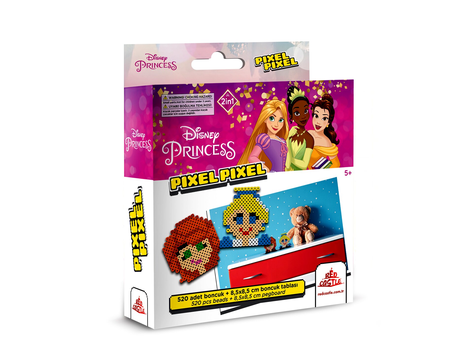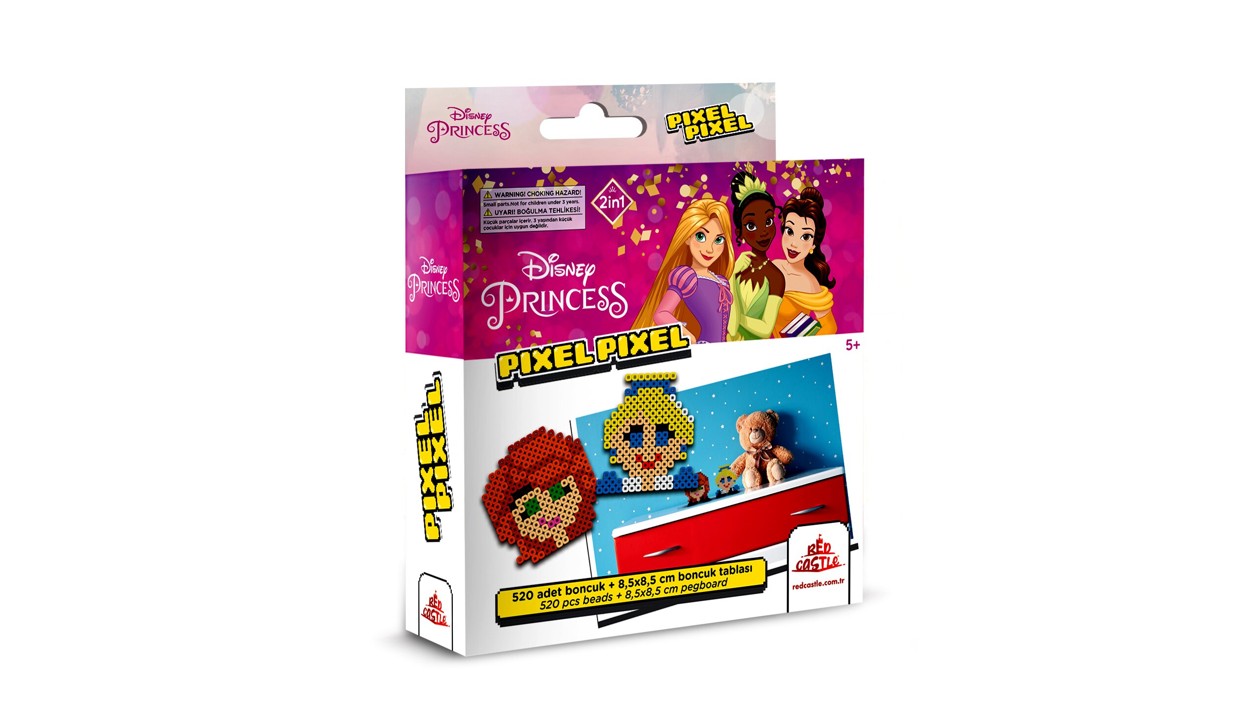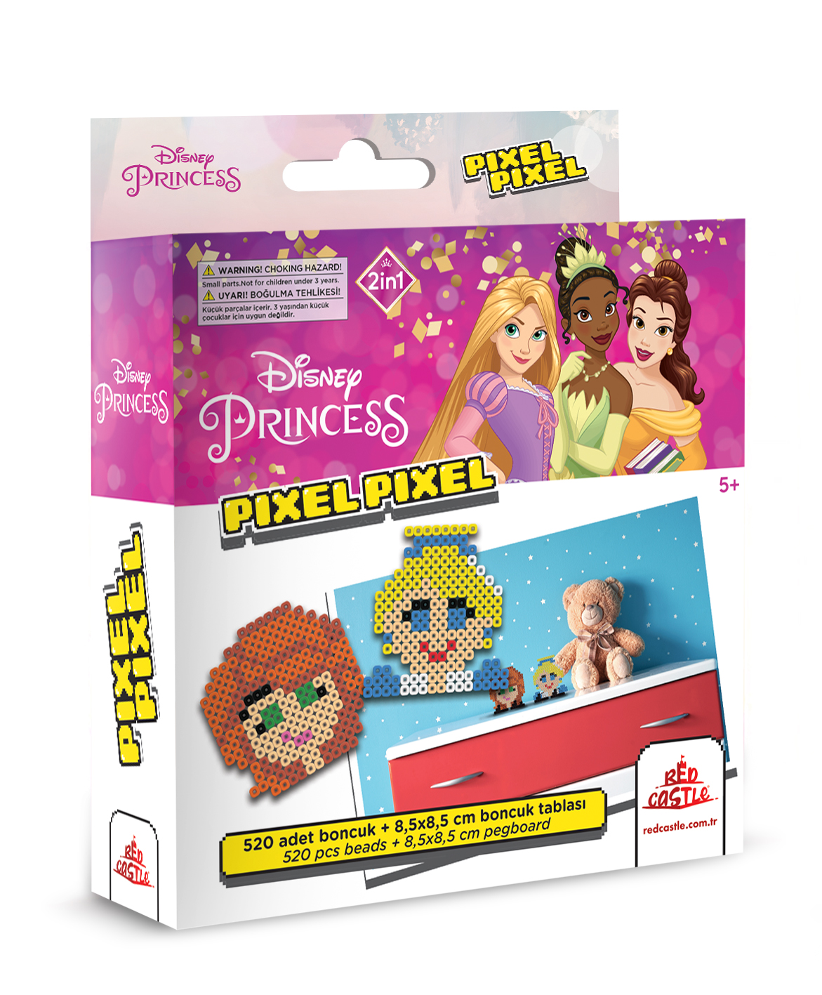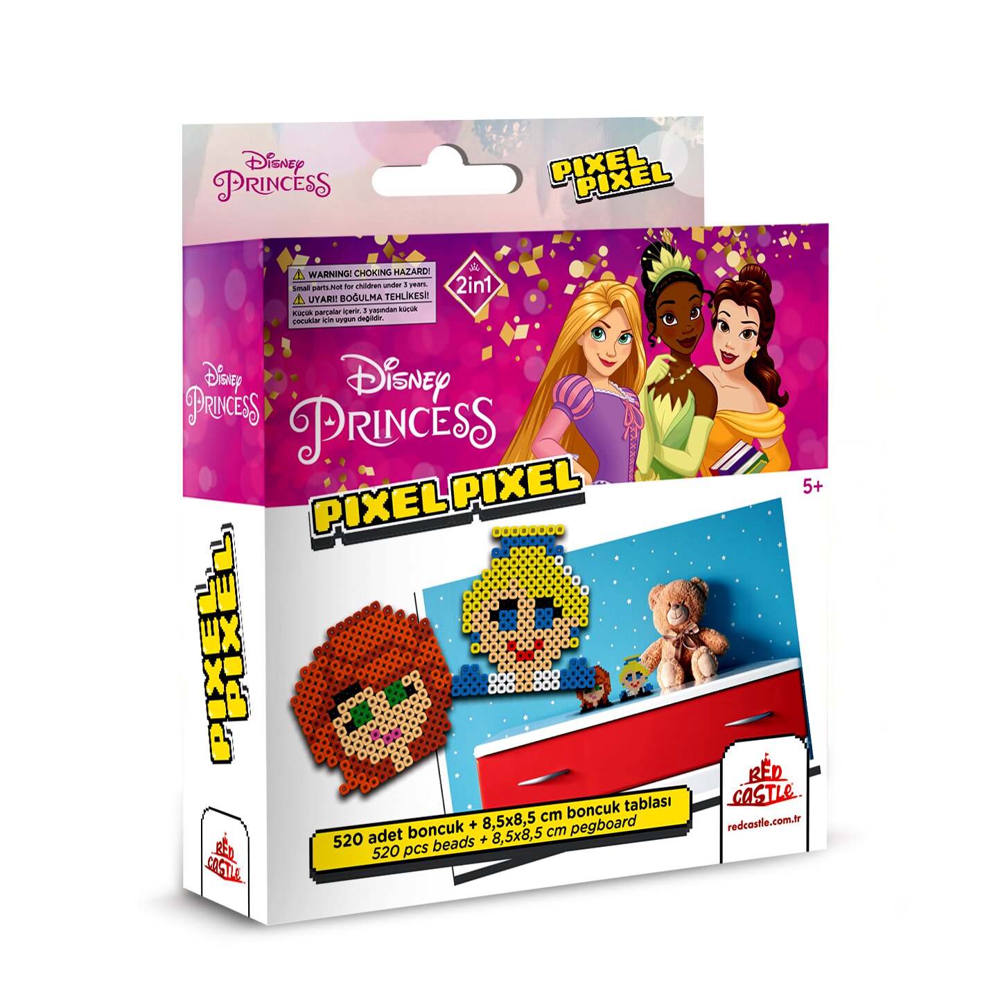 Ez a vasalható gyöngy készlet a Disney hercegnők világába varázsolja el a gyerekeket. A dobozban sok-sok színes gyöngy található, amiből a gyerekek 2 darab 8,5 x 8,5 cm méretű, kétdimenziós gyöngyképet rakhatnak ki.A technika egyszerű: a tüskés alapok valamelyikére a kicsik elrendezik a megfelelő gyöngyöket, utána pedig felnőtt segítségével a mintára kell helyezni a vasalópapírt. A műanyag gyöngyök a hő hatására máris „összeragadnak". A vasalót nem károsítja a játék.