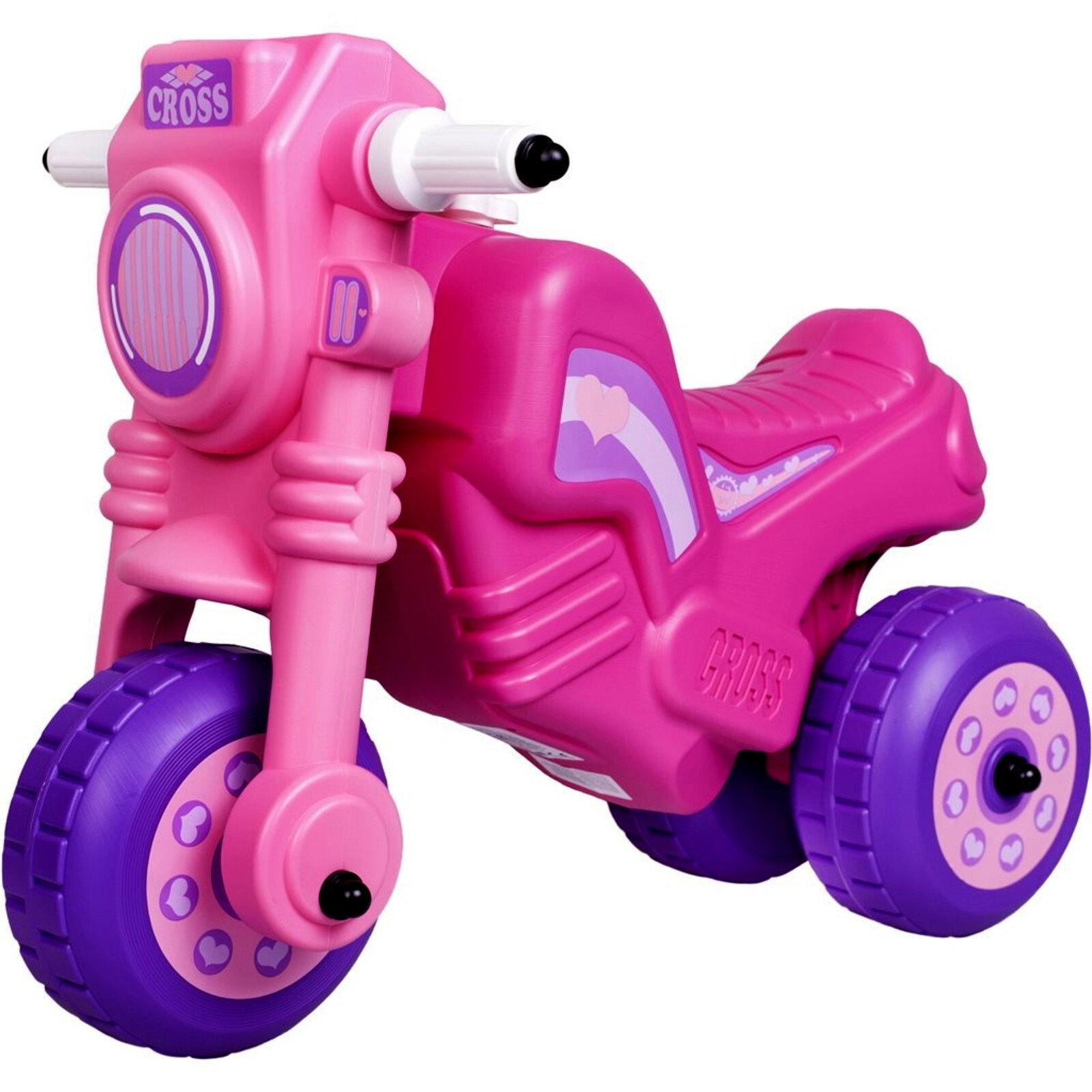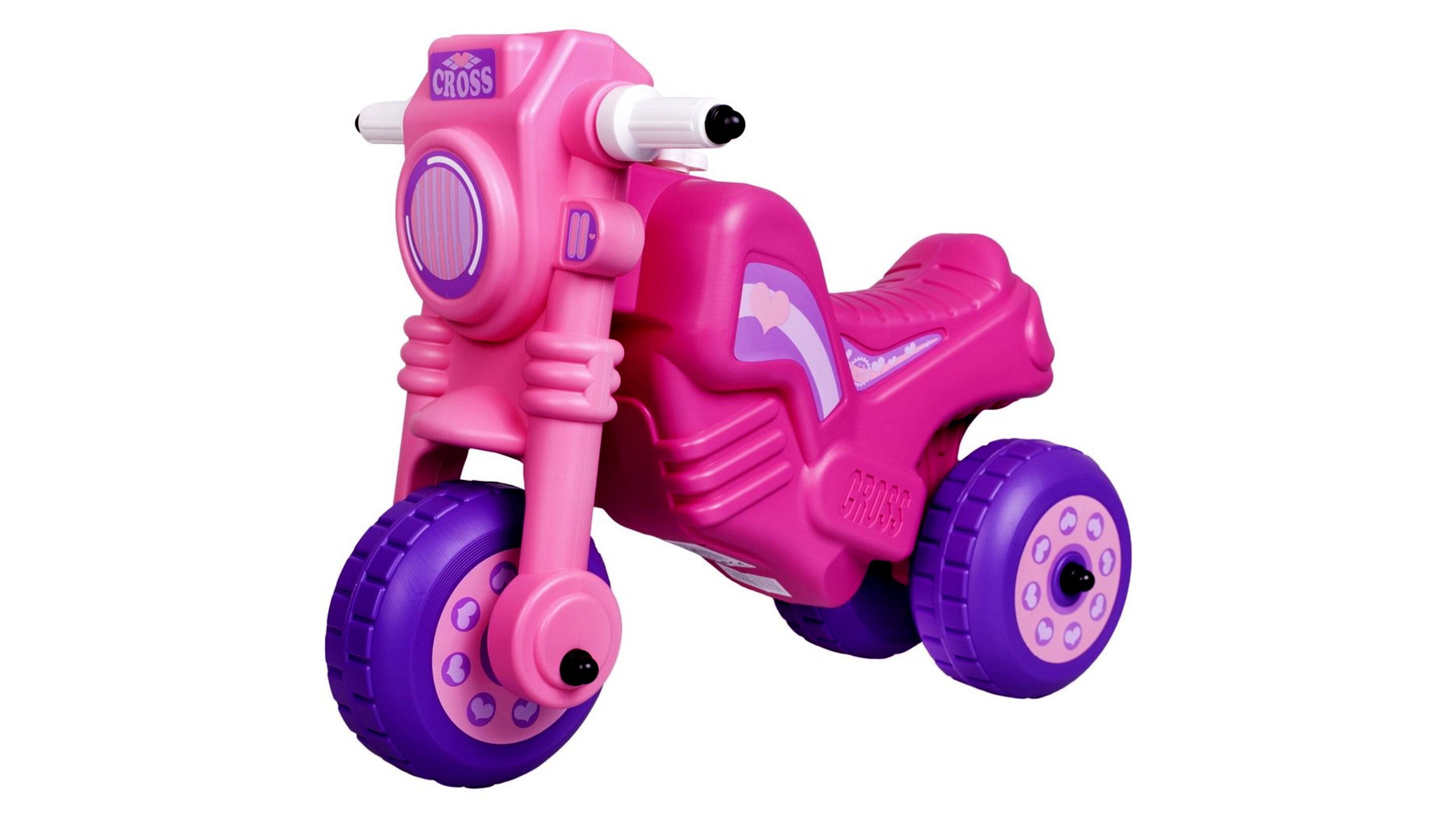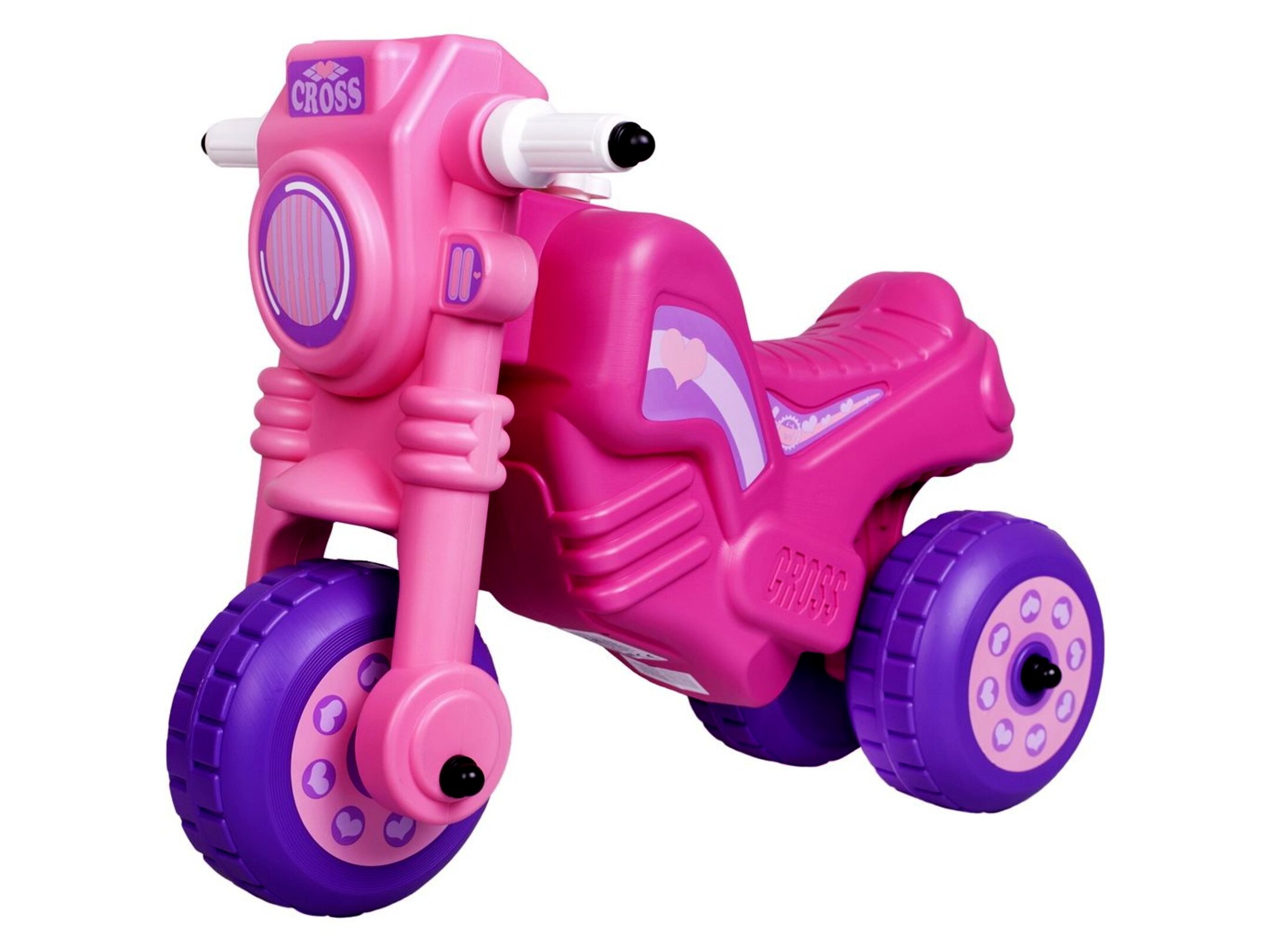 Vagány, egyszerű felépítésű, műanyagból készült, pink, lábbal hajtós kismotor.