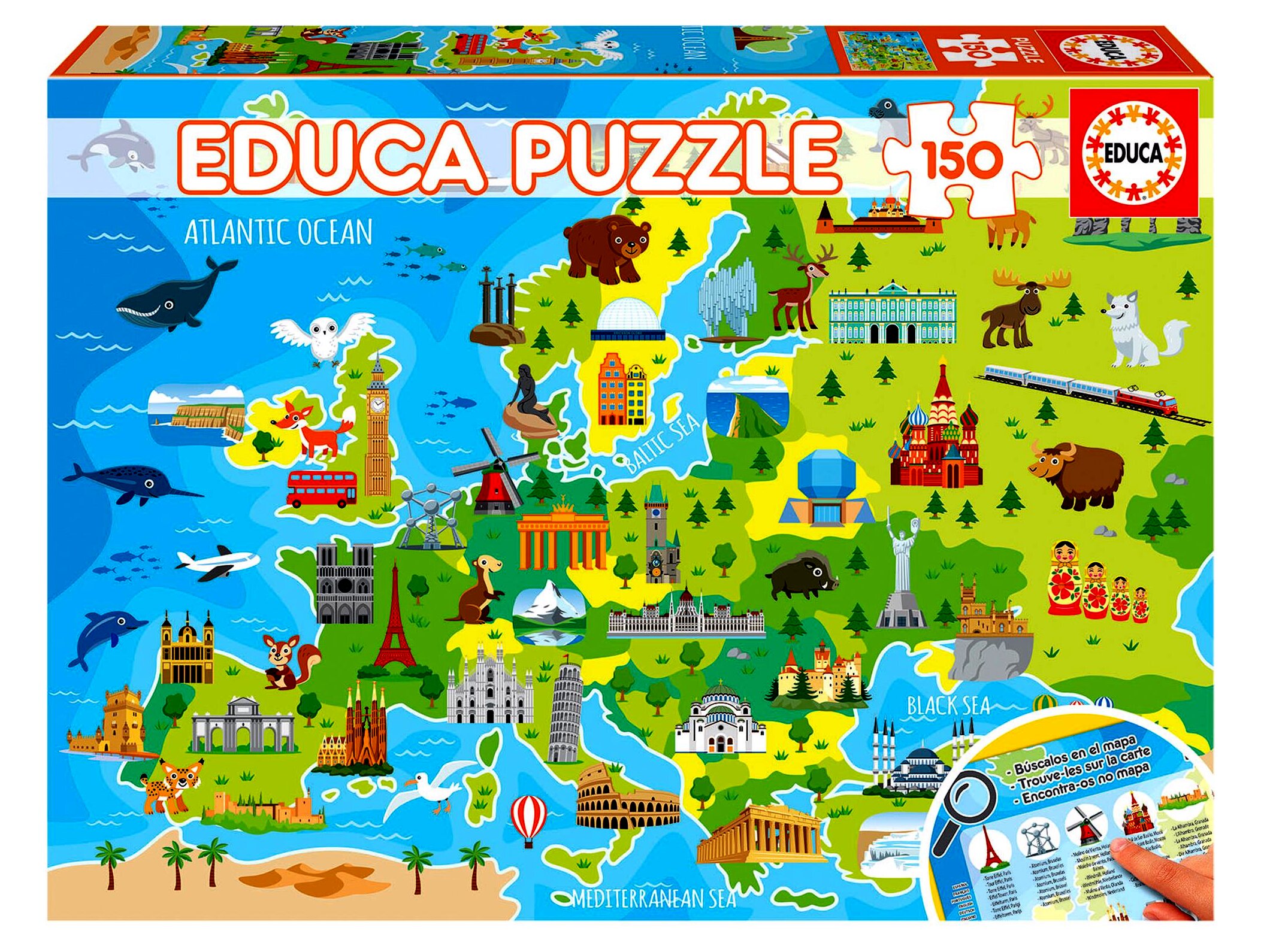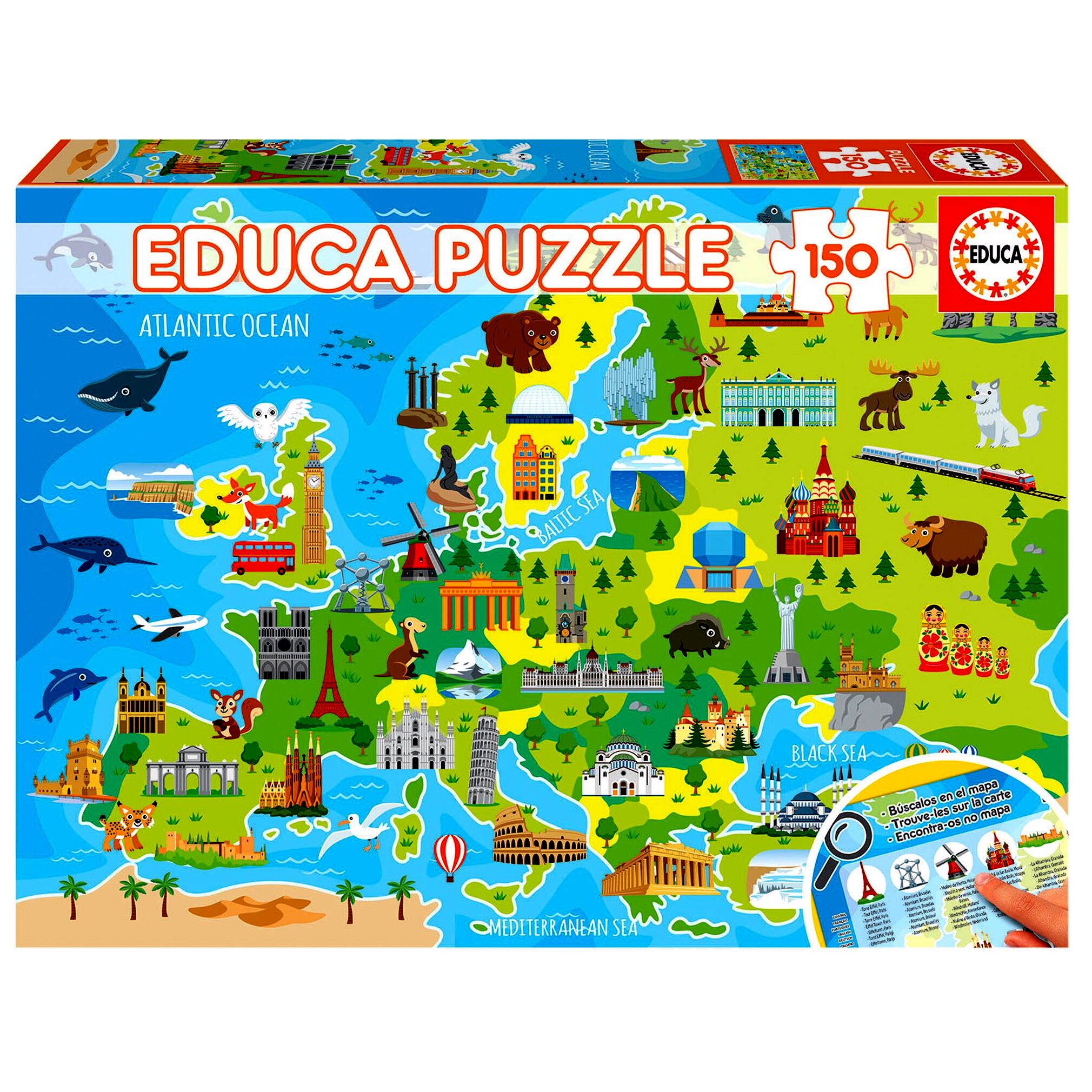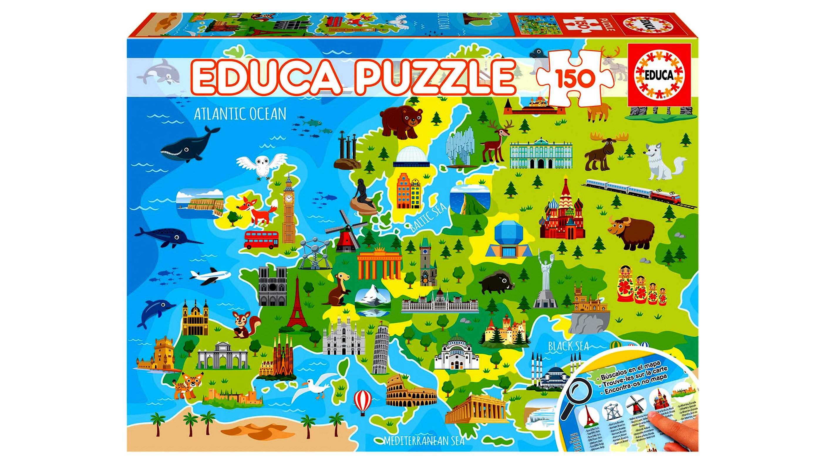 Kiváló minőségű Európát és nevezetességeit ábrázoló, 150 darabos Educa puzzle. A kirakós kiválóan fejleszti a kombinatív képességet és a finommotorikus képességeket.